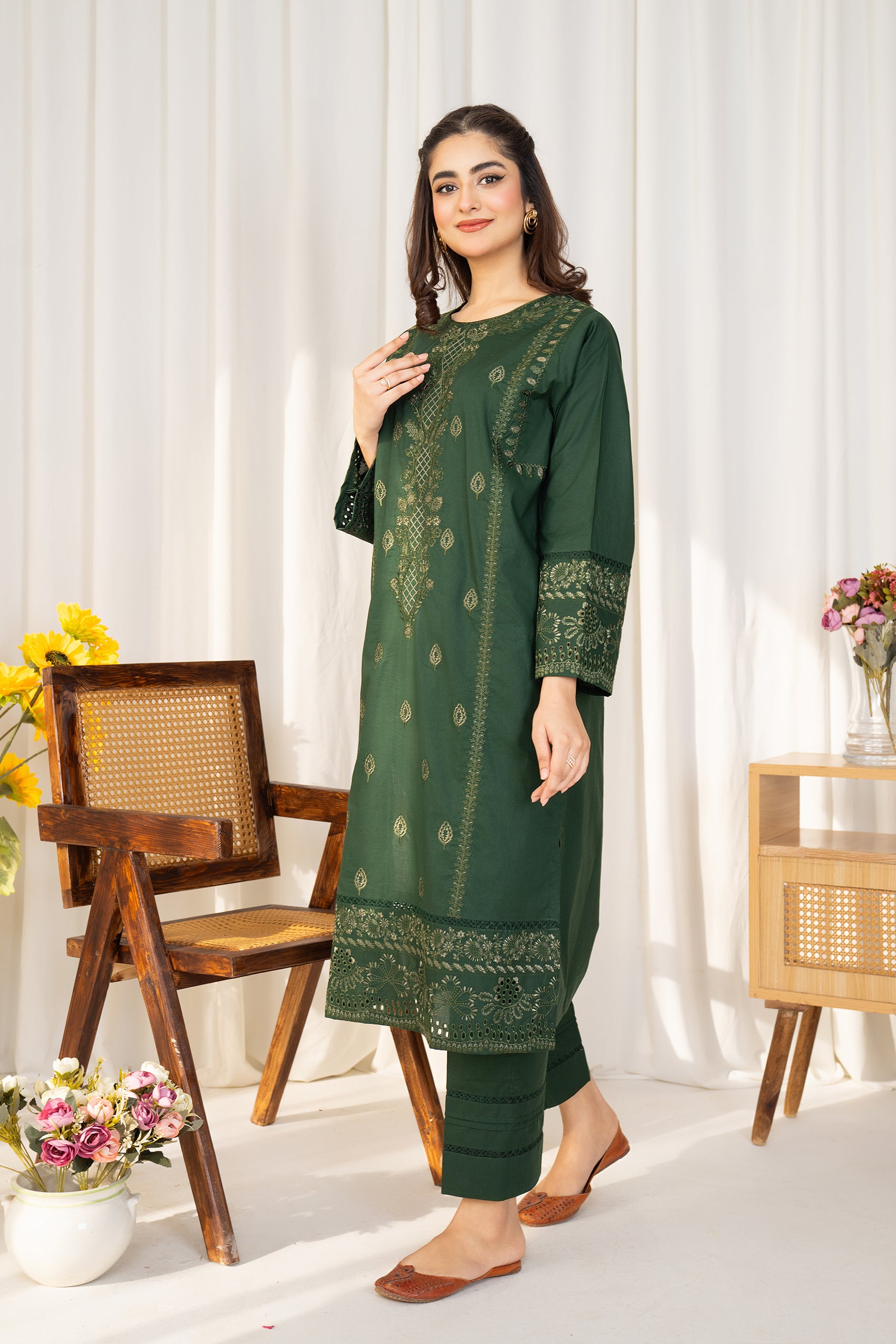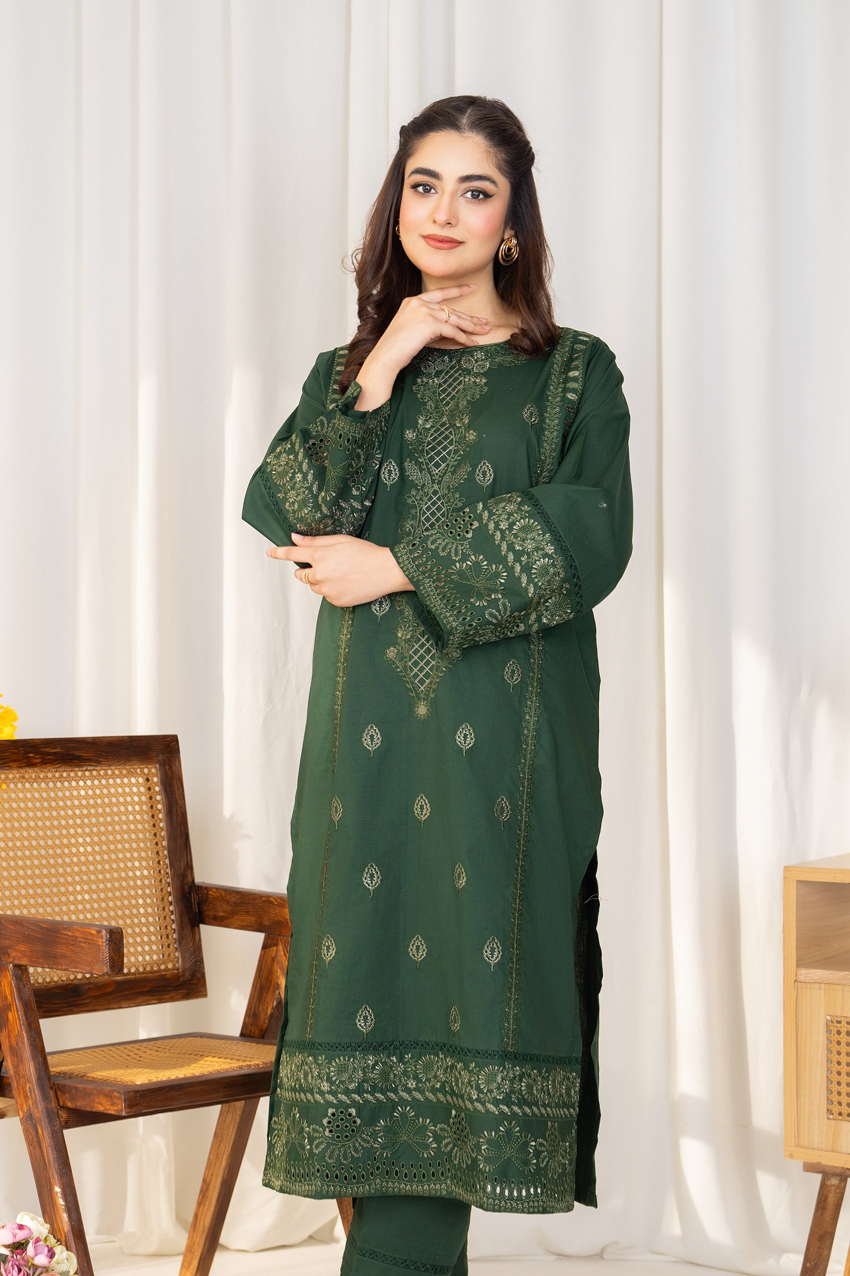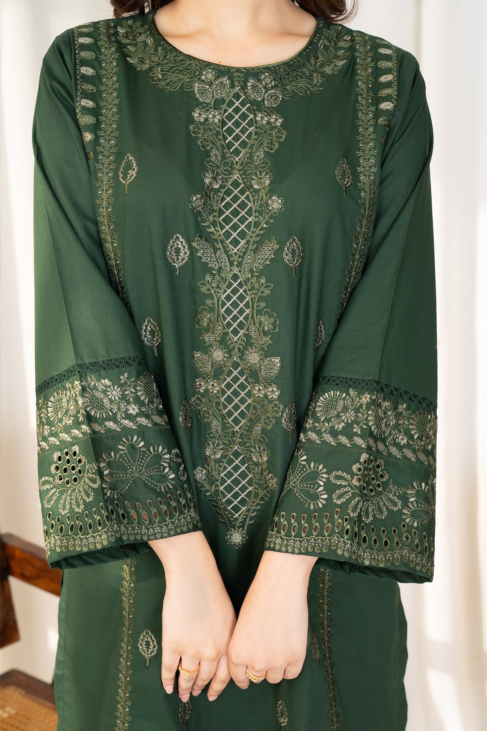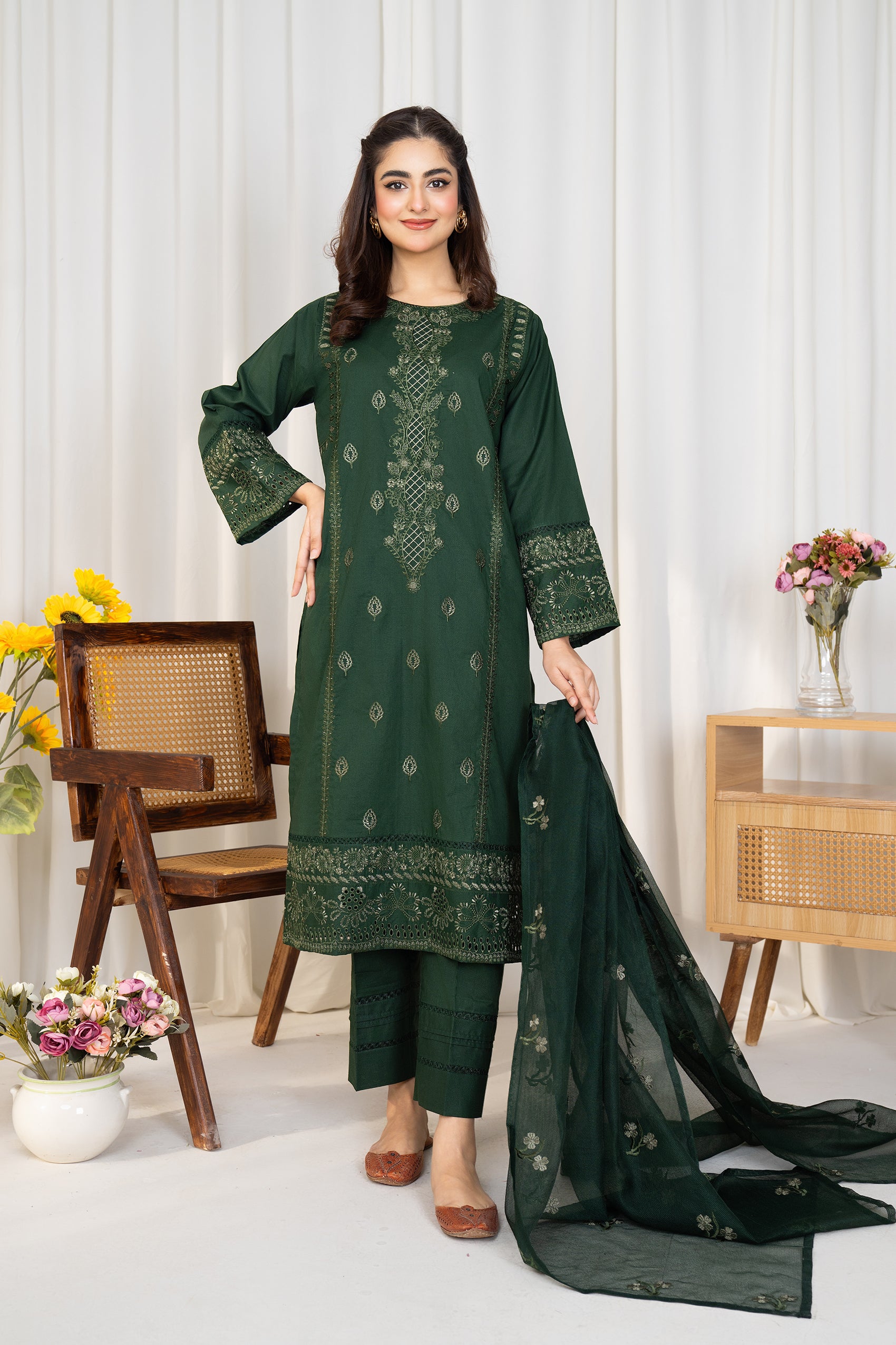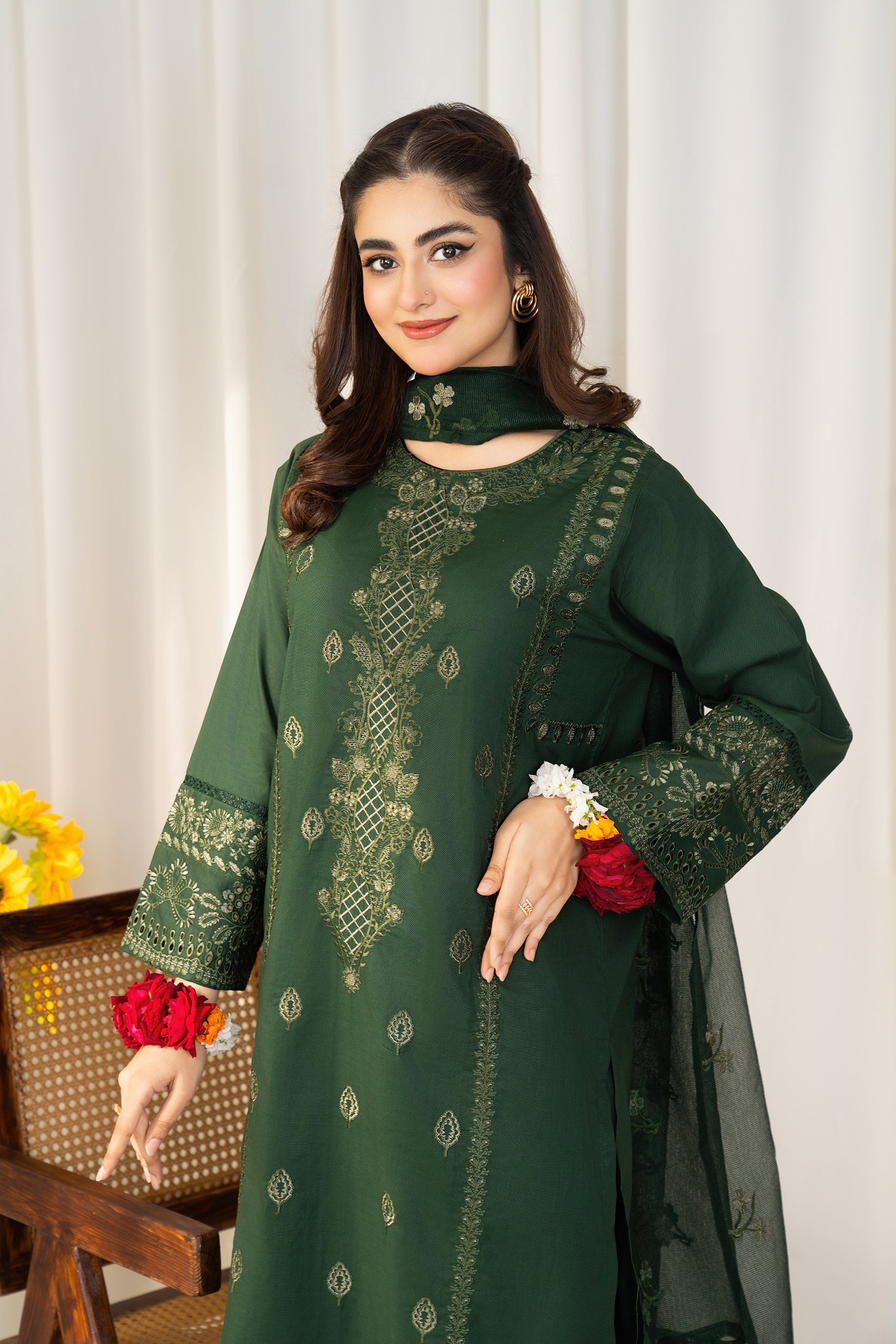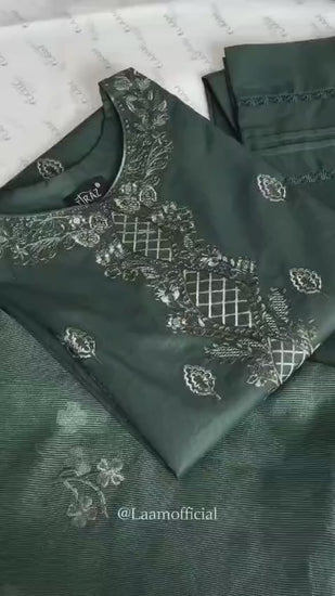 Experience elegance with our exquisite bottle green Aabroo. This eid collection piece features bottle green - embroidered shirt, trouser has plettes and beautiful lace added to enhance the design with embroidered cotton net dupatta.