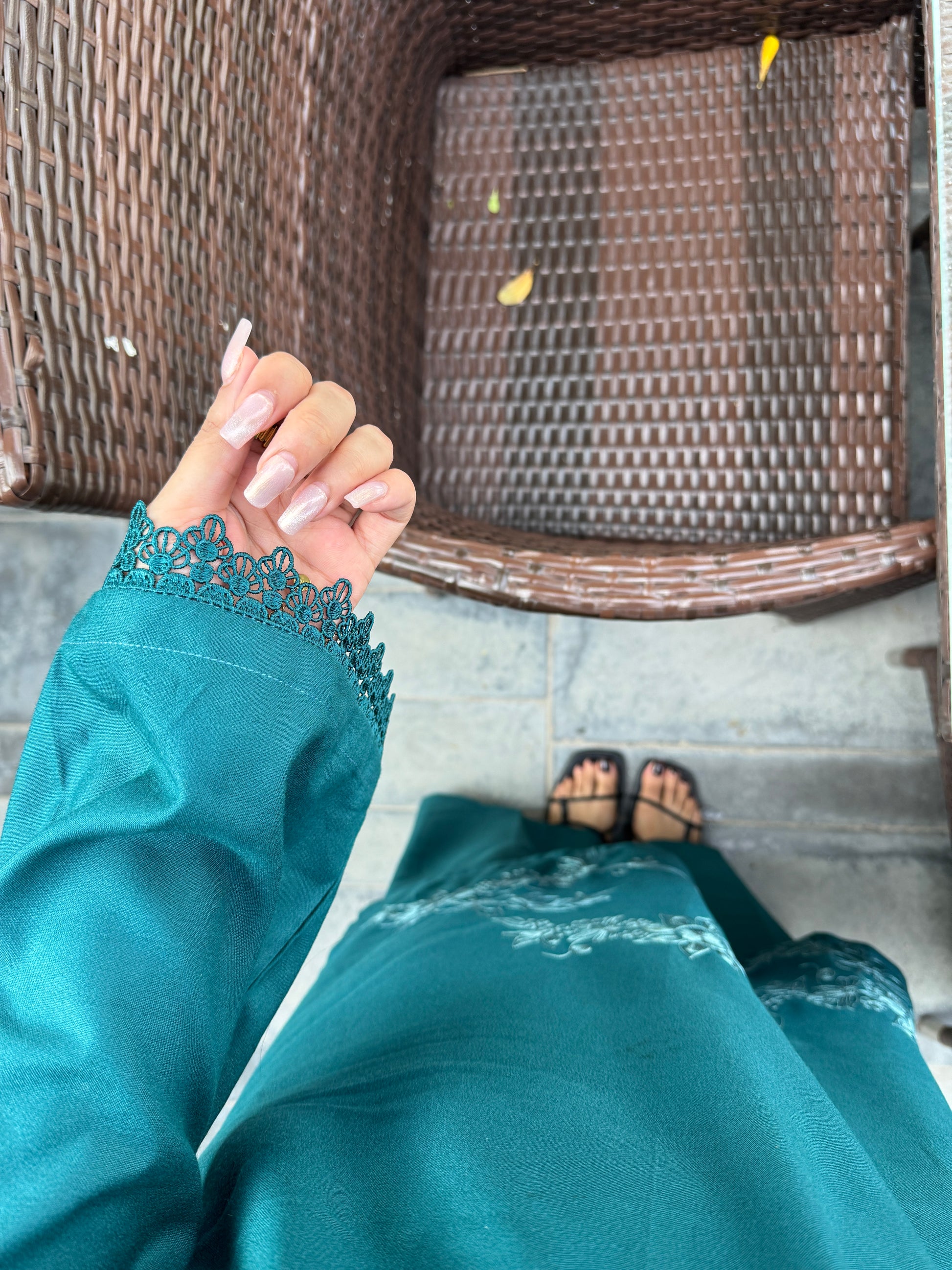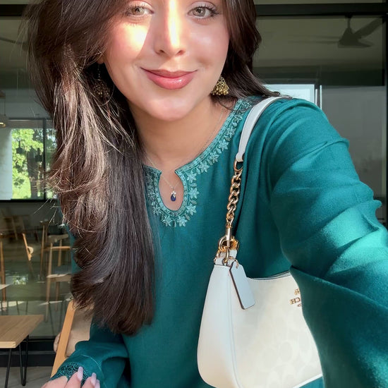 Experience style with our zinc ensemble. This winter collection piece features short shirt with wide leg trouser. It has embroidery on the hem and neckline of the shirt. Perfect for winter nightouts.