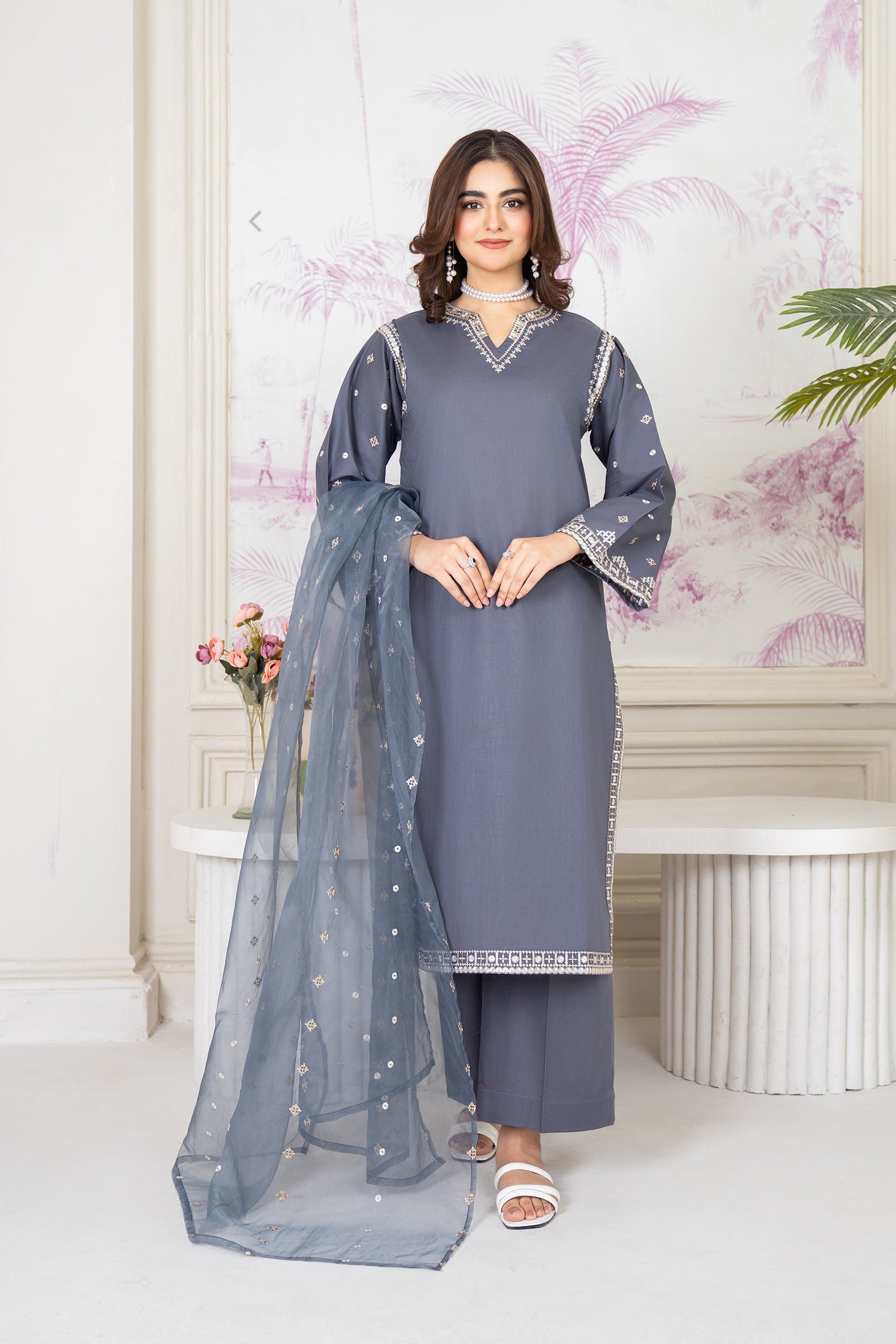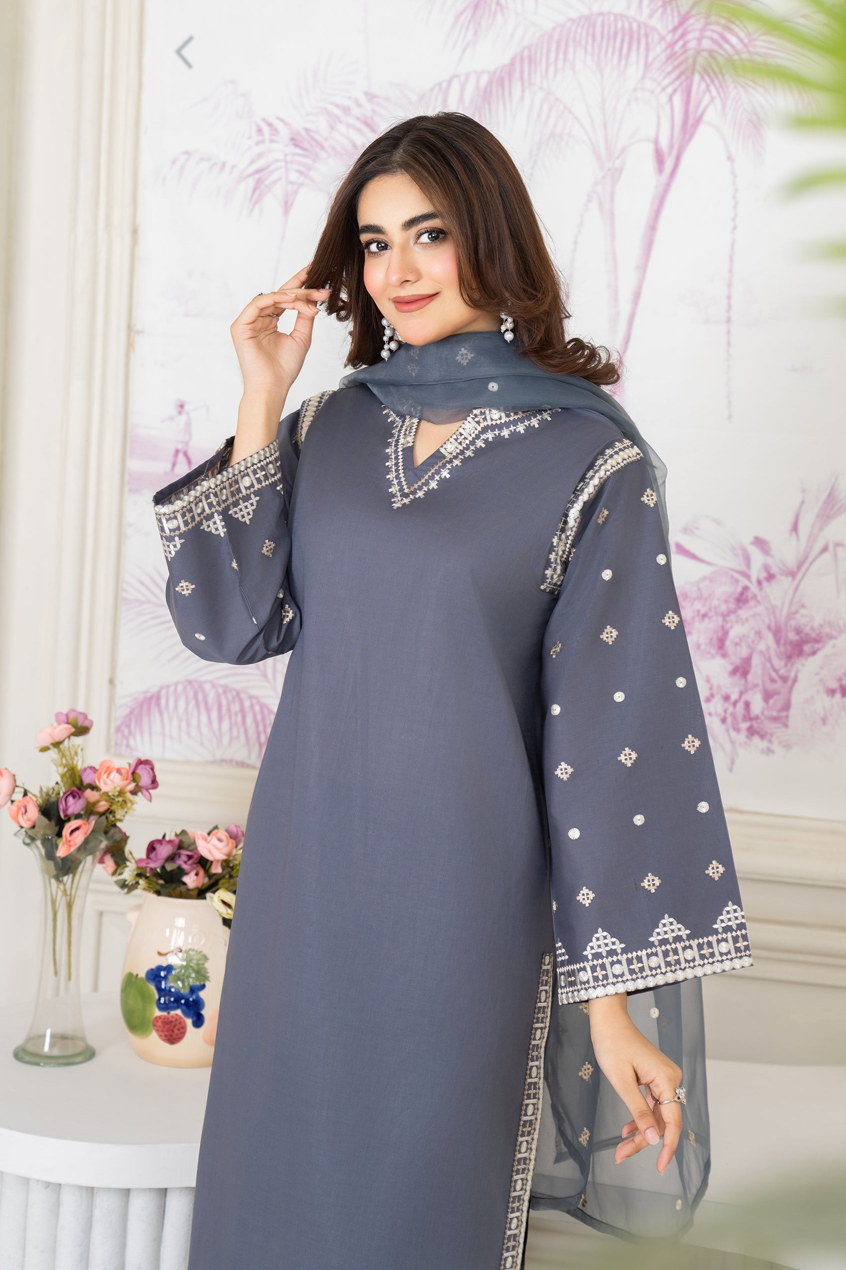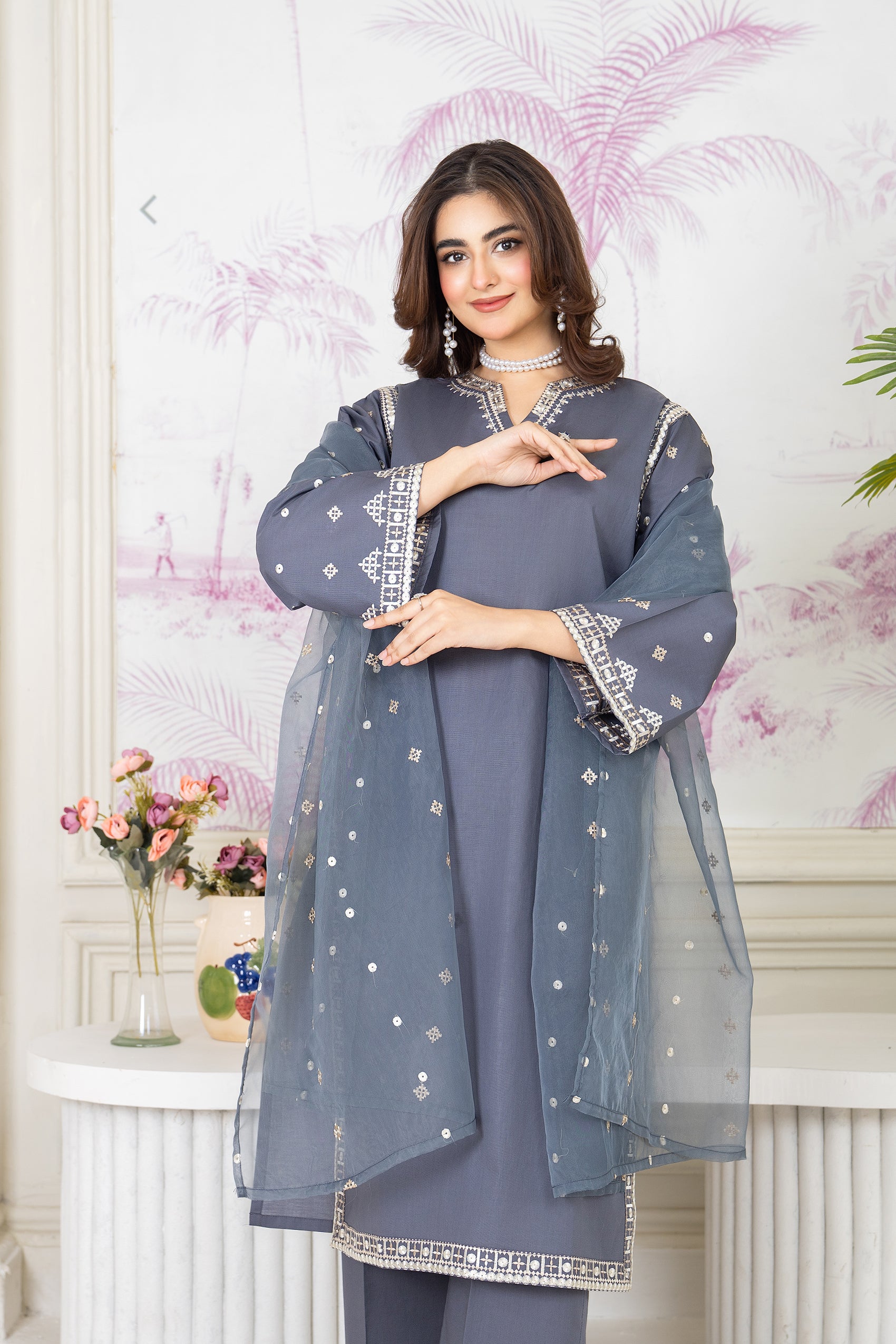 Experience elegance with our exquisite grey Aseel ensemble. This eid collection piece features grey - embroidered shirt with embroidered soft organza dupatta.
