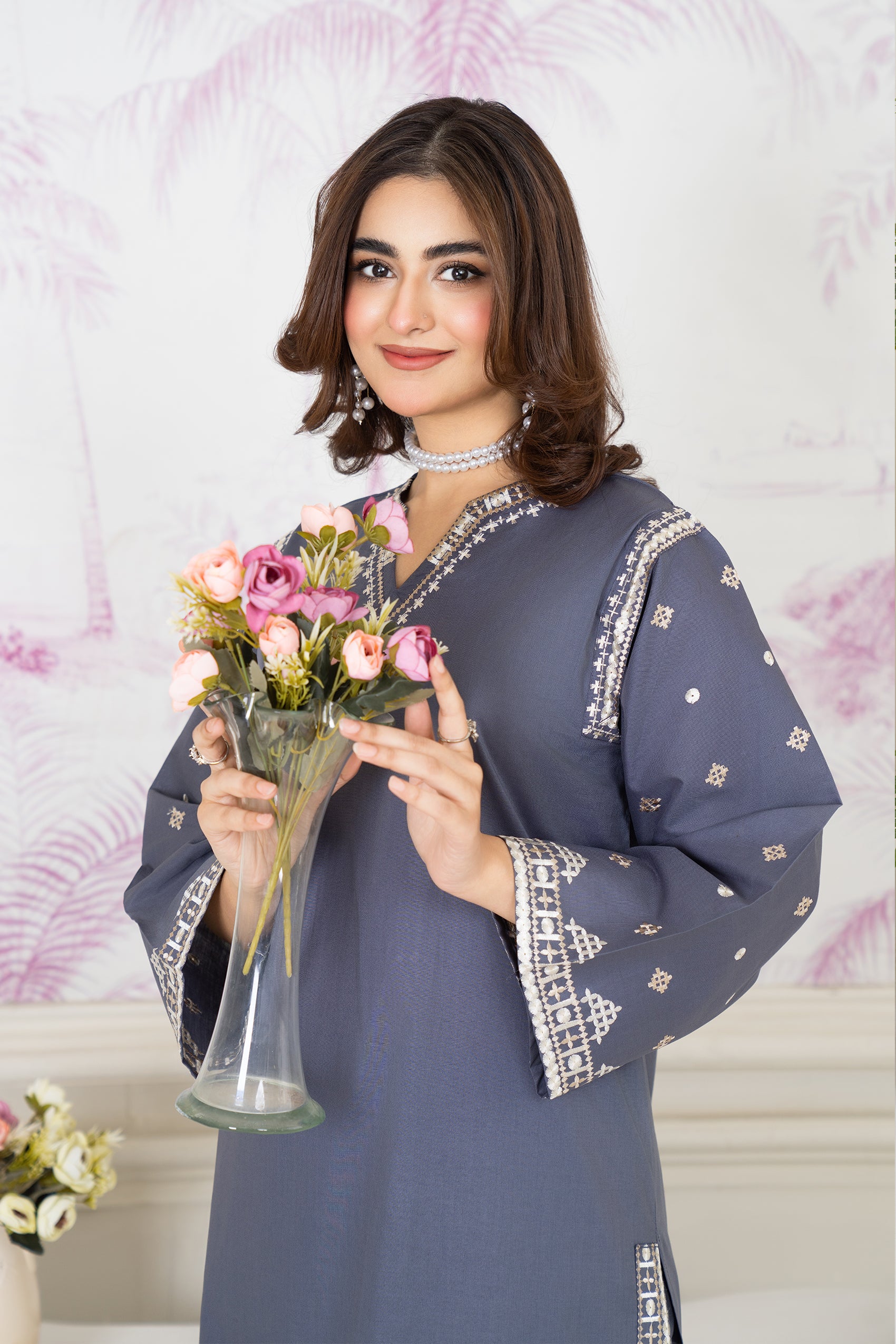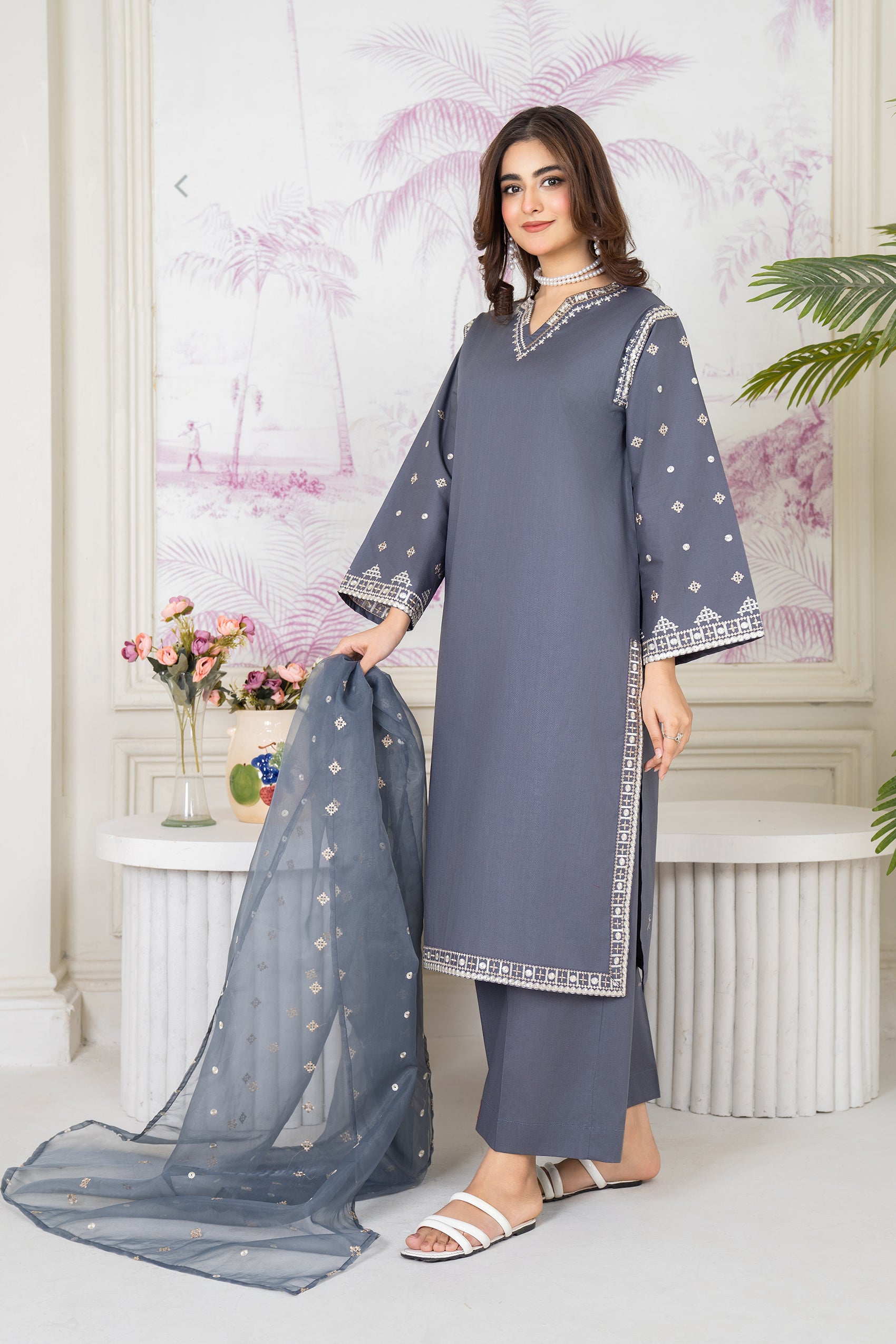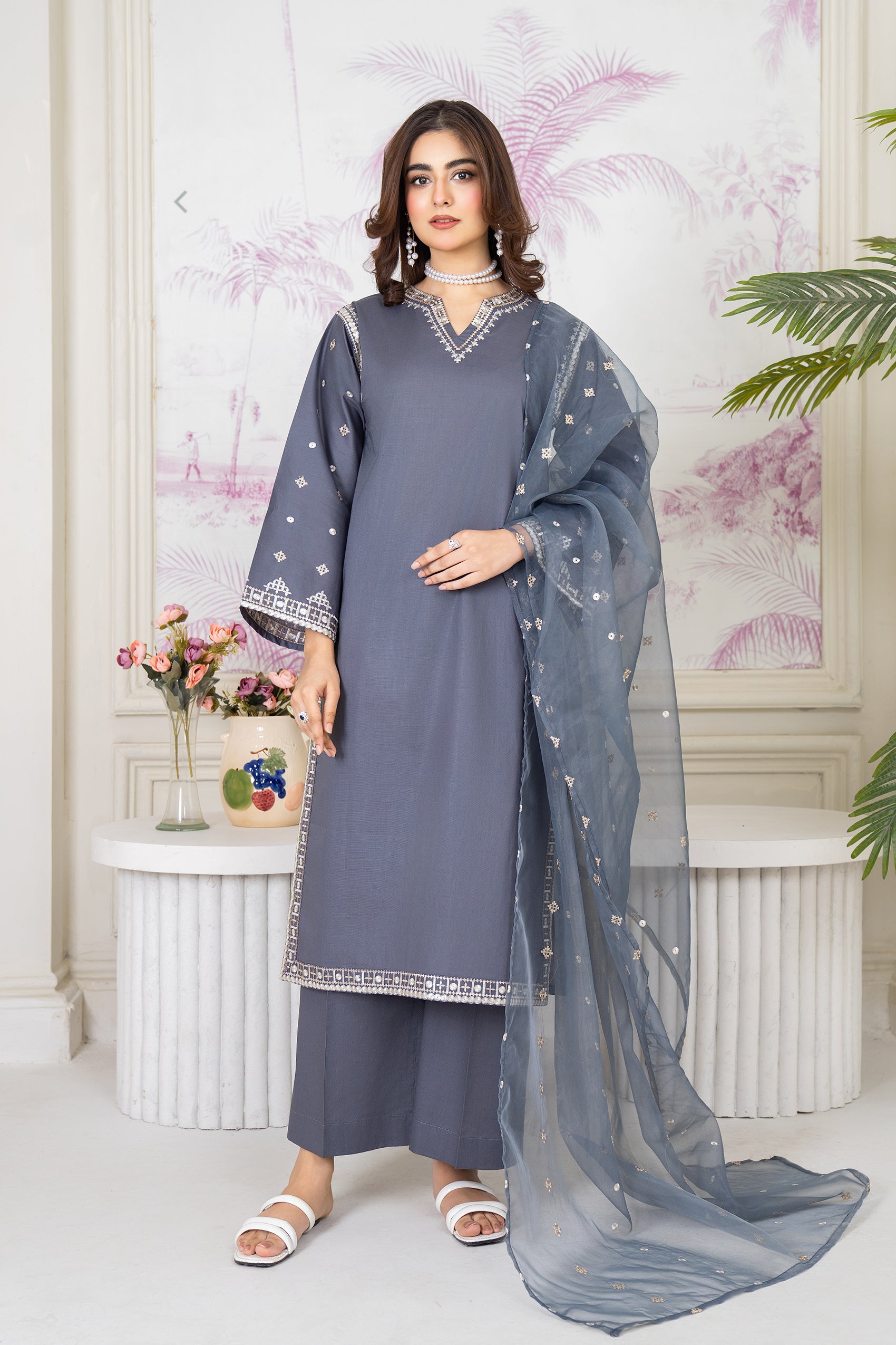 Experience elegance with our exquisite grey Aseel ensemble. This eid collection piece features grey - embroidered shirt with embroidered soft organza dupatta.