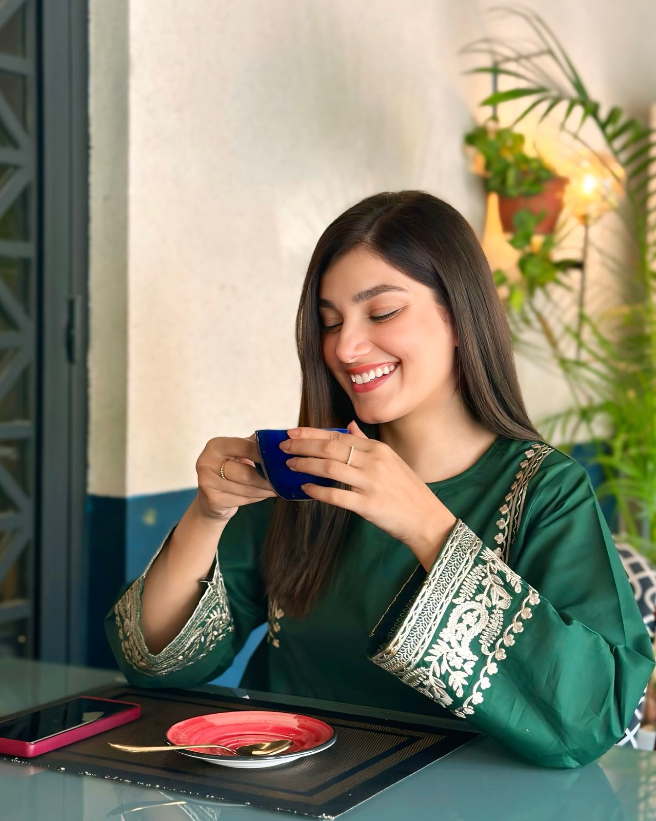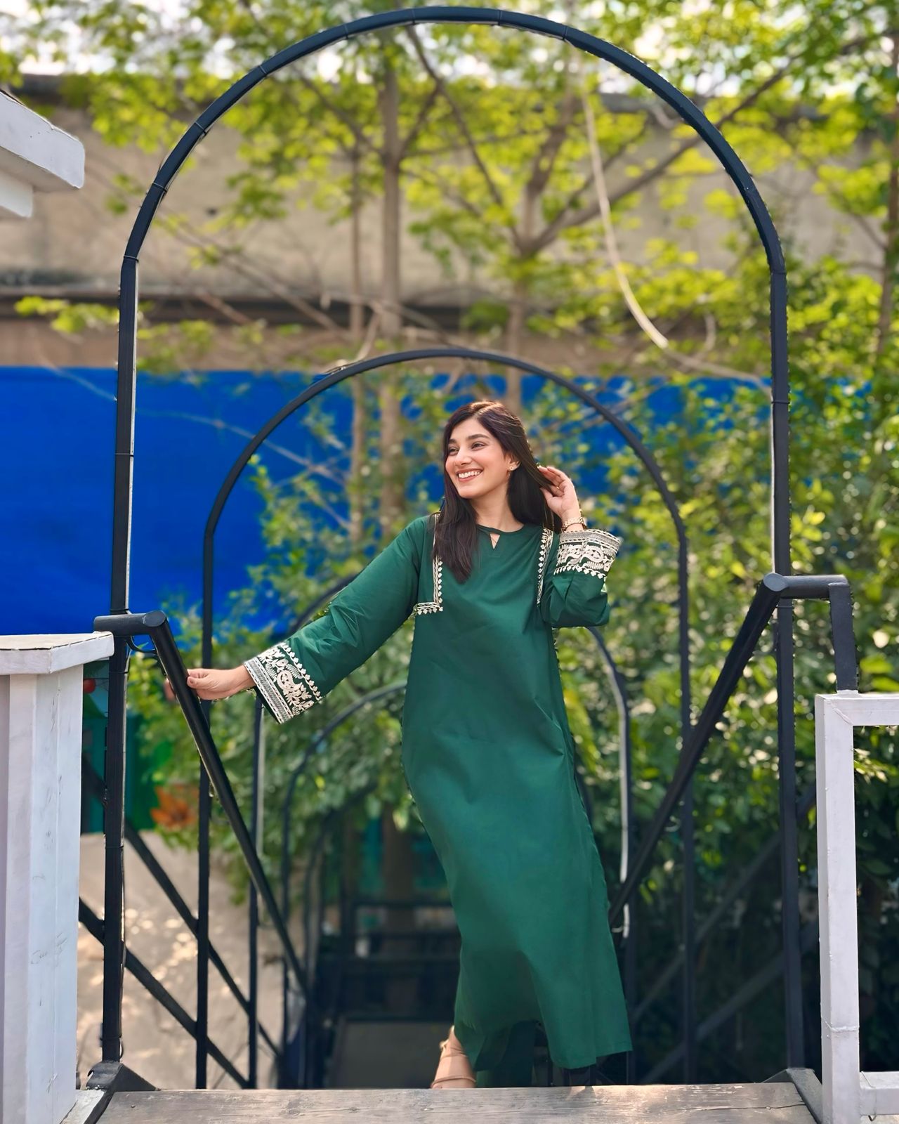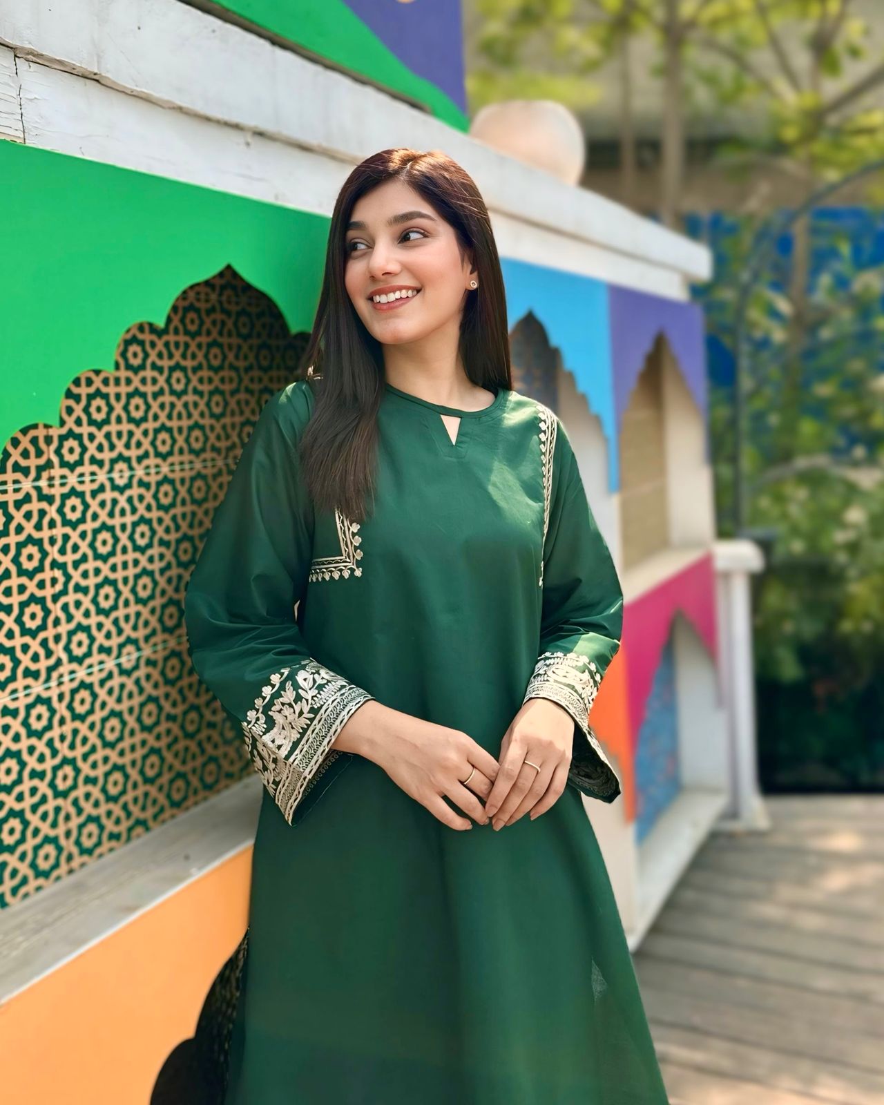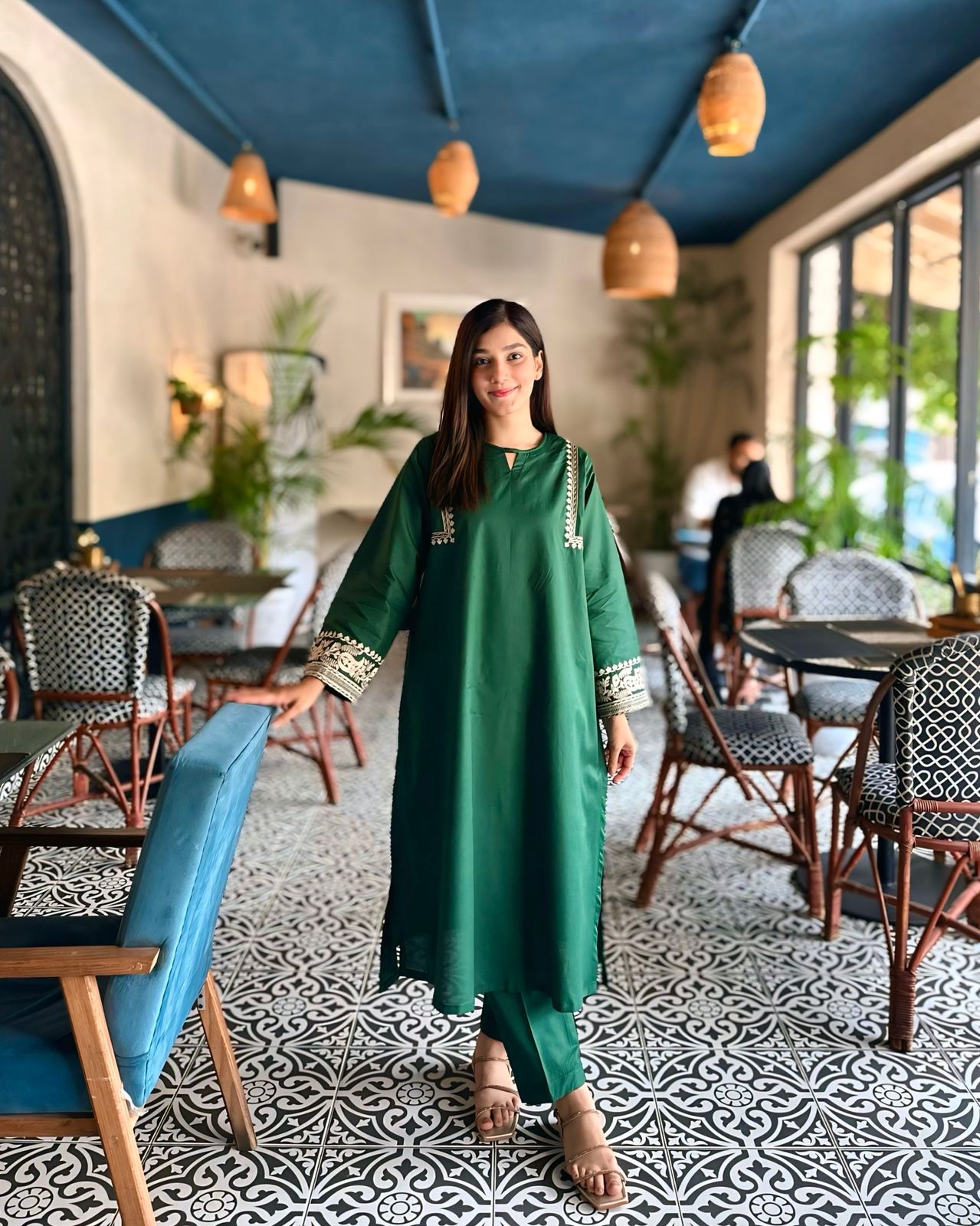 Experience elegance with our exquisite emerald ensemble. This summer collection piece features A-line shirt with embroider shoulders and sleeveles .