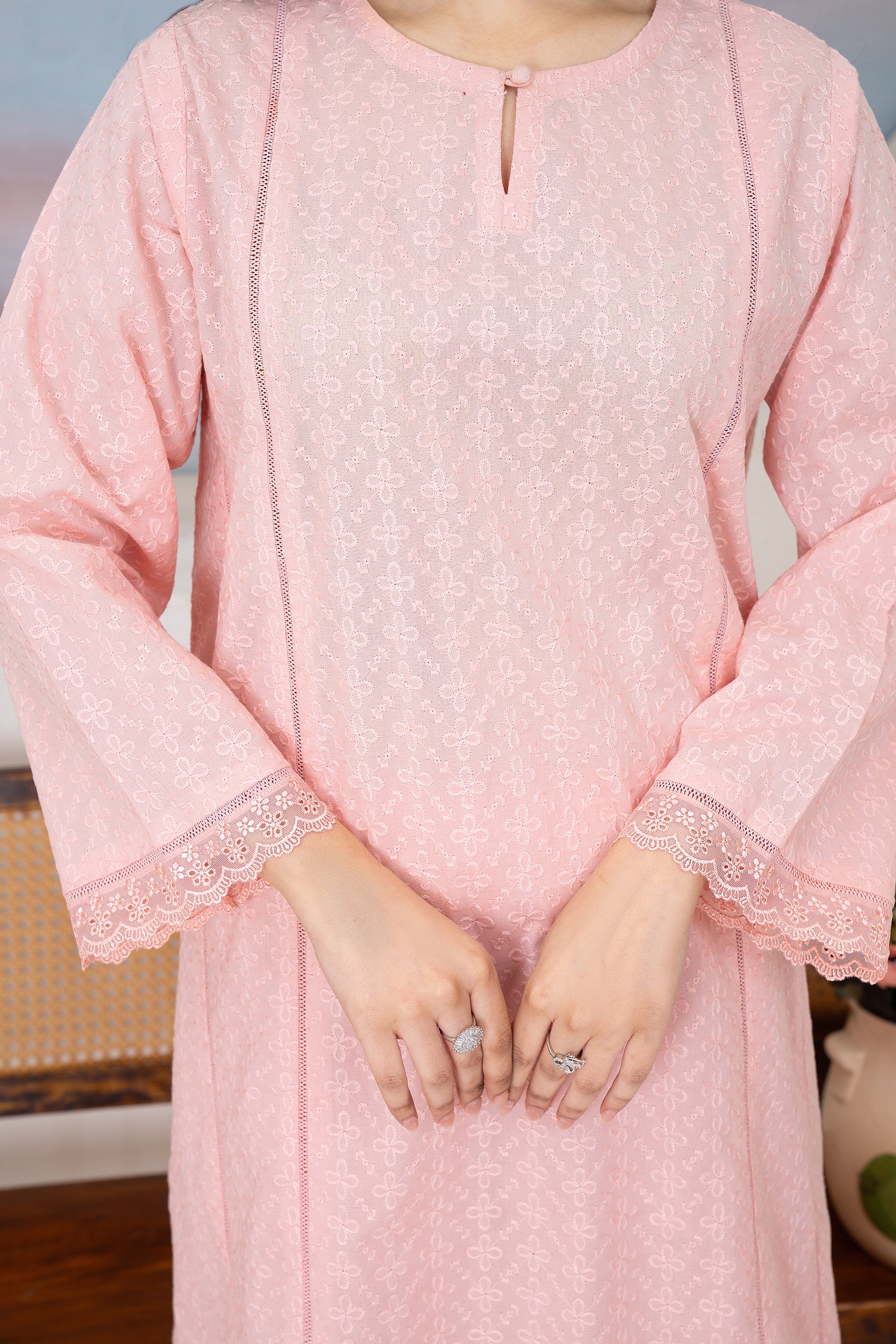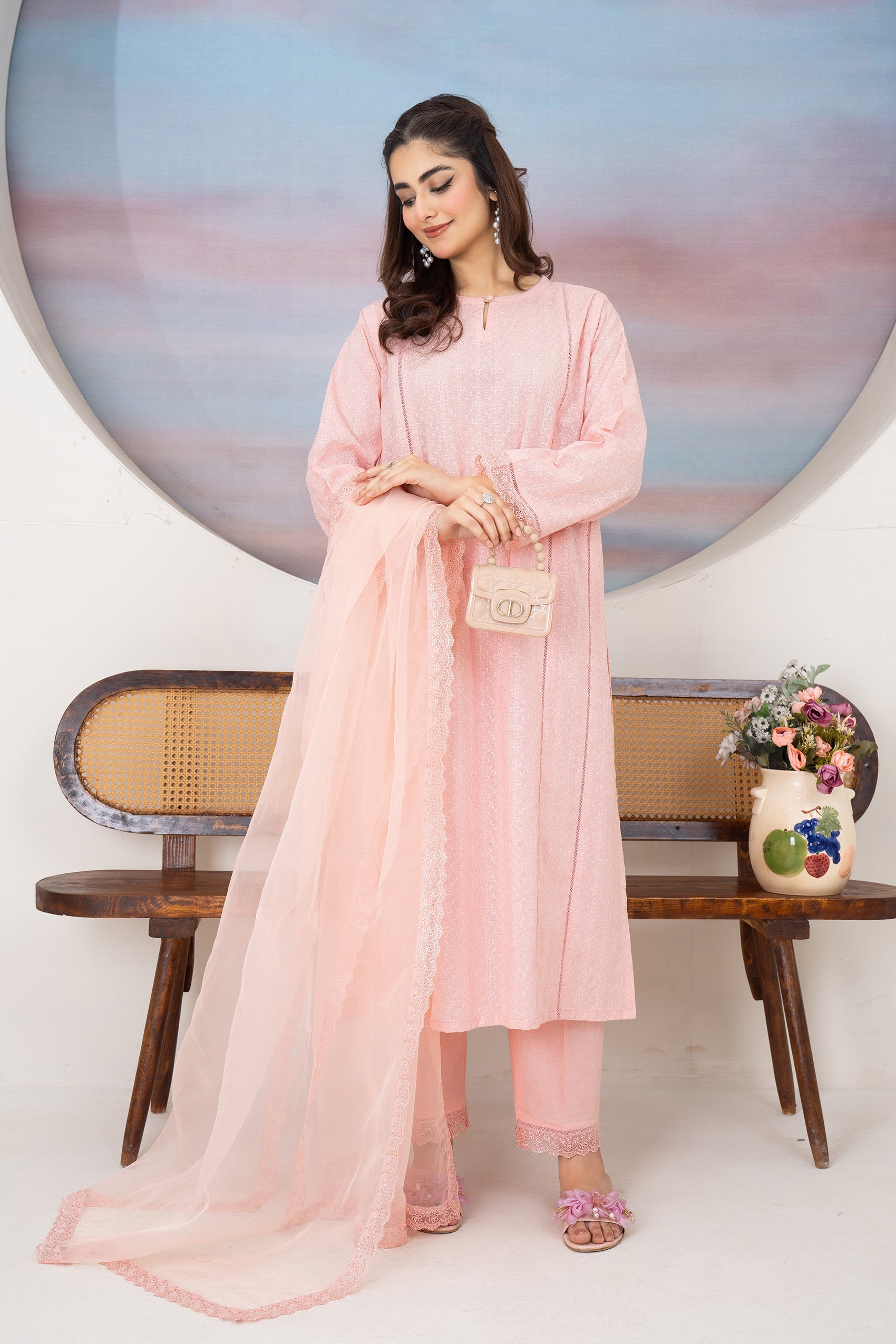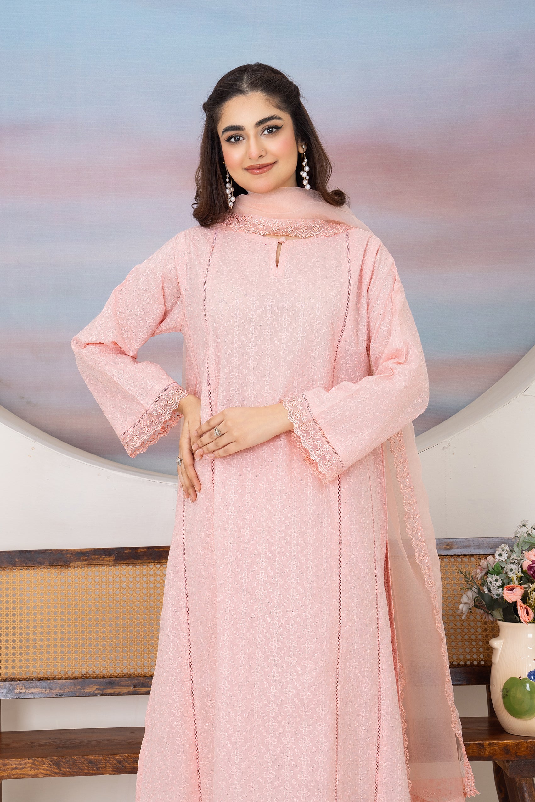 Experience elegance with our exquisite powder pink Ayzal. This article features powder pink - chickenkari A-line long shirt with beautiful lace added in the panels, trouser bottom designed with lace, along with soft organza dupatta .