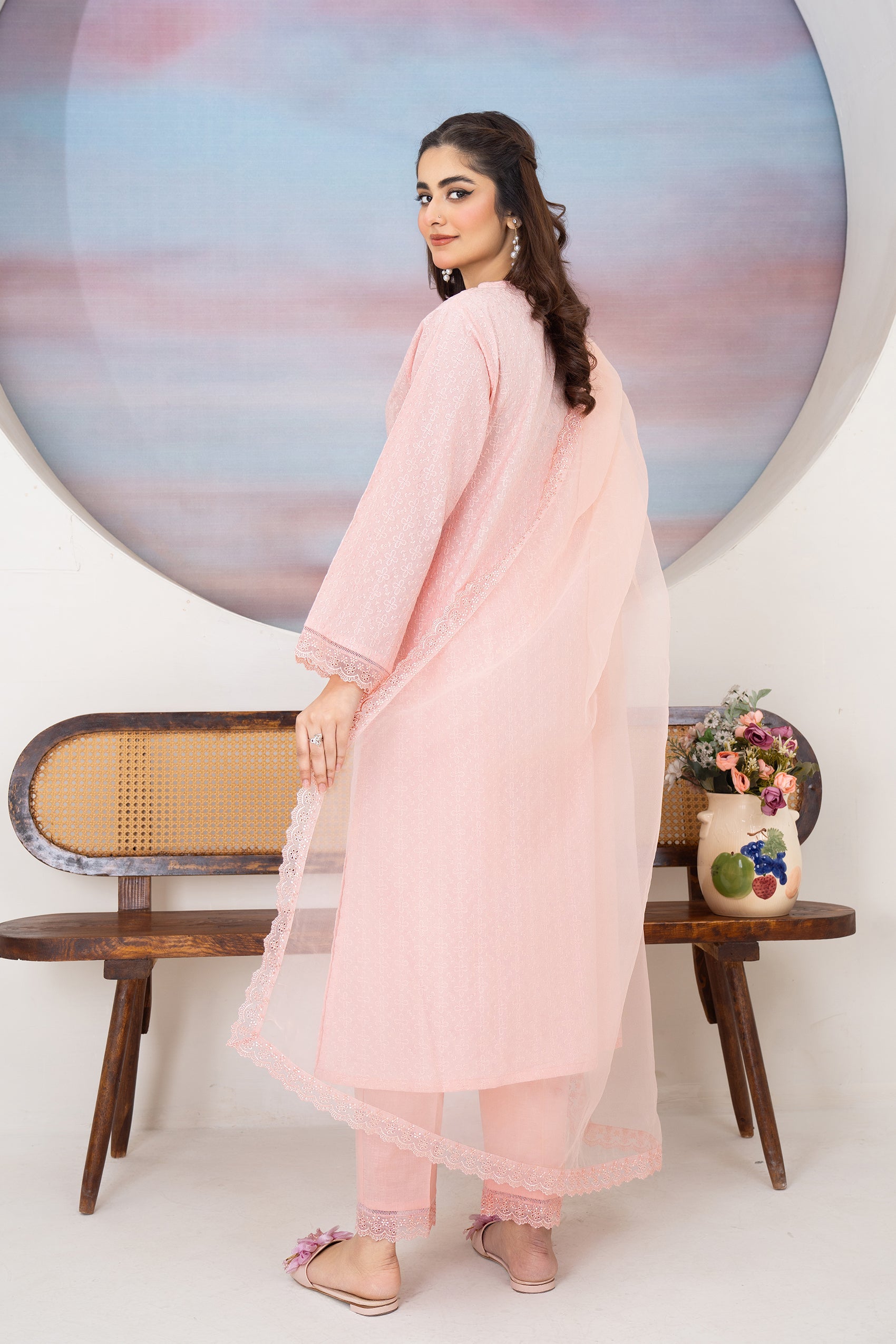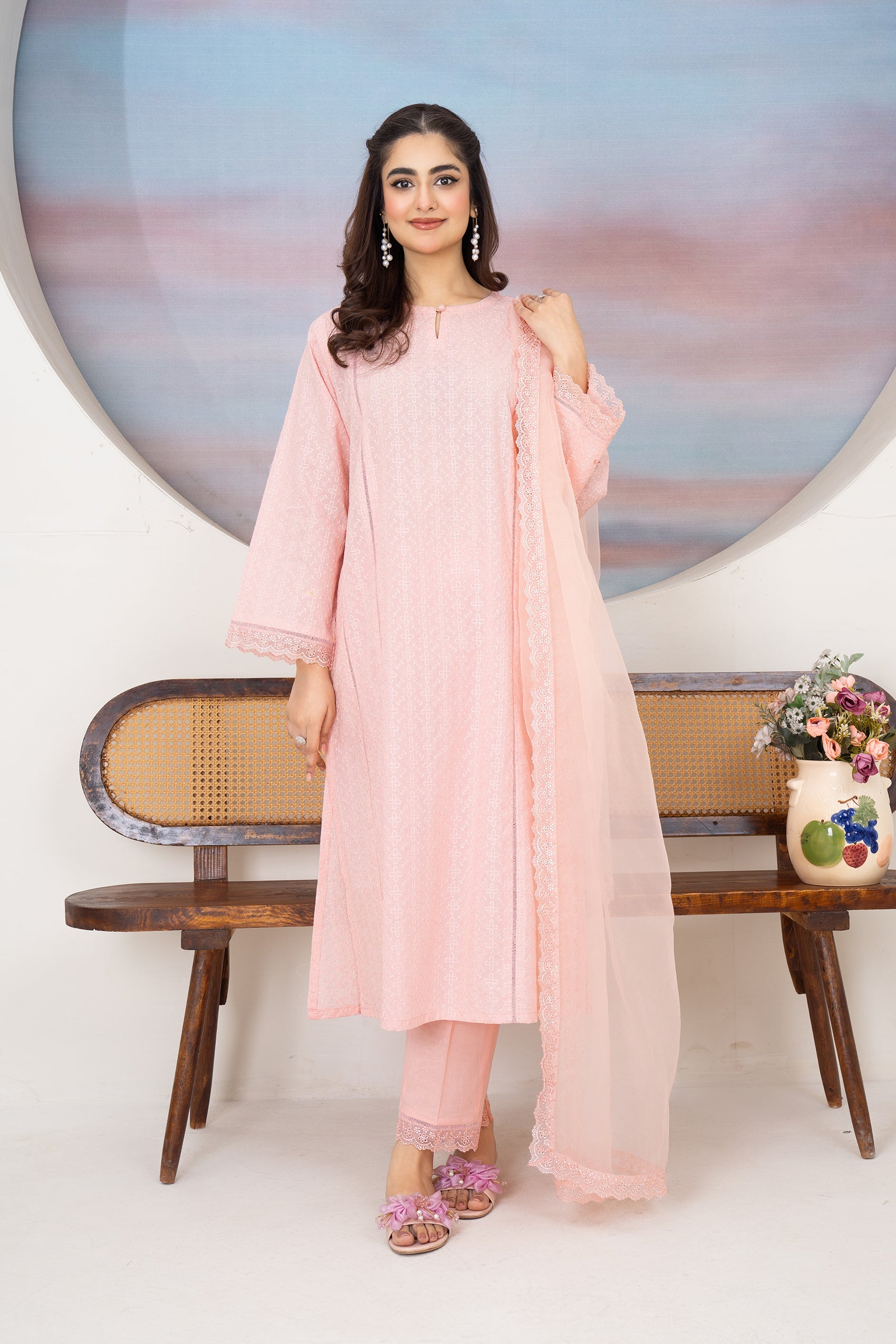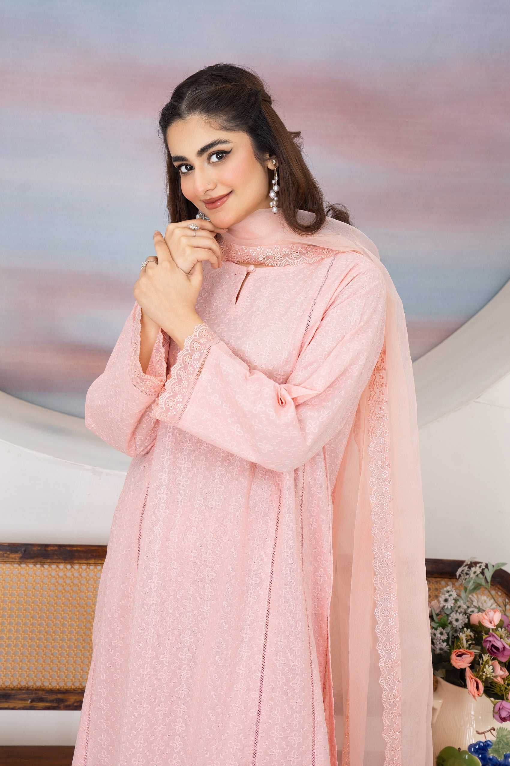 Experience elegance with our exquisite powder pink Ayzal. This article features powder pink - chickenkari A-line long shirt with beautiful lace added in the panels, trouser bottom designed with lace, along with soft organza dupatta .