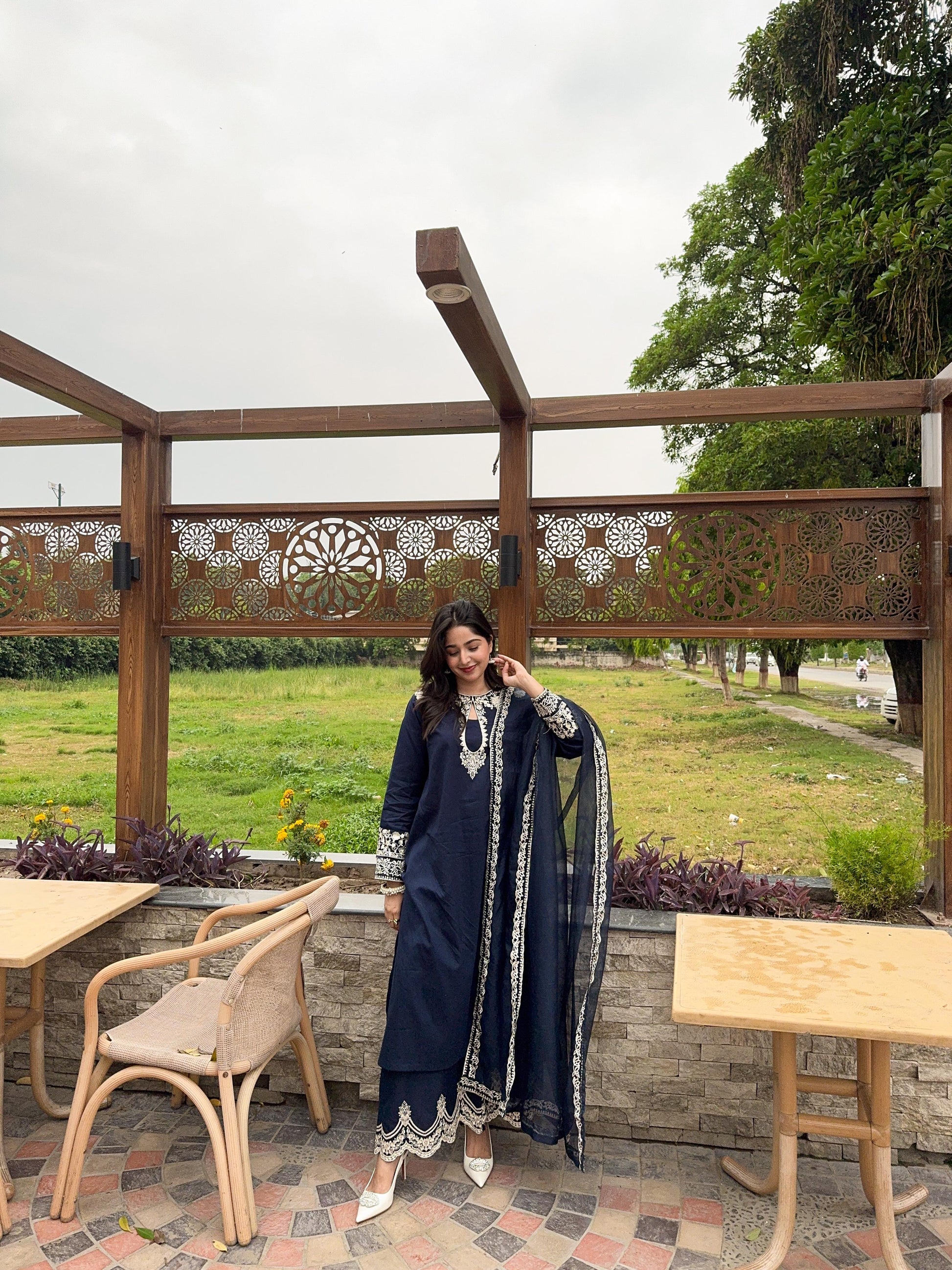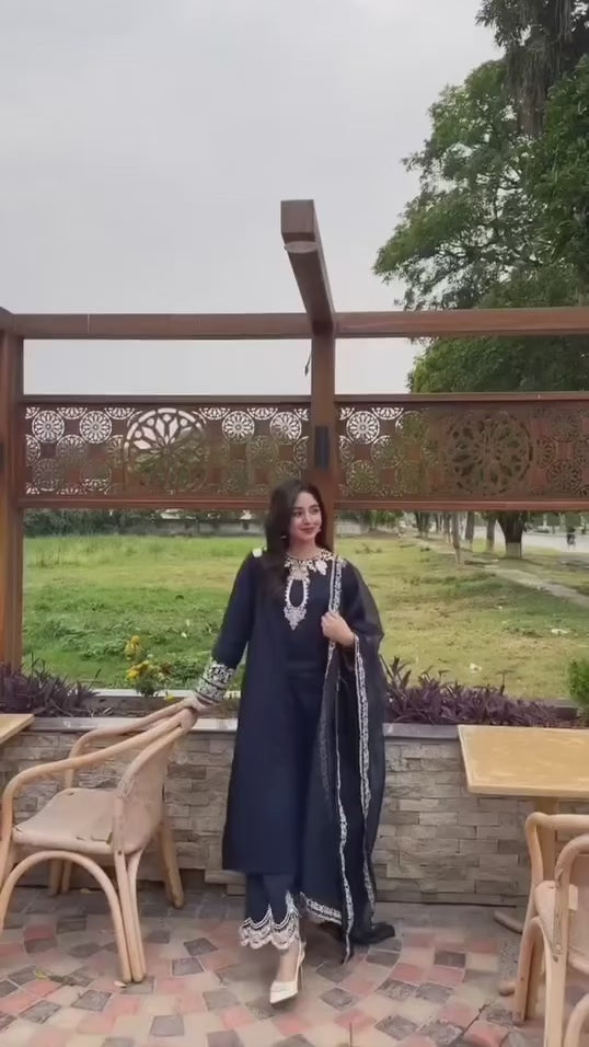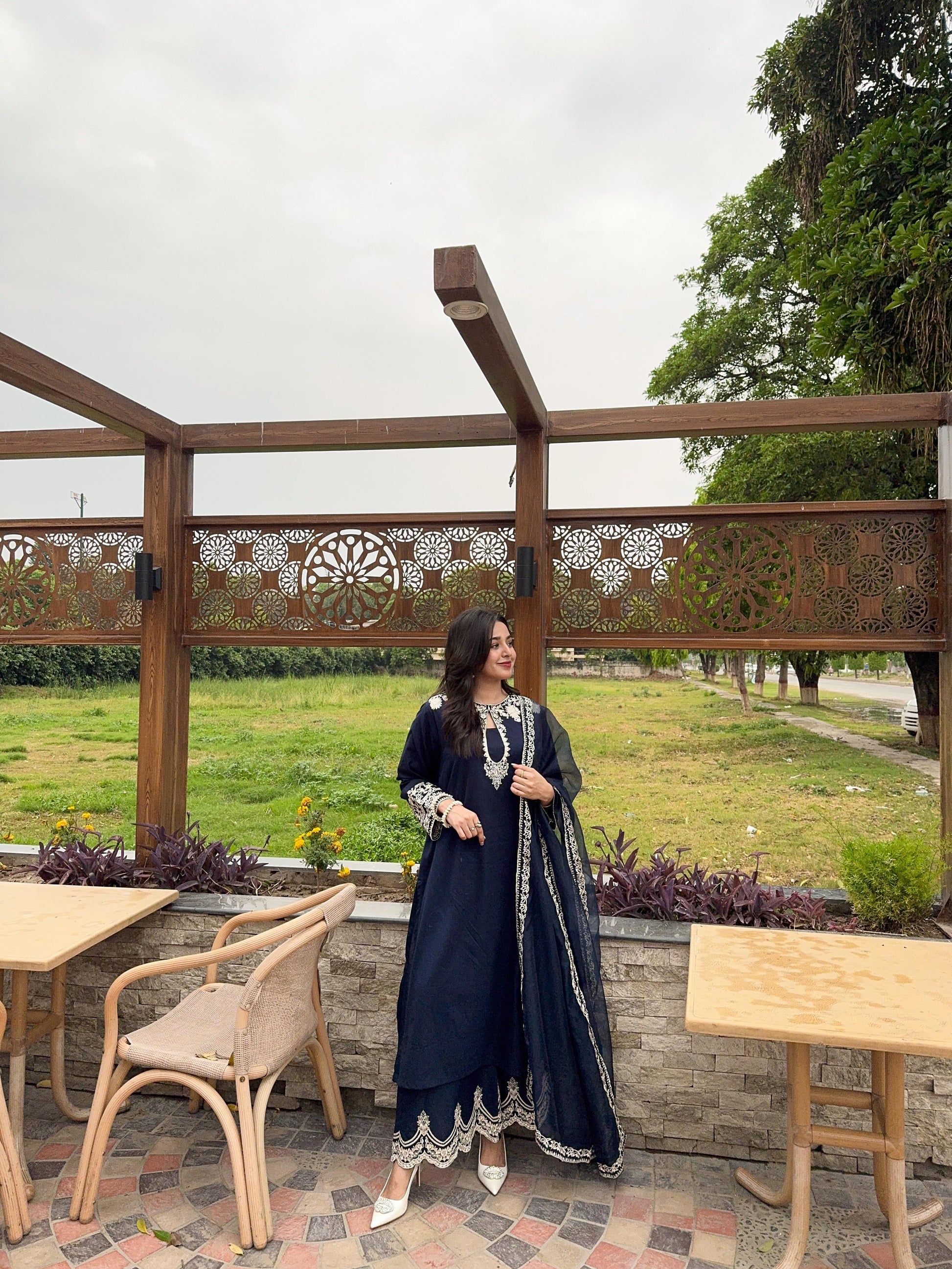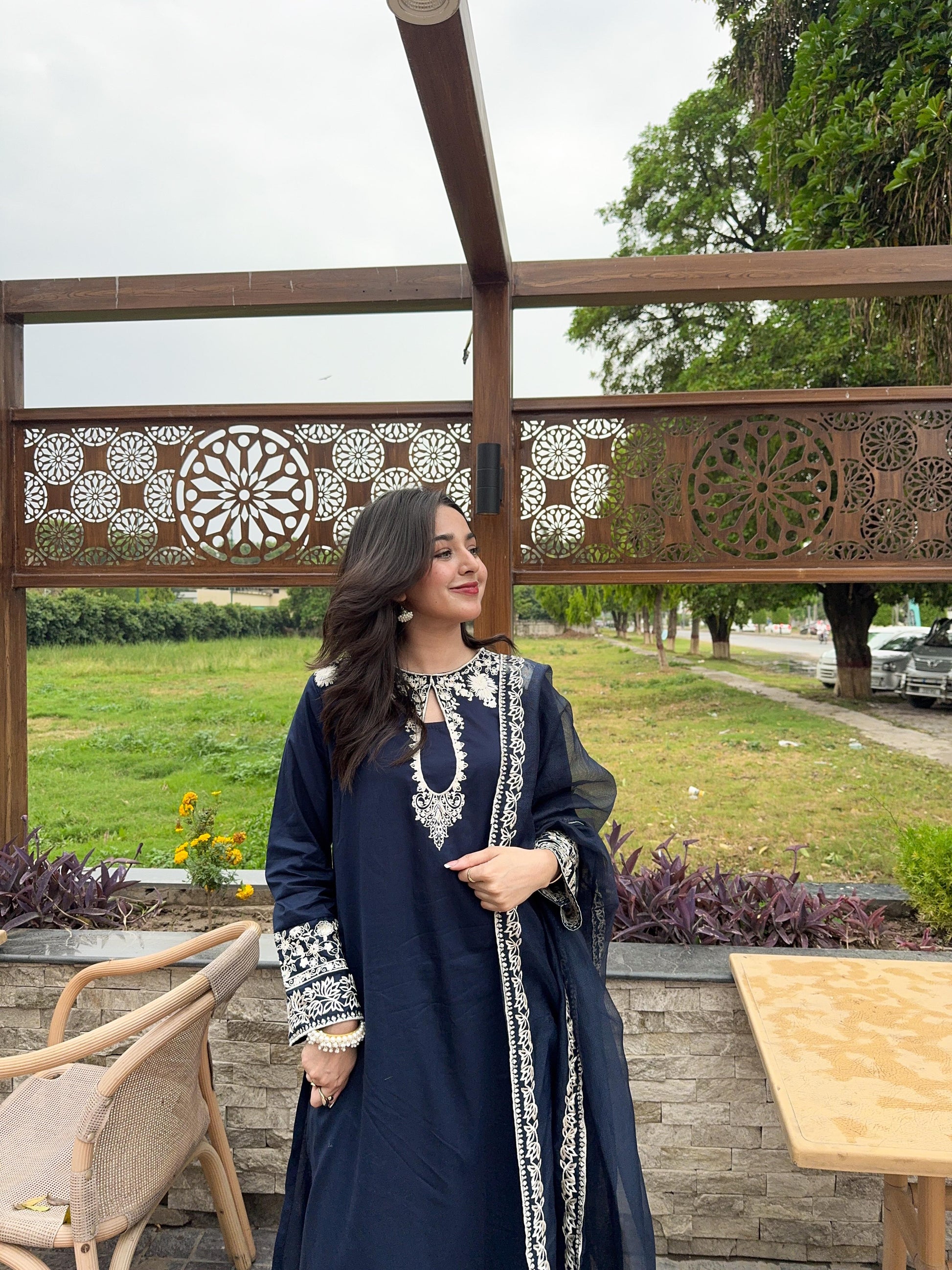 Experience elegance with our exquisite Blue Dilara ensemble. This article features Blue embroidered neckline and sleeves along with embroidered cotton net dupatta.