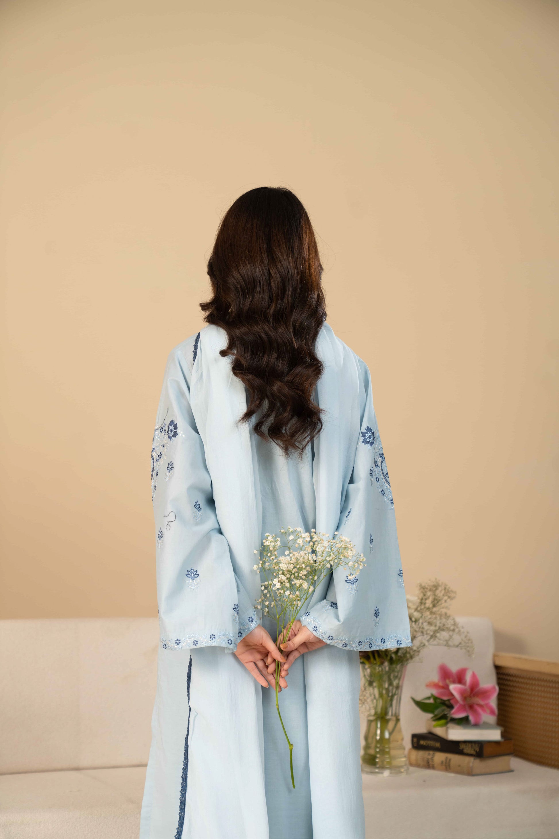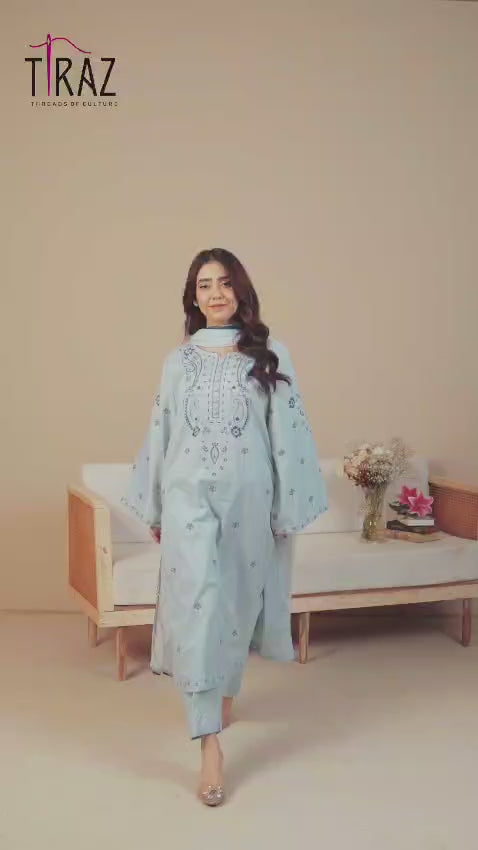 Stitched 3 piece - A beautiful ice blue long shirt delicately embroidered, Paired with sleek pant trousers for a modern, flattering fit, and completed with a lightweight chiffon dupatta embellished with fine lace work that adds a touch of charm and elegance.