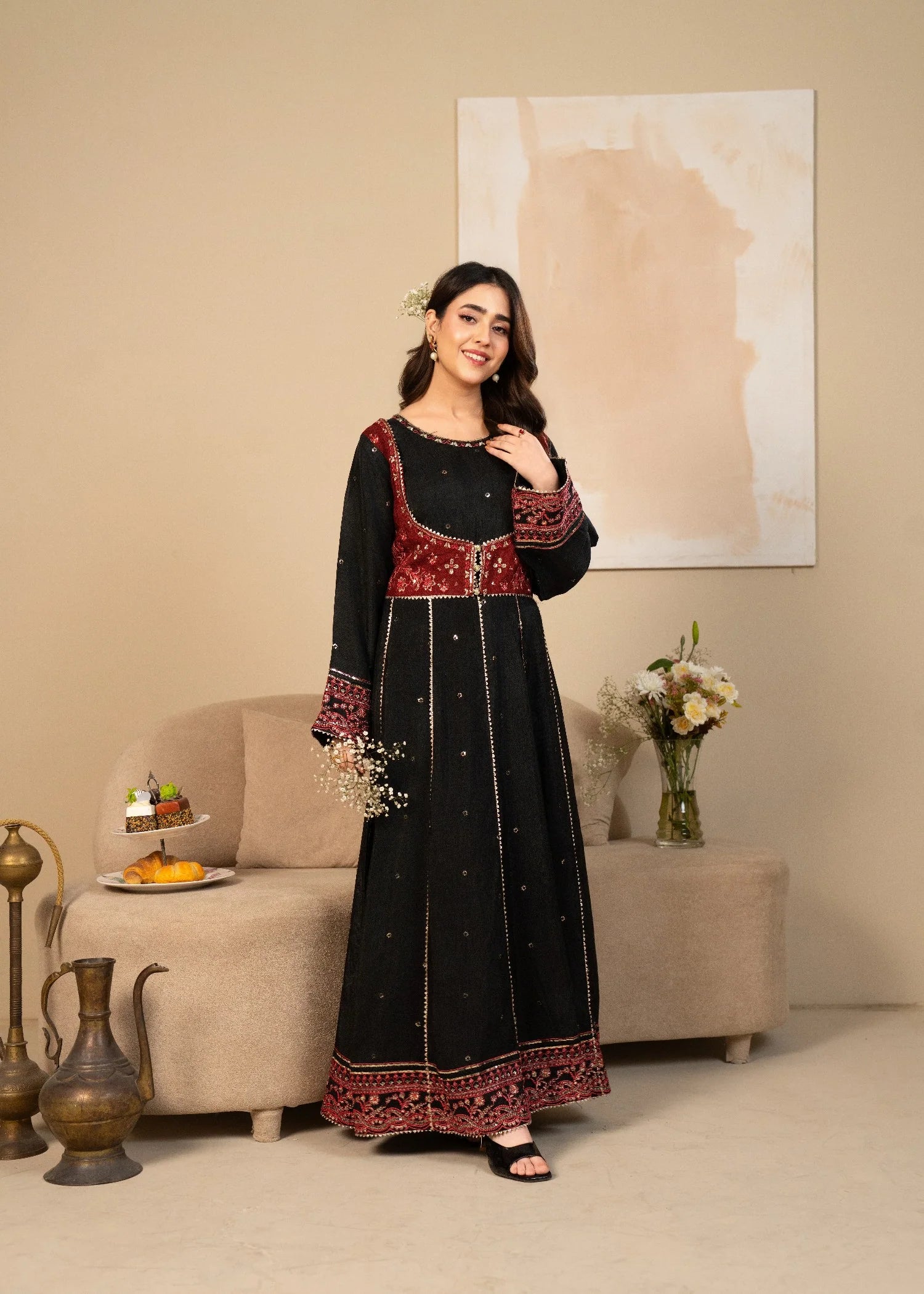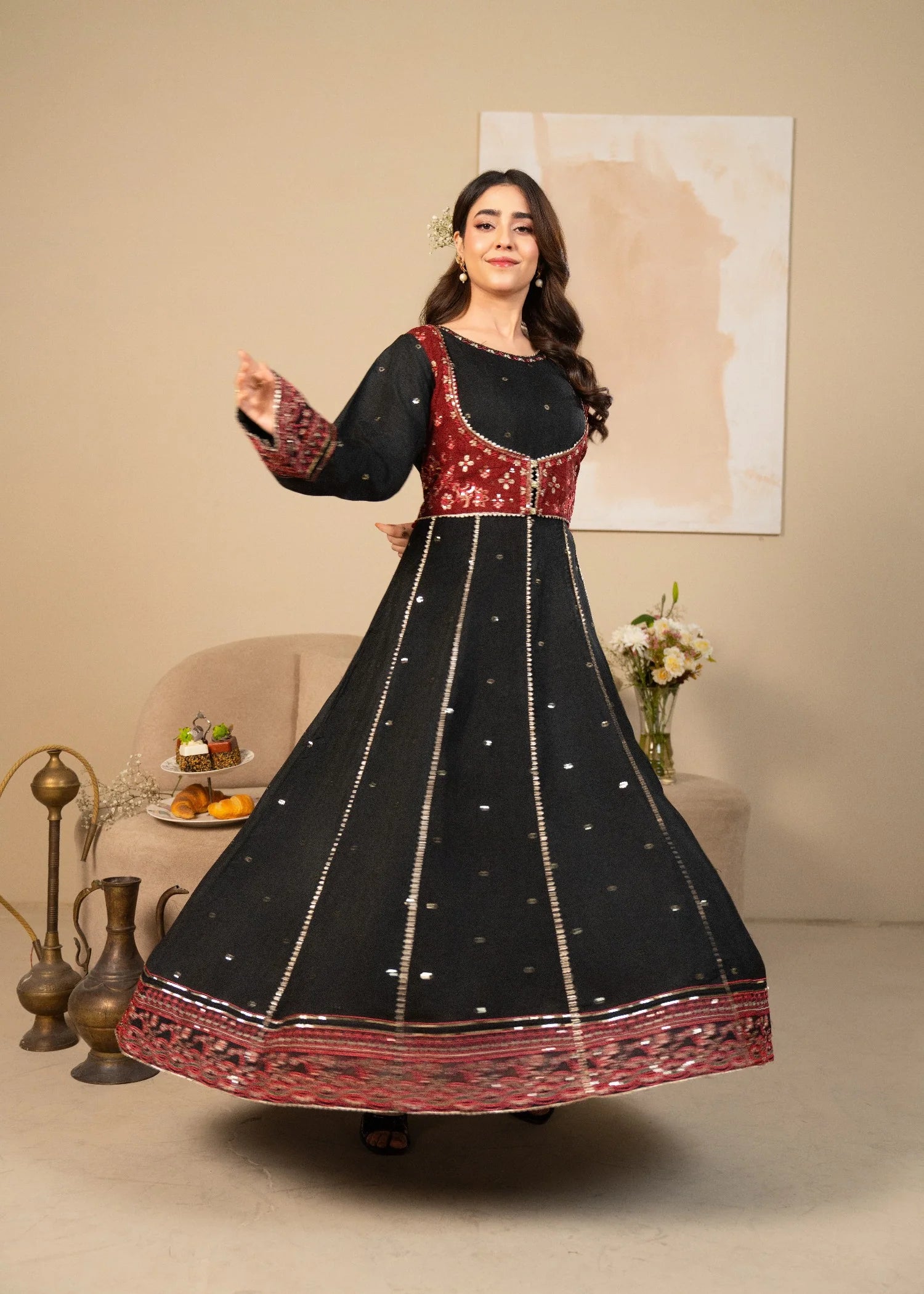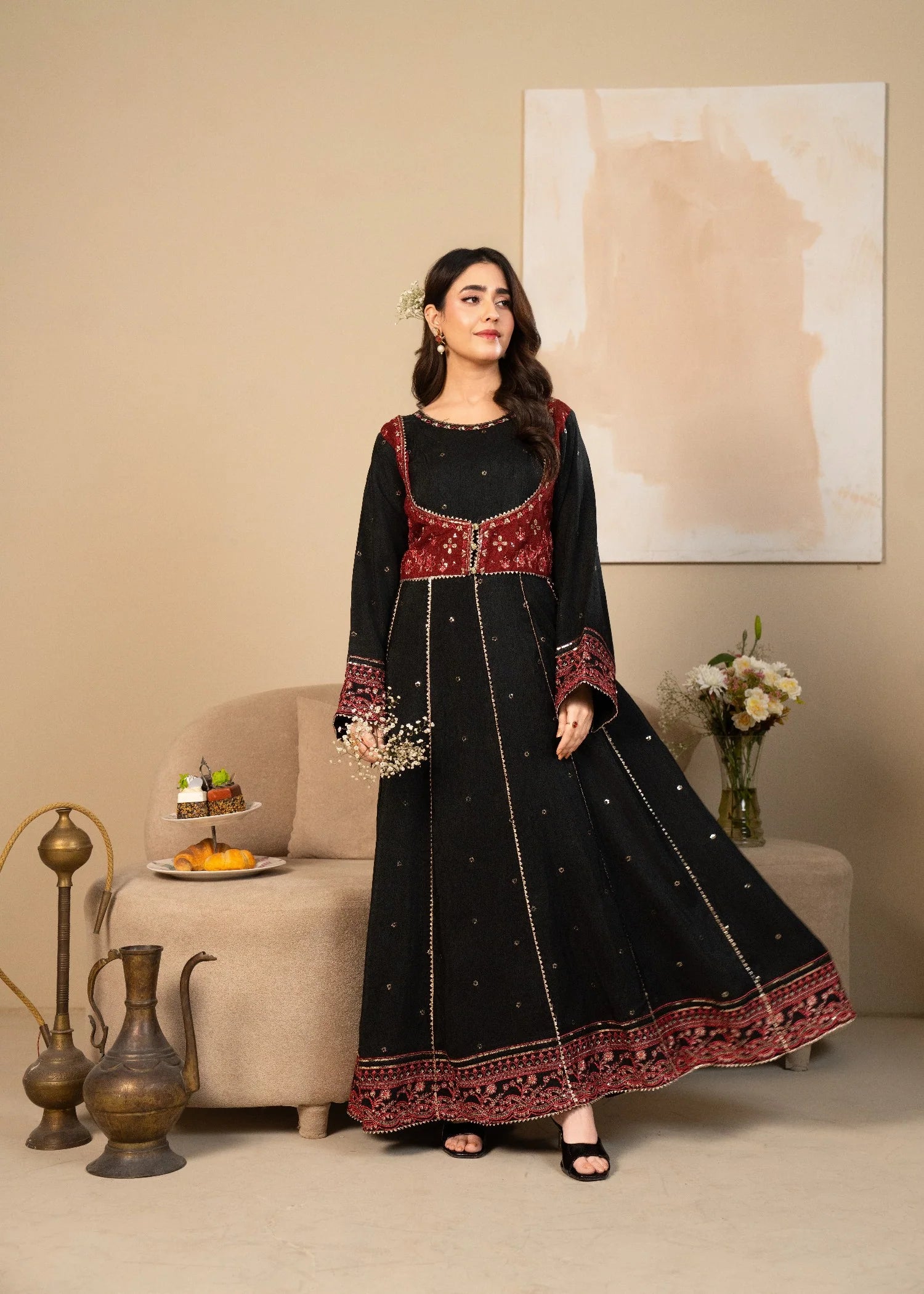 Stitched one piece- This black silk embroidered frock is designed to make you stand out. The detailed embroidery enhances the beauty of the rich silk fabric, giving a royal and feminine feel. The long, flared cut adds movement and elegance, making it ideal for formal events and festive wear.