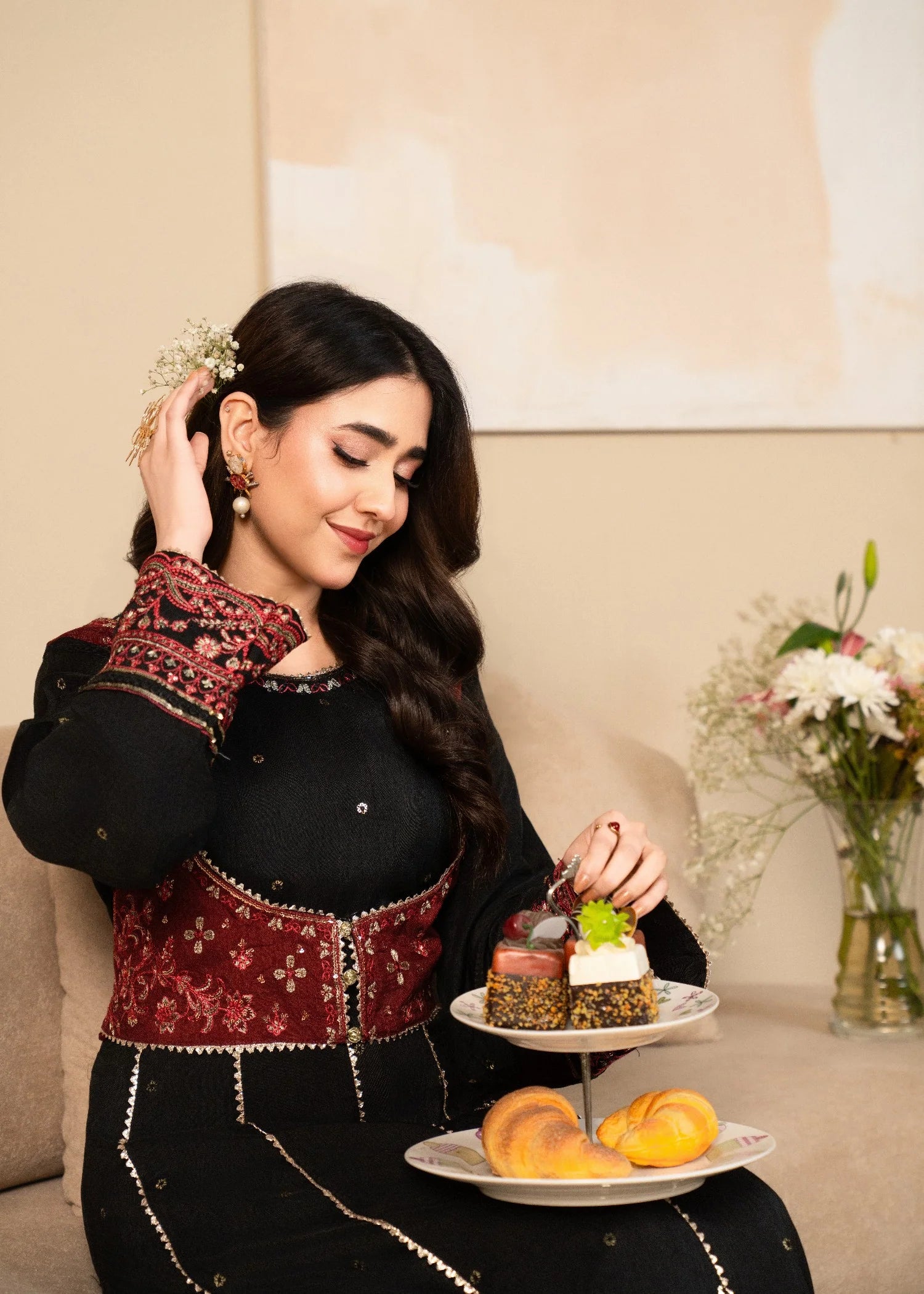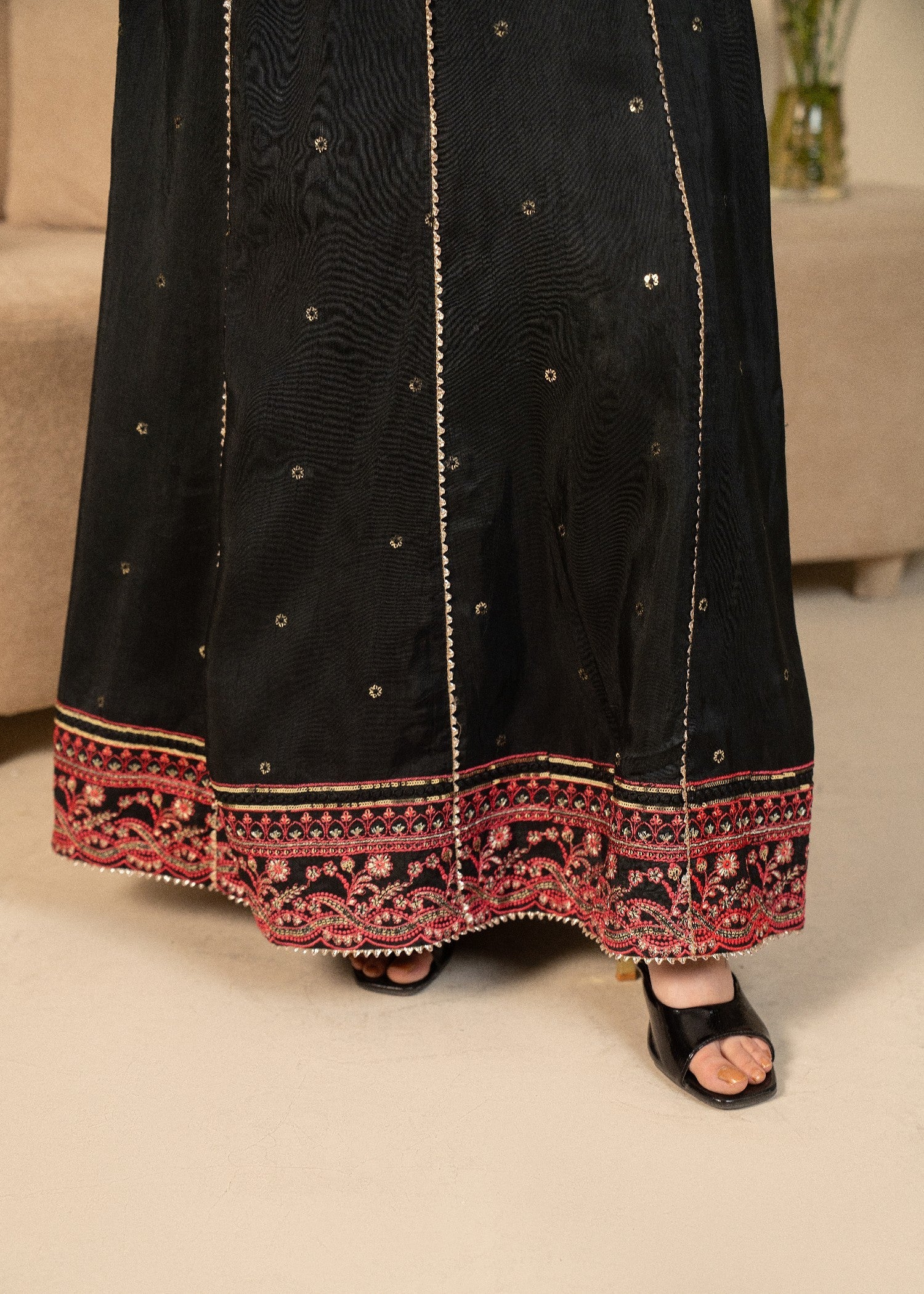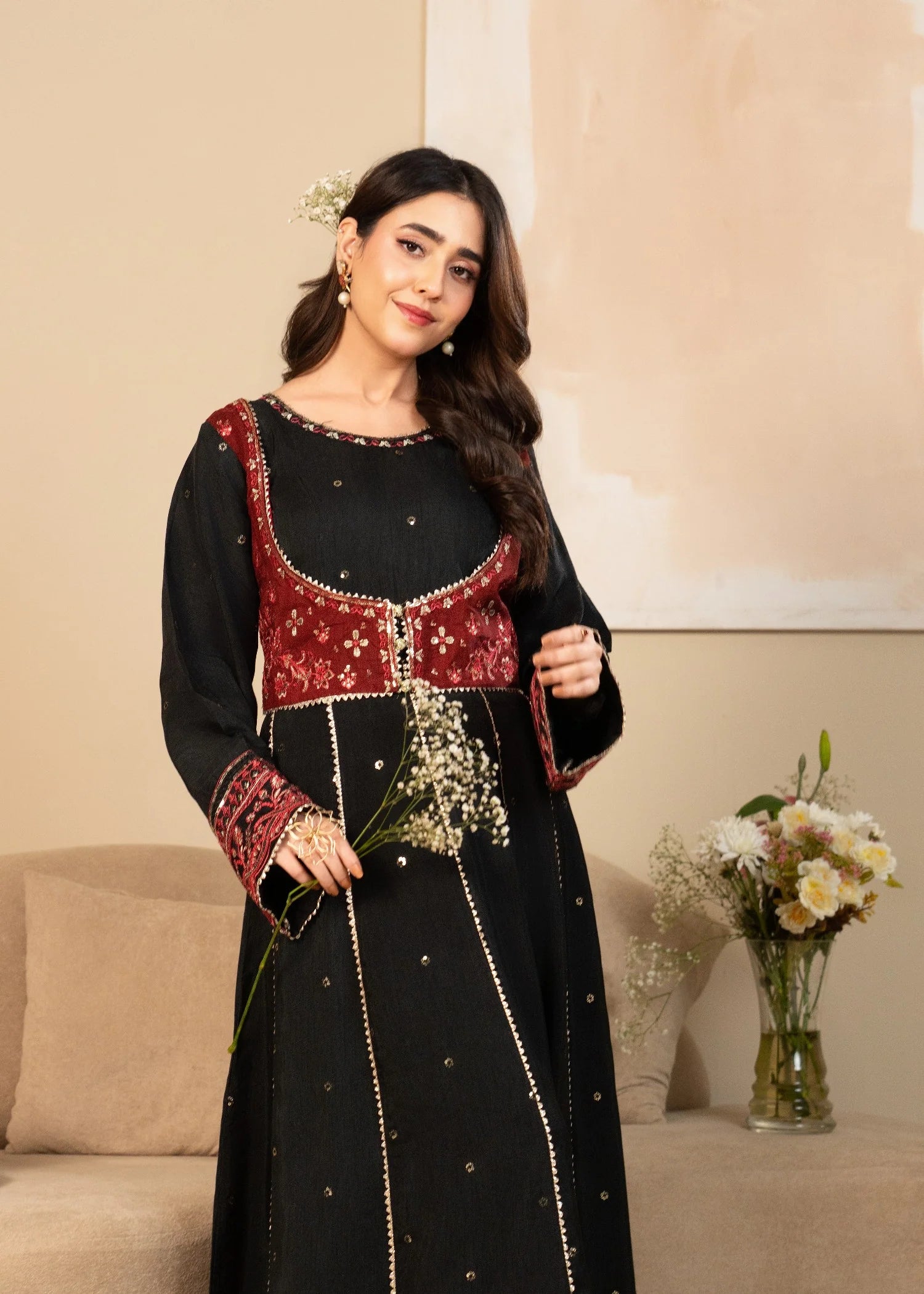 Stitched one piece- This black silk embroidered frock is designed to make you stand out. The detailed embroidery enhances the beauty of the rich silk fabric, giving a royal and feminine feel. The long, flared cut adds movement and elegance, making it ideal for formal events and festive wear.