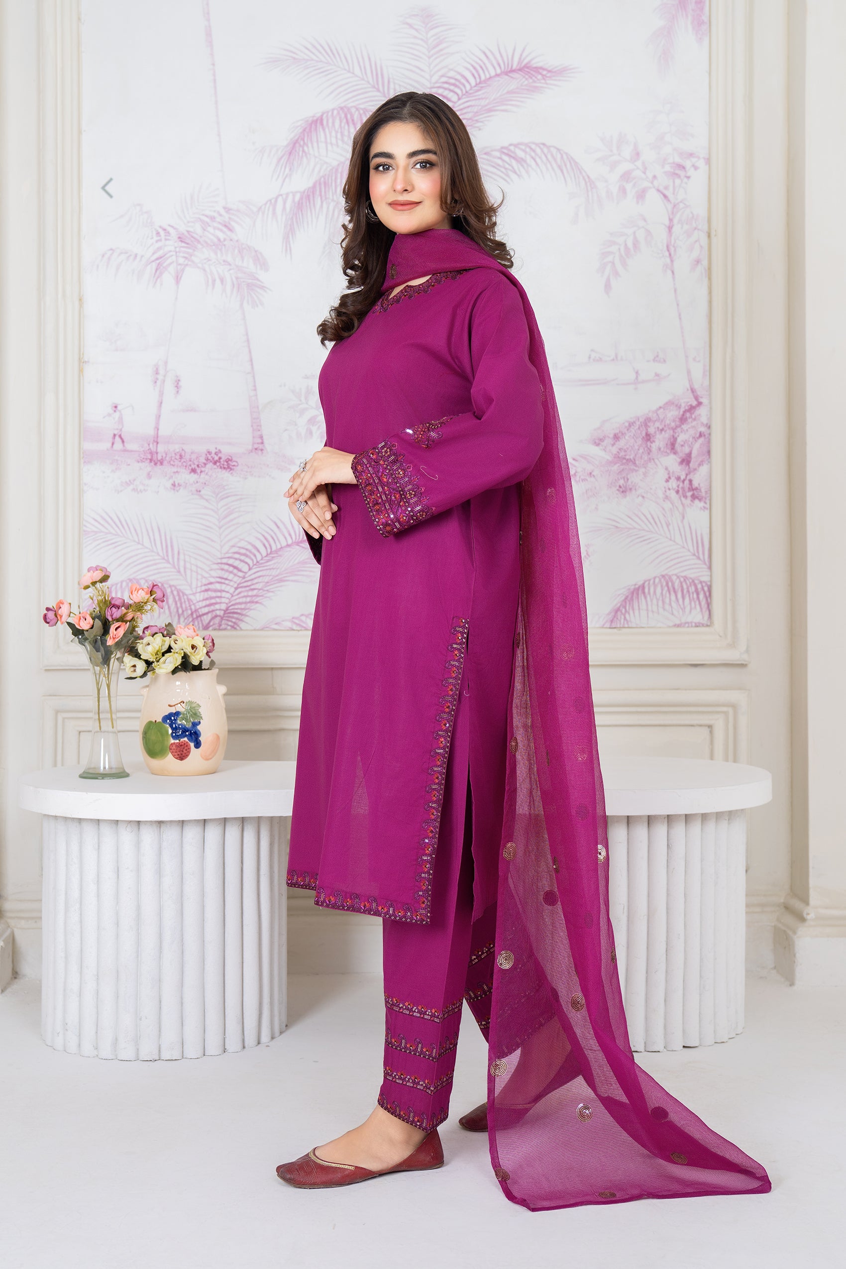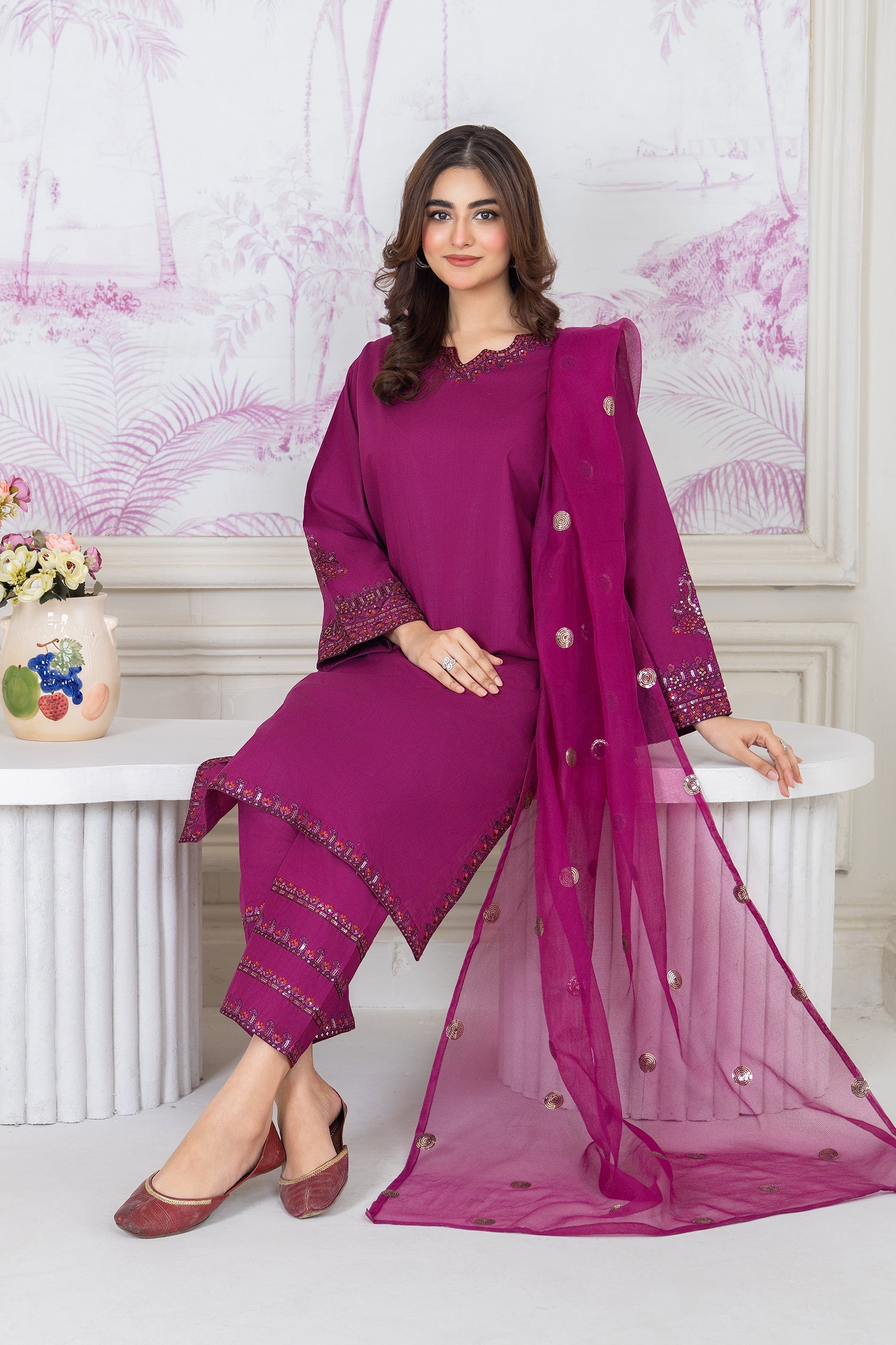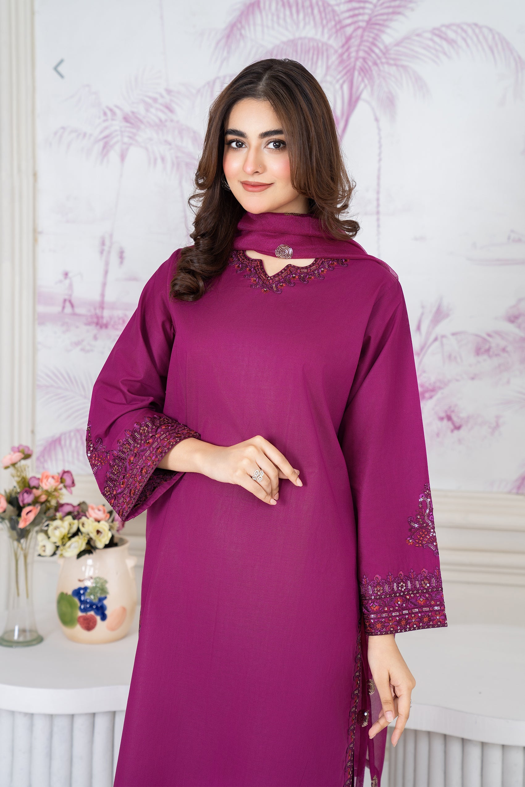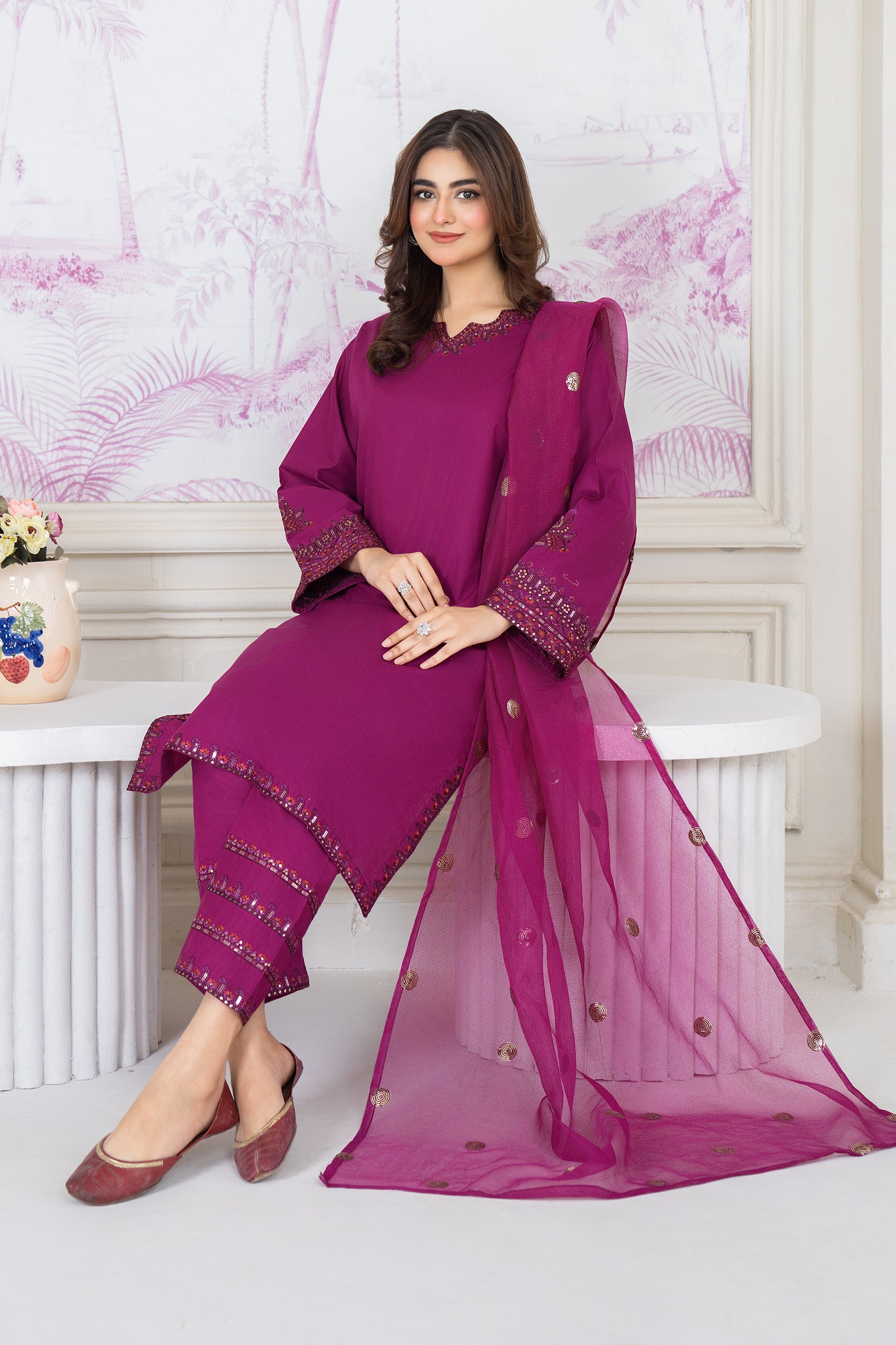 Experience elegance with our exquisite purple Hala ensemble. This eid collection piece features purple - embroidery shirt with embroidered shalwar sitari work on it along with cotton net dupatta.