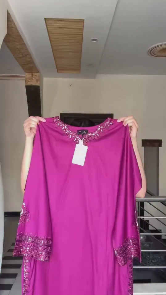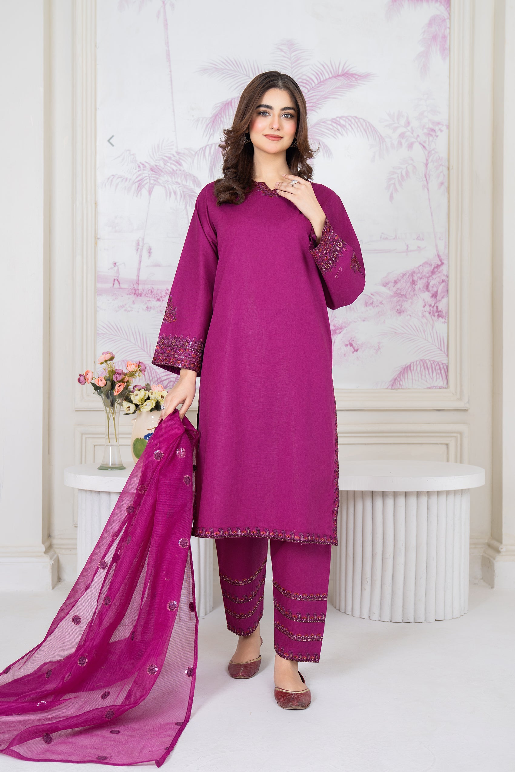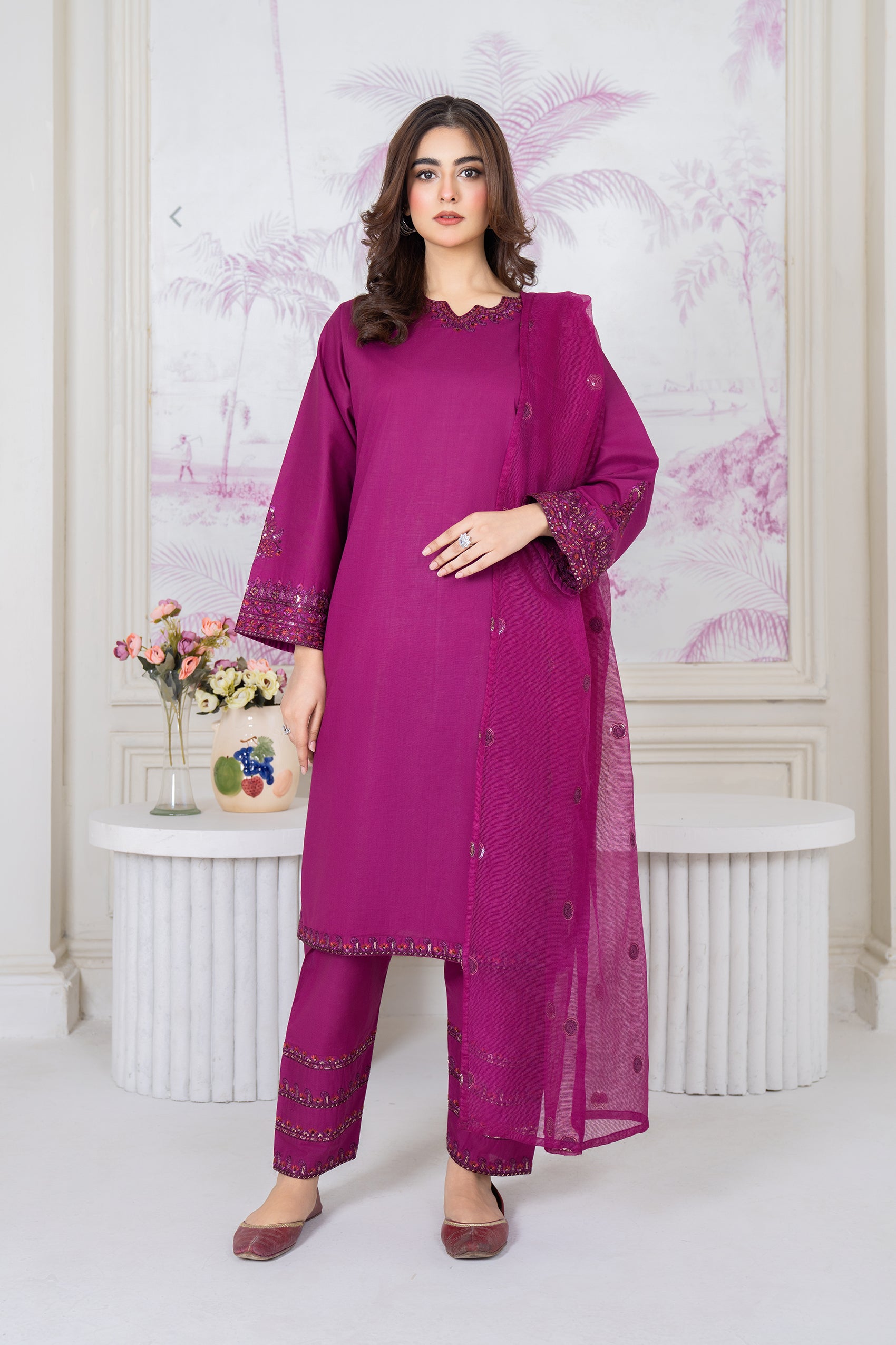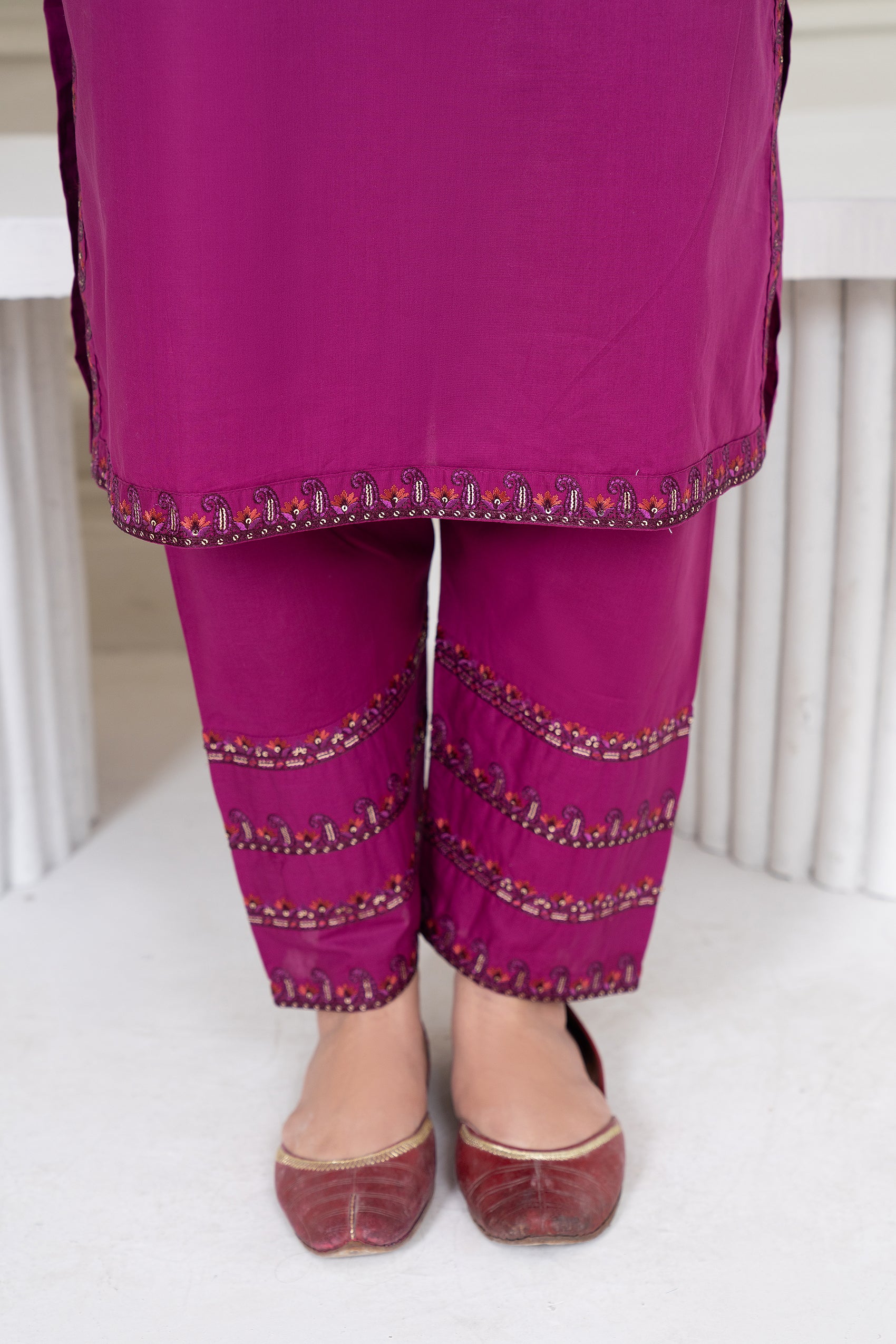 Experience elegance with our exquisite purple Hala ensemble. This eid collection piece features purple - embroidery shirt with embroidered shalwar sitari work on it along with cotton net dupatta.