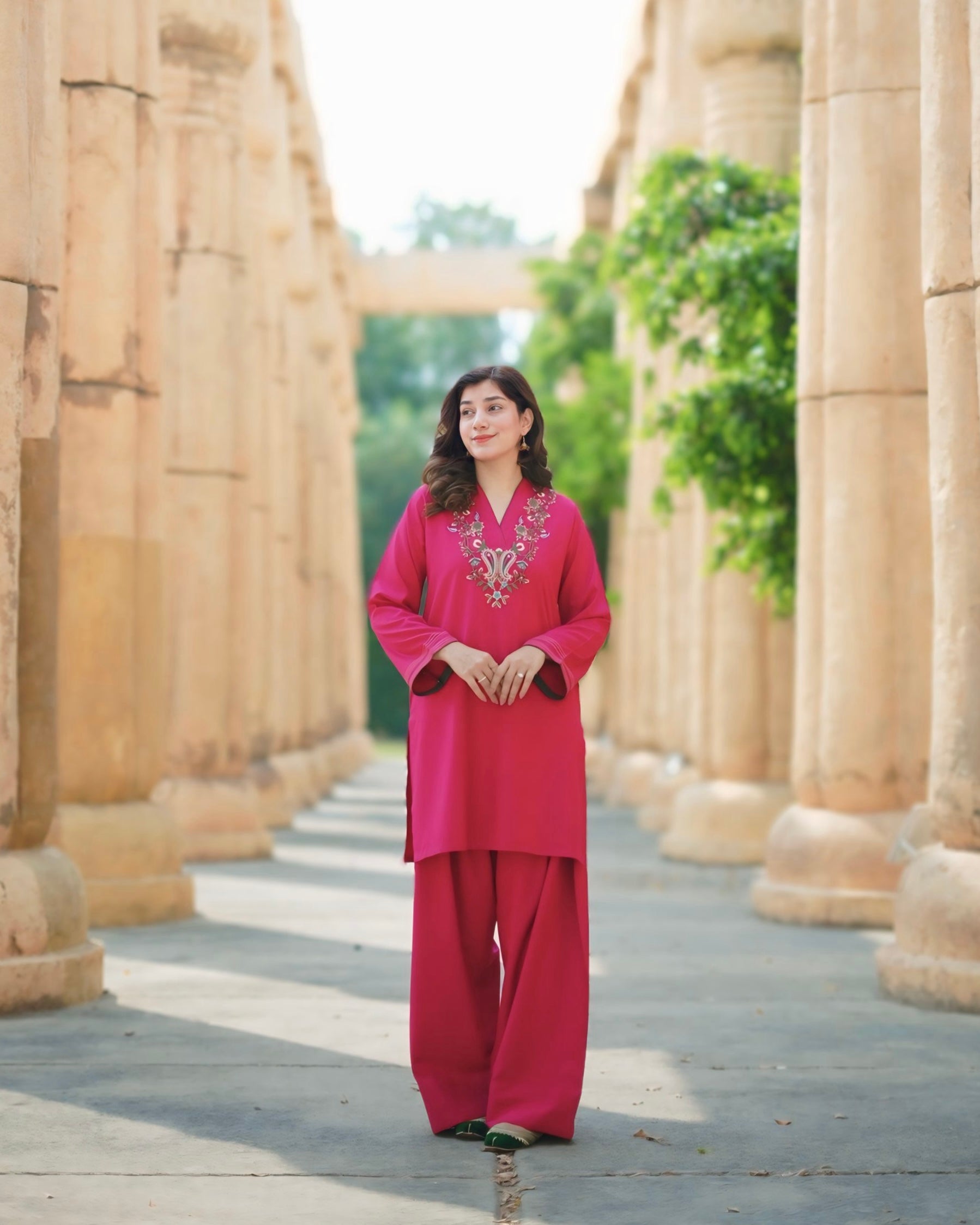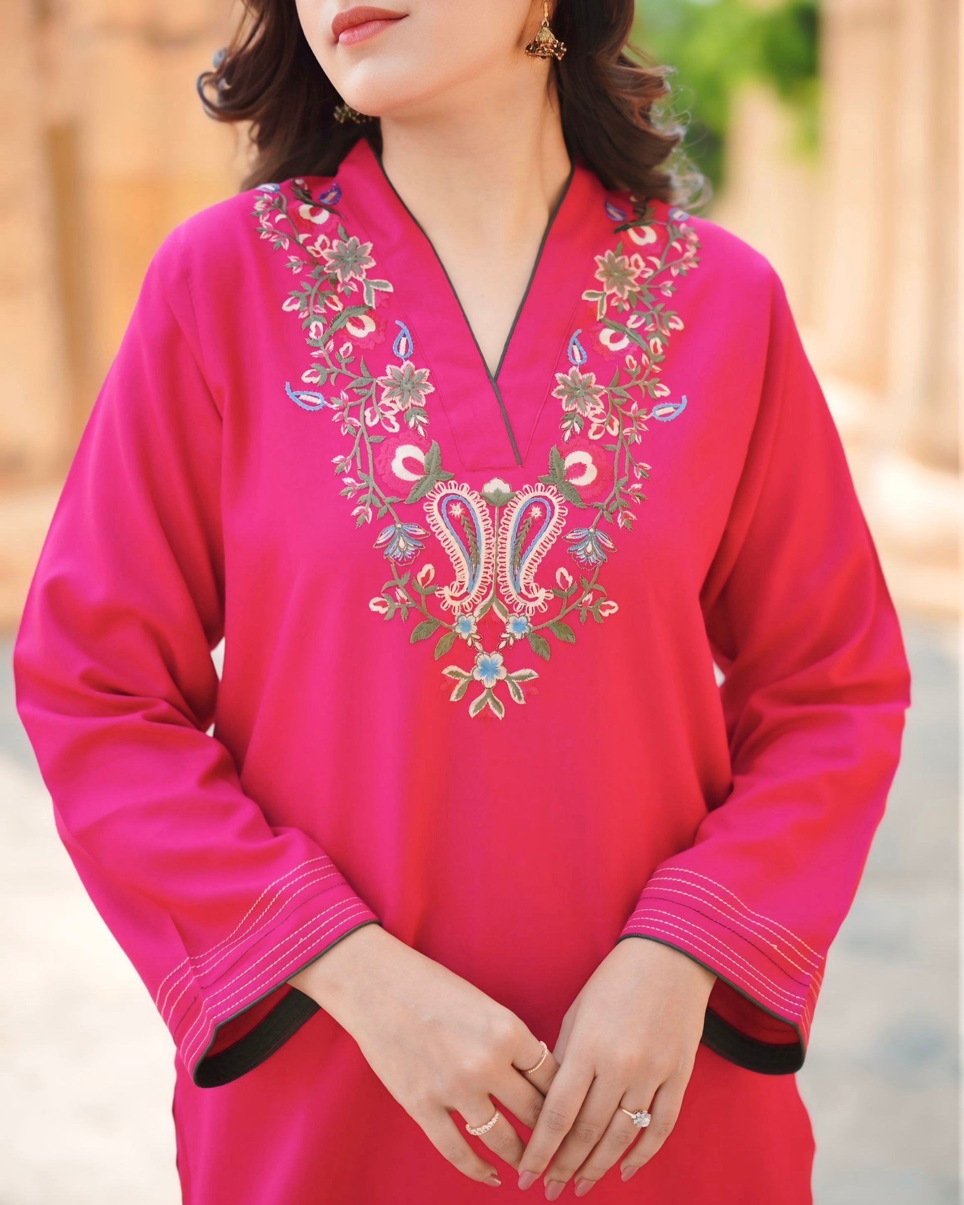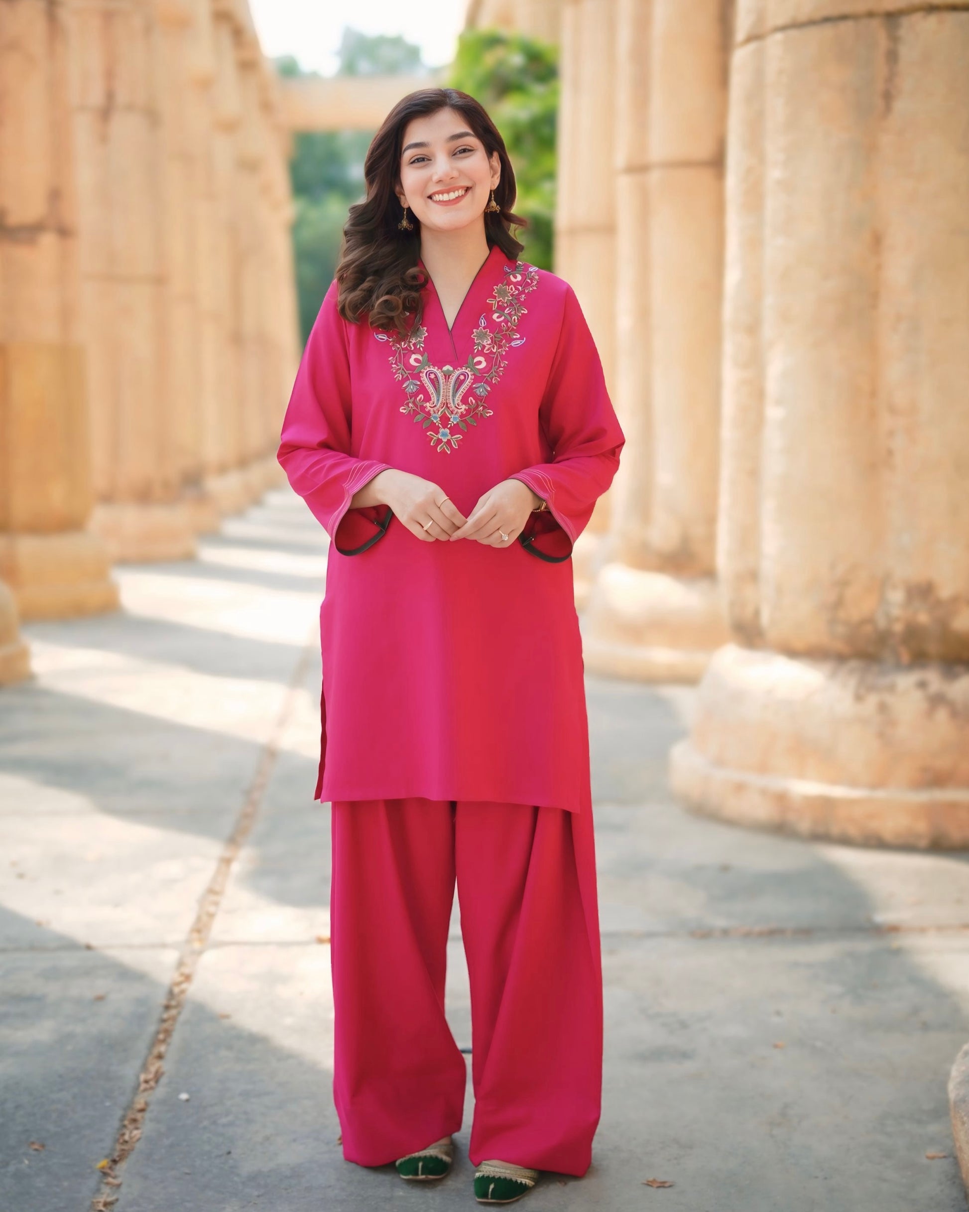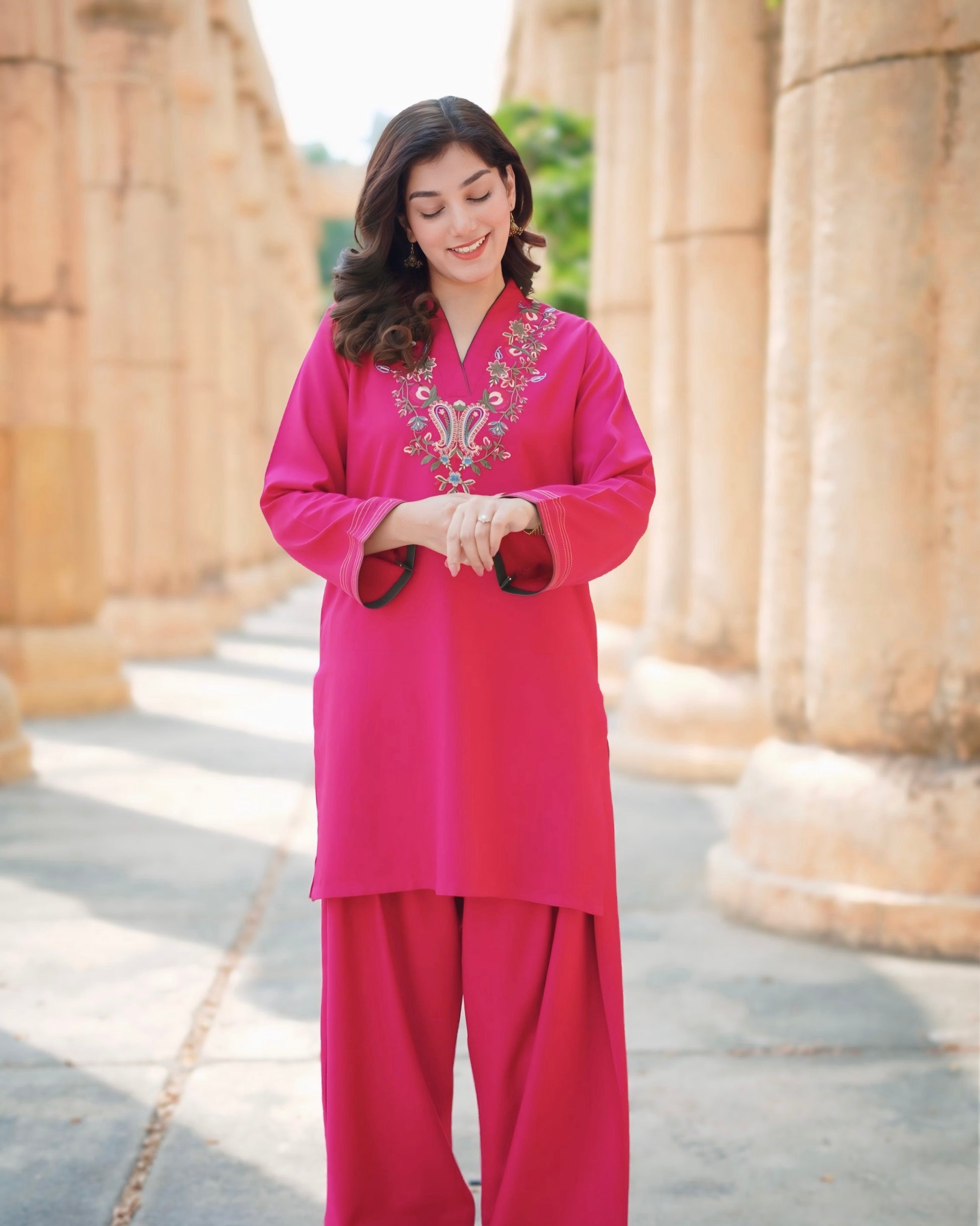 Experience style with our hot pink ensemble. This winter collection piece features short shirt with farshi shalwar. This stitched 2 piece has elegant embroidery on neckline.