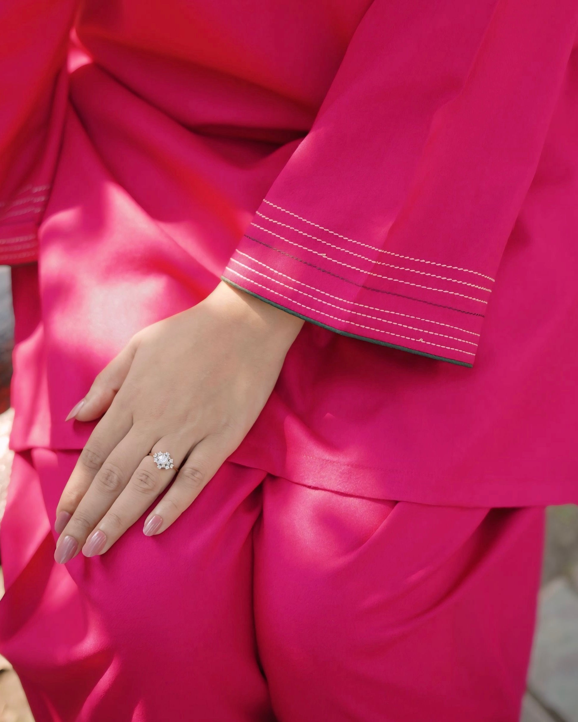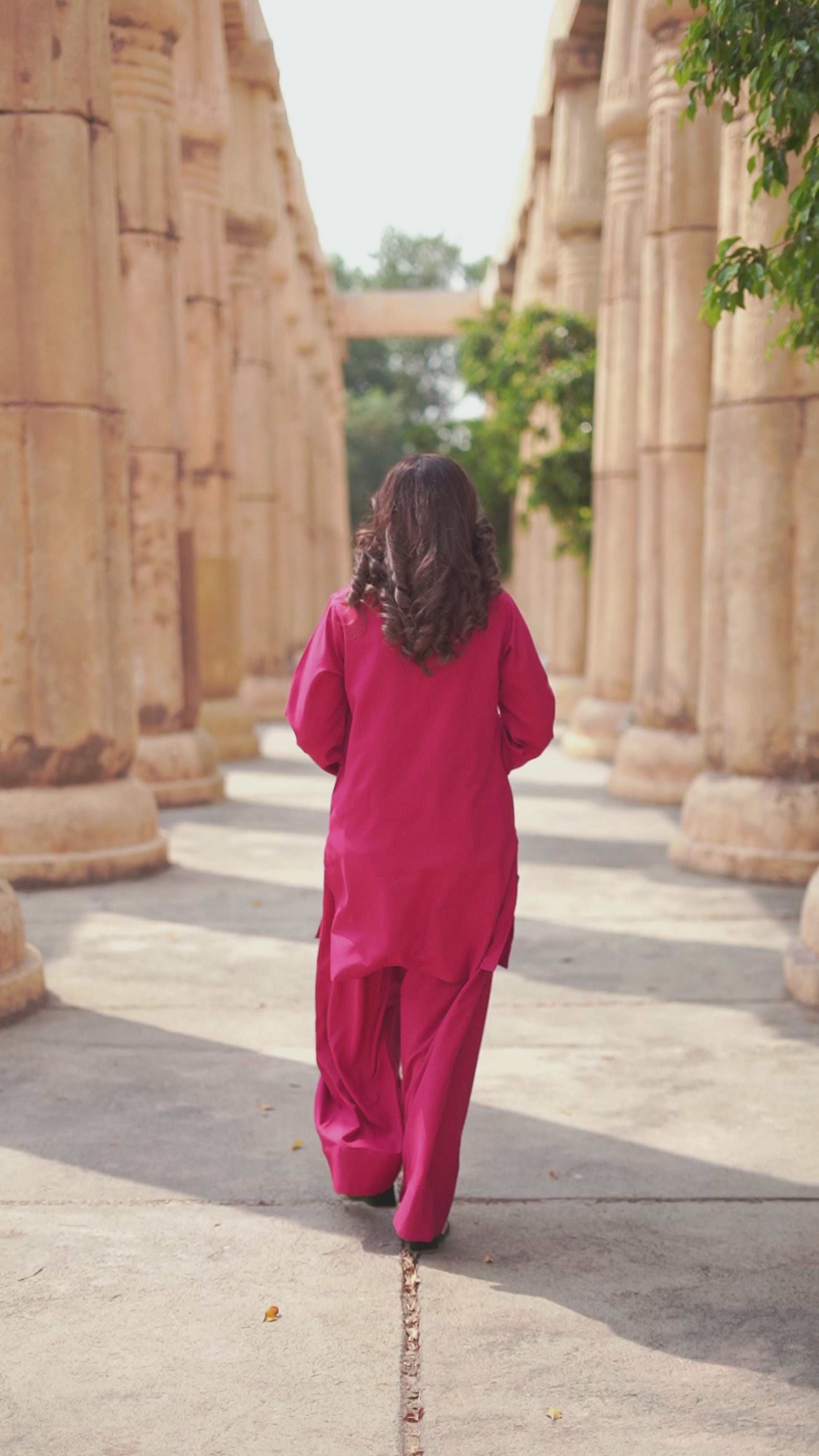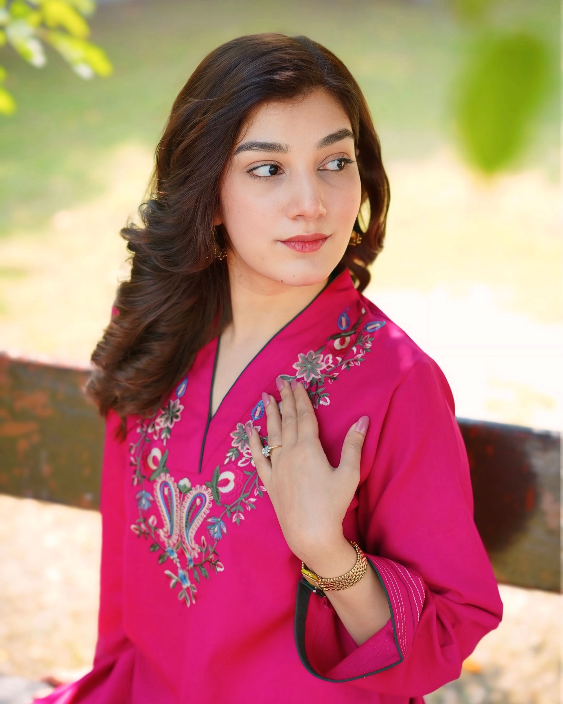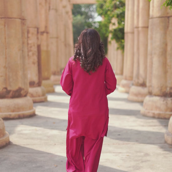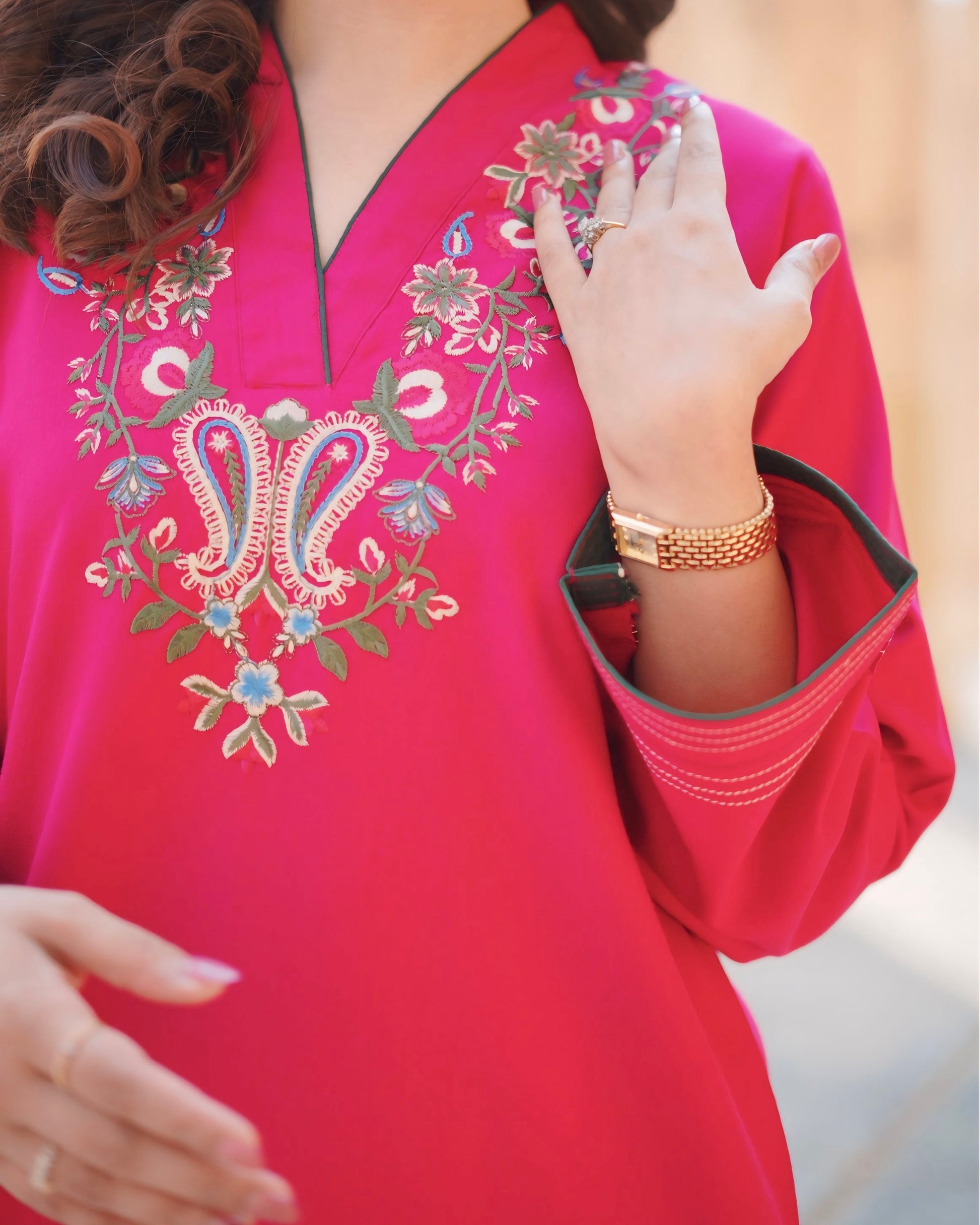 Experience style with our hot pink ensemble. This winter collection piece features short shirt with farshi shalwar. This stitched 2 piece has elegant embroidery on neckline.