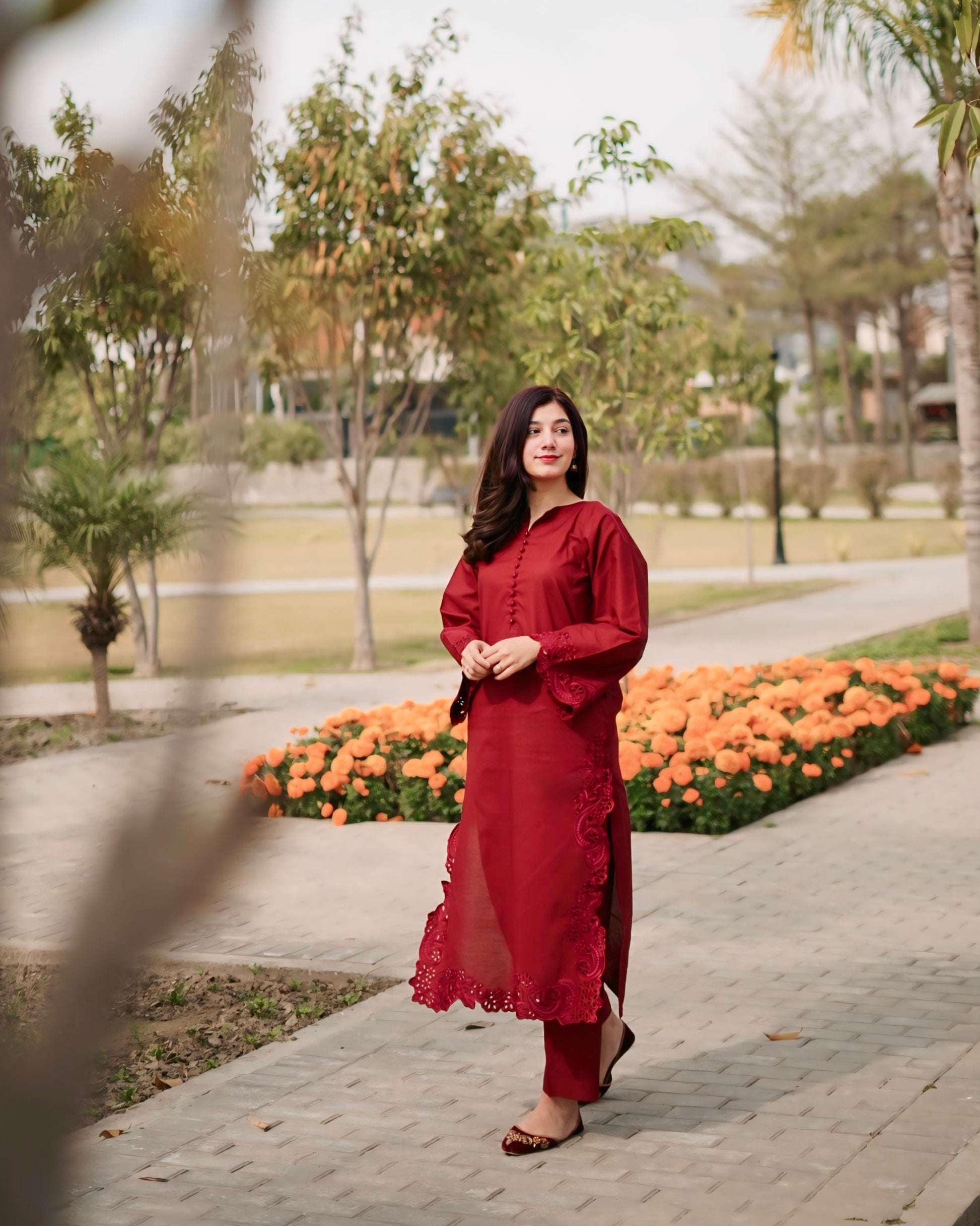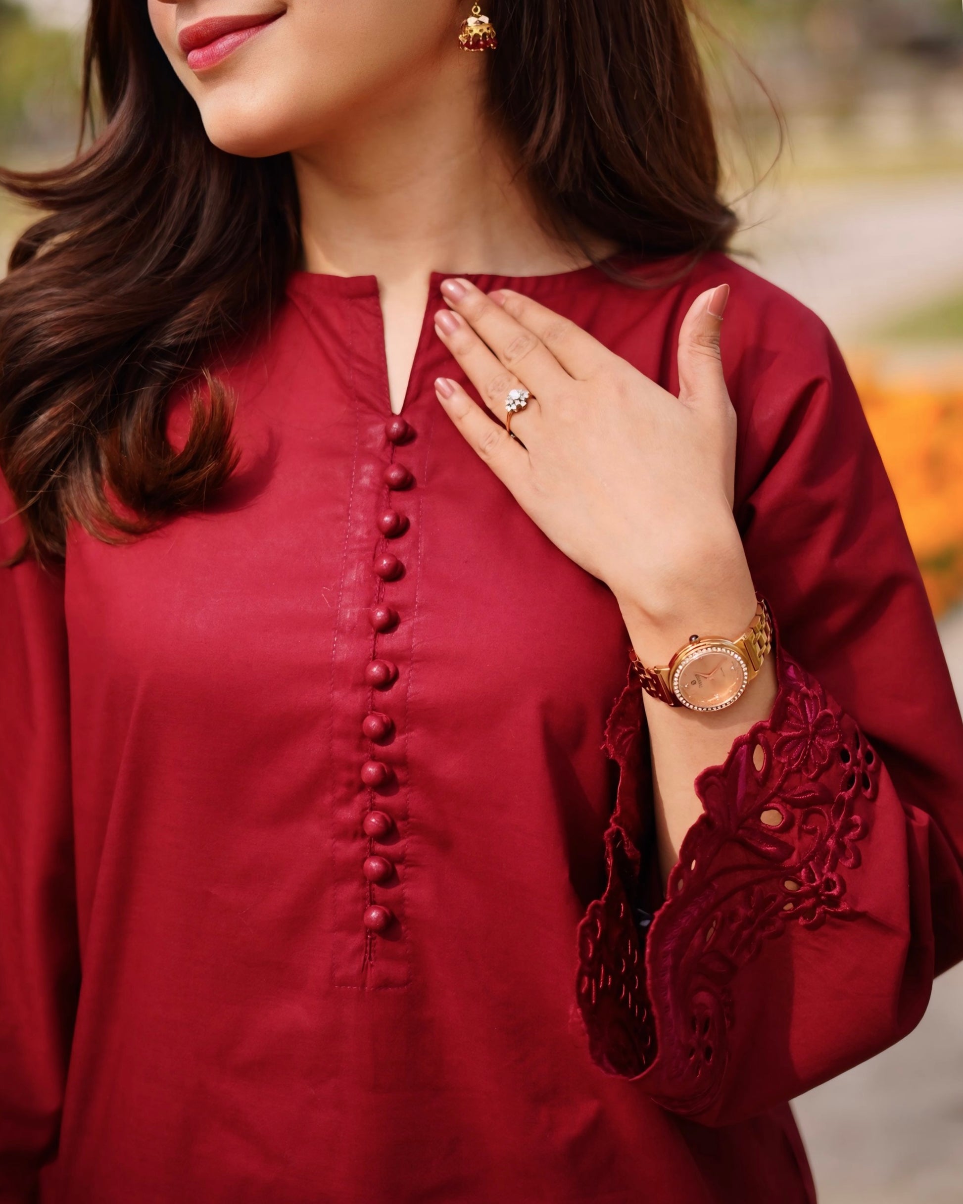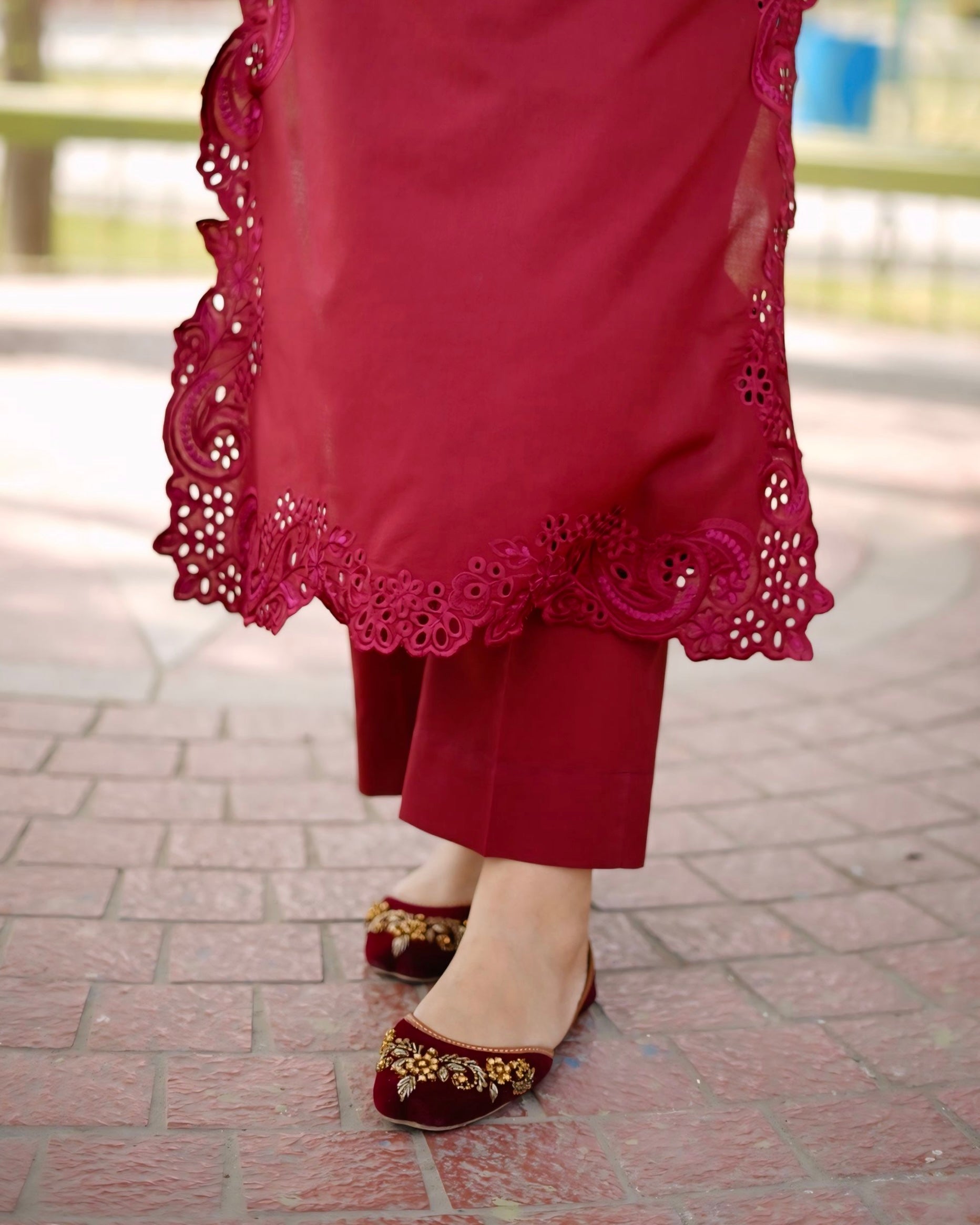 Step into effortless elegance with our sophisticated maroon ensemble. This timeless outfit features refined embroidery on the shirt paired with a straight-cut trouser.