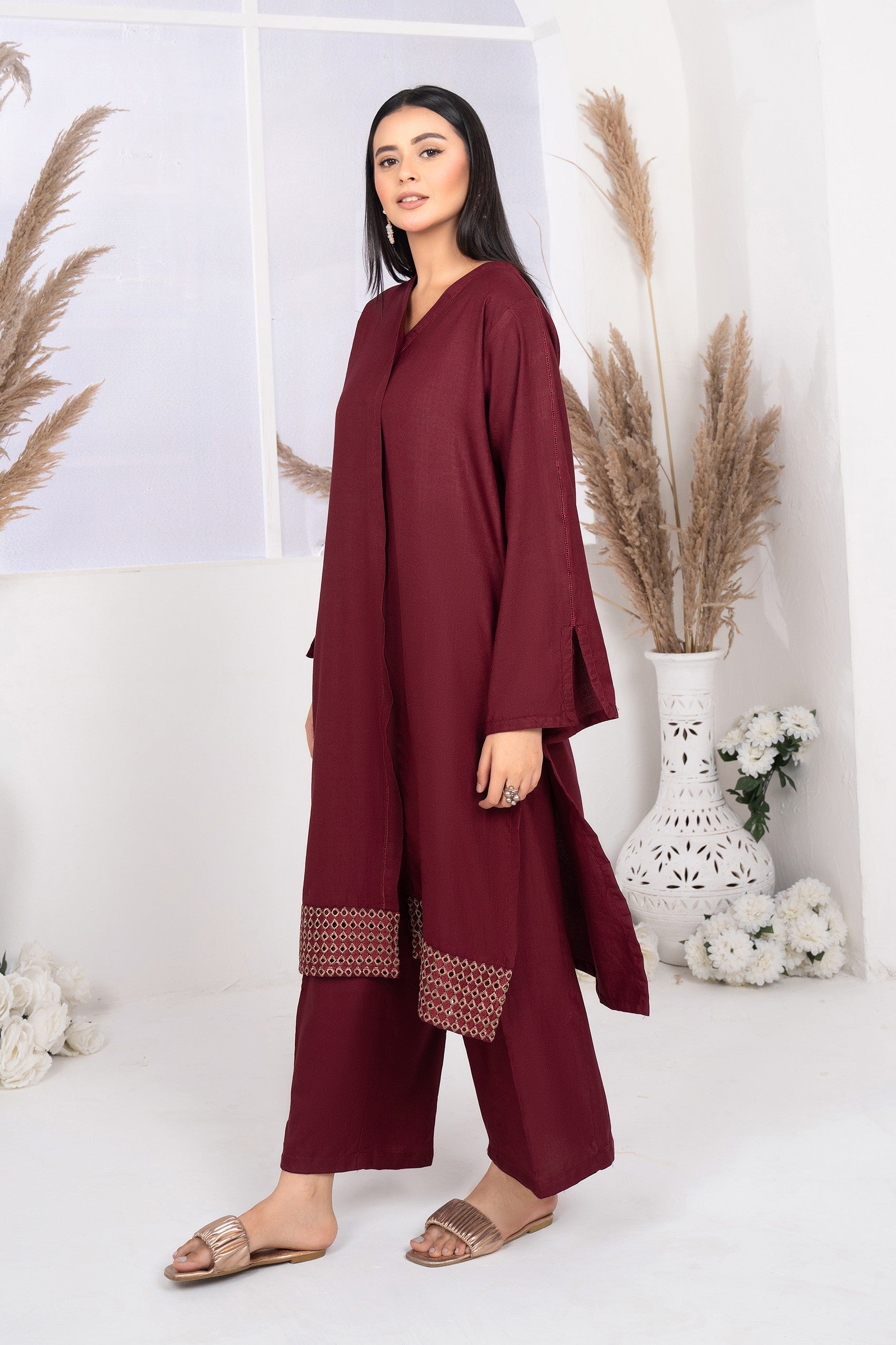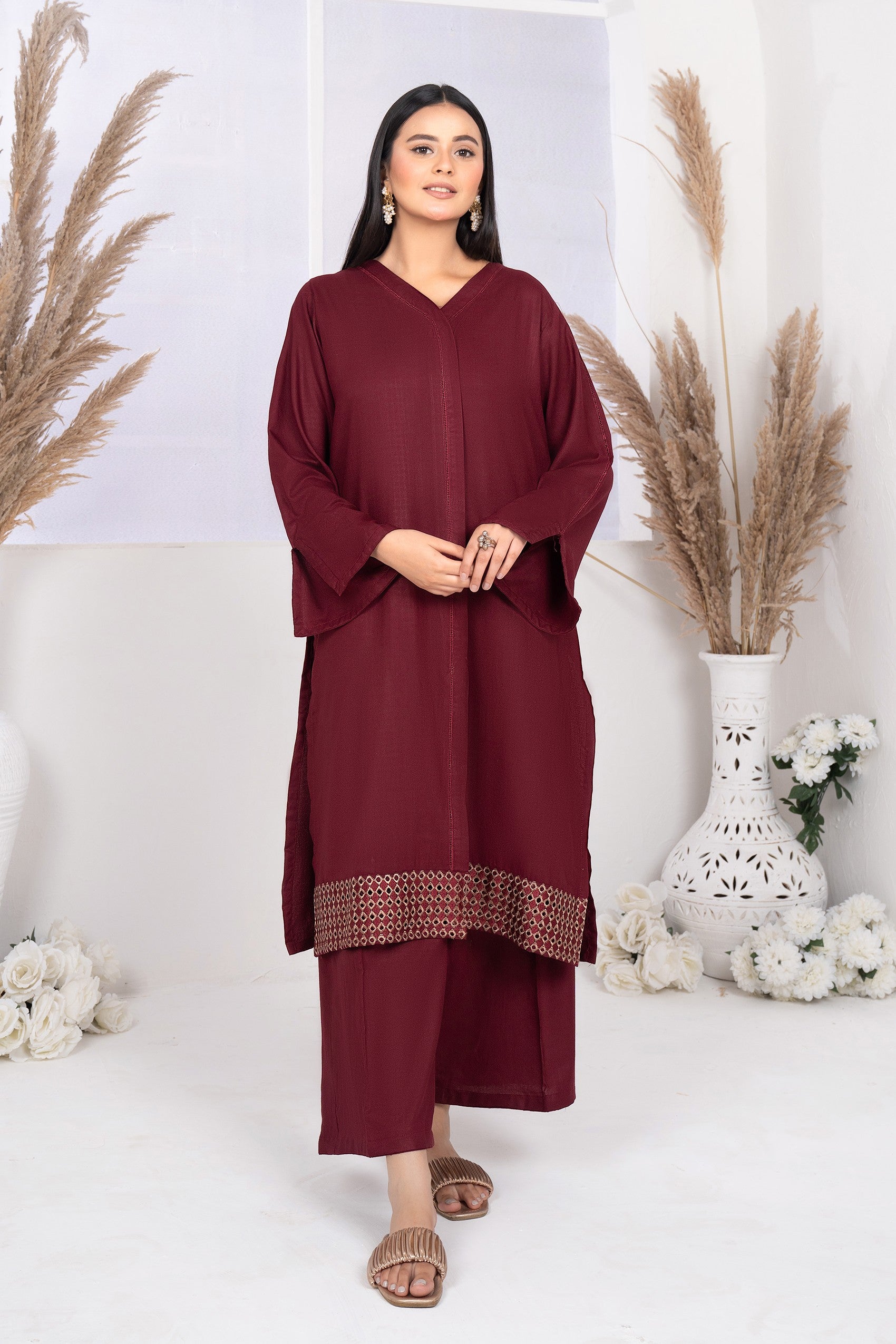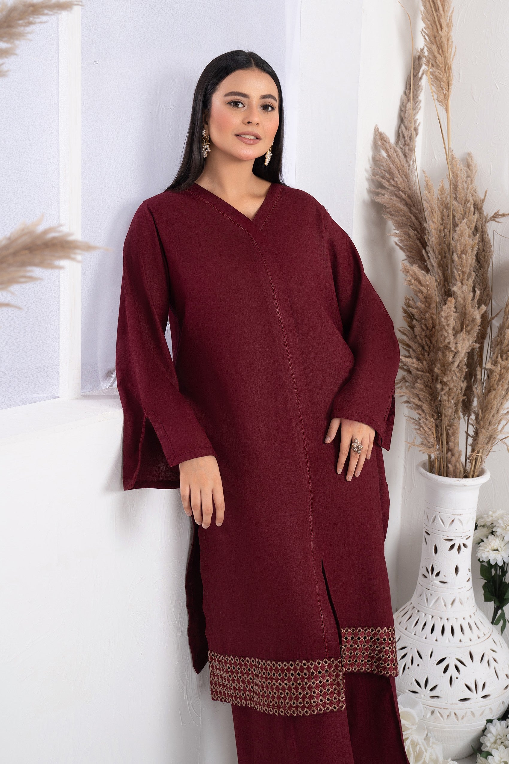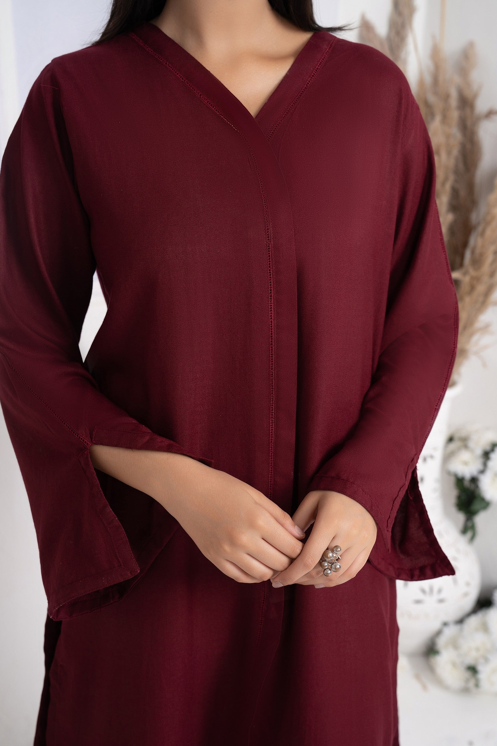Embrace winter sophistication with Layl, a deep maroon two-piece crafted from soft marina fabric for warmth and comfort. Designed with a flowy cut, the outfit offers a relaxed, straight silhouette. The shirt has a chic V-neckline with a slit at front hemline, flared sleeves for an easy, comfortable fit. Paired with wide-leg, straight-cut pants, this ensemble effortlessly balances casual elegance.