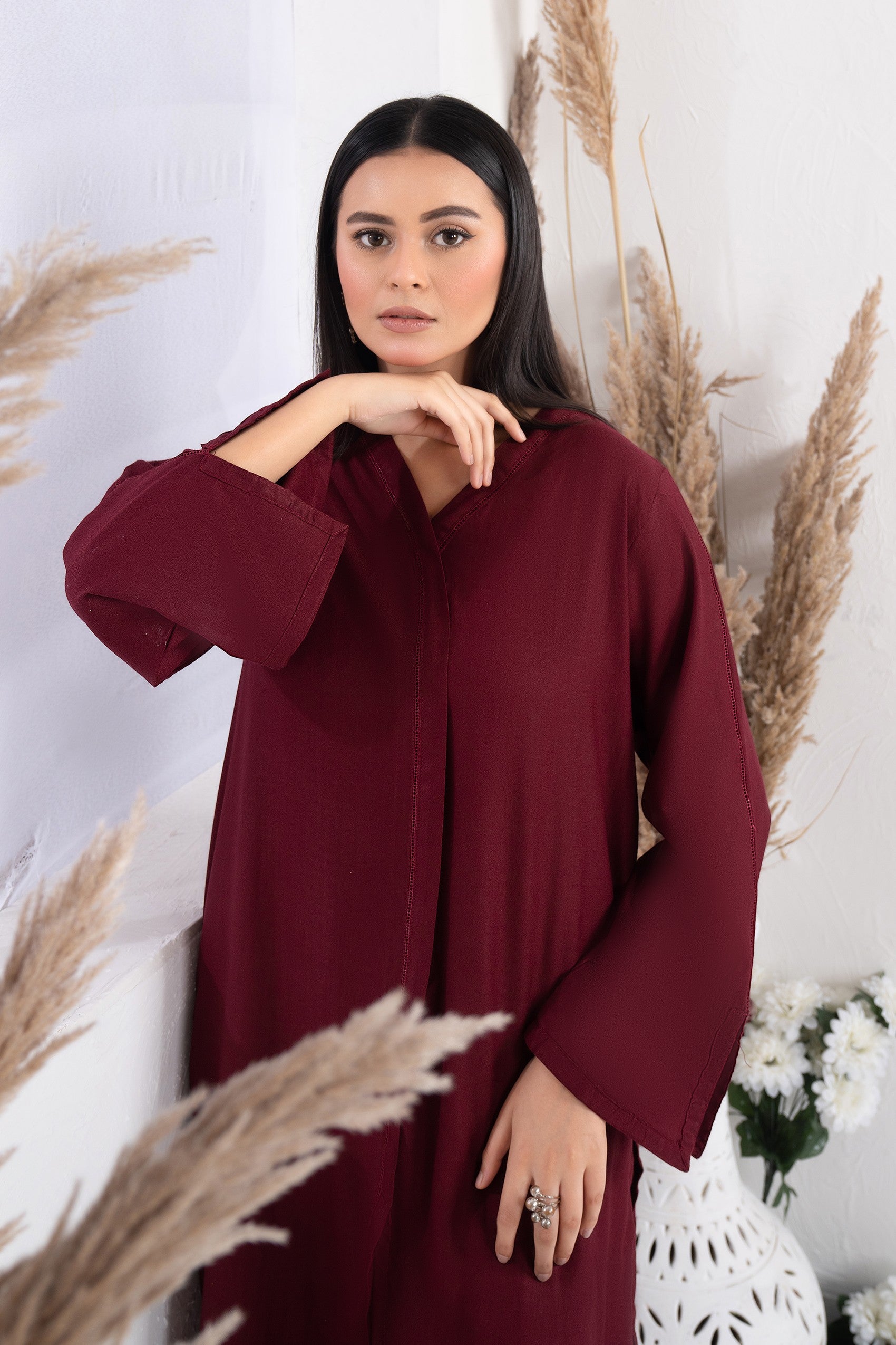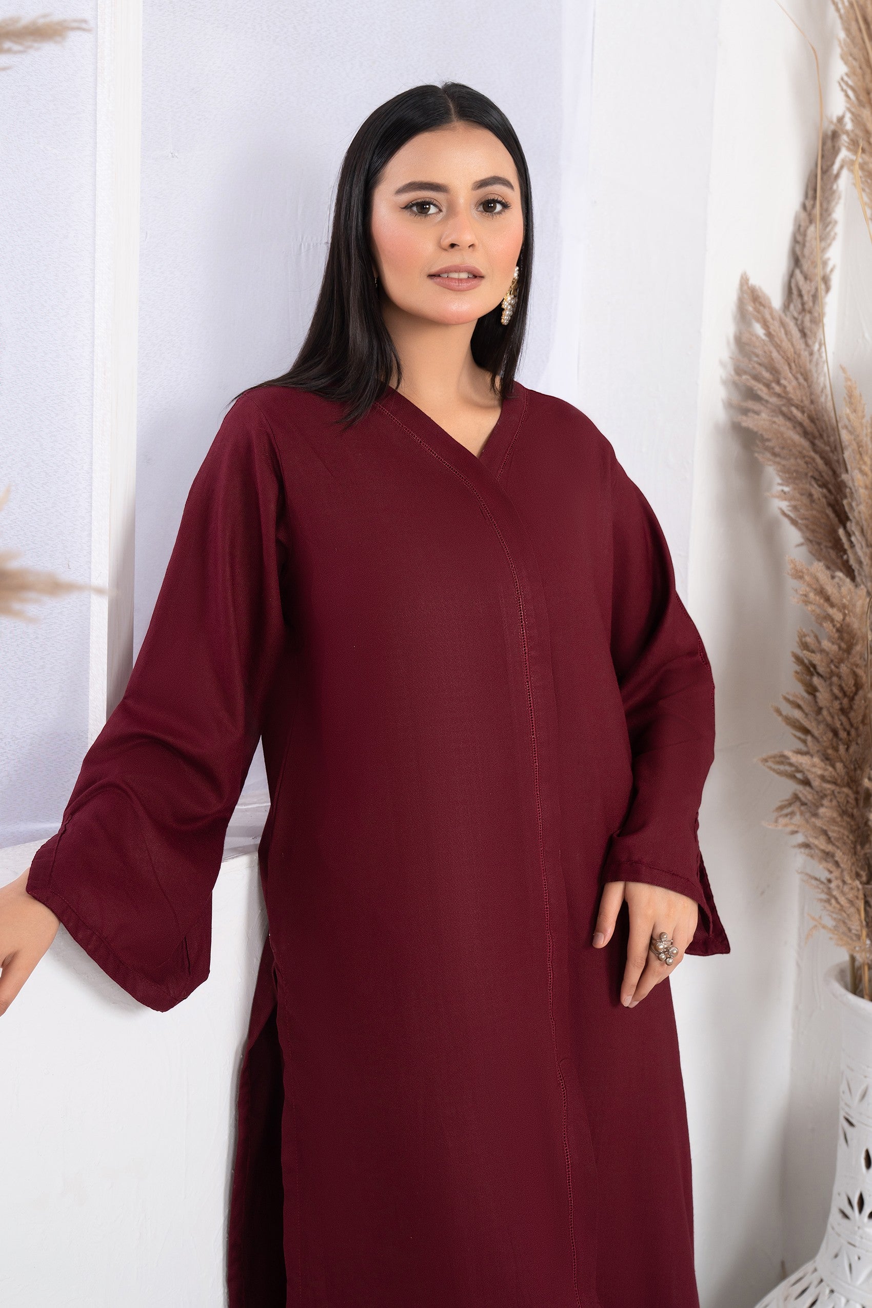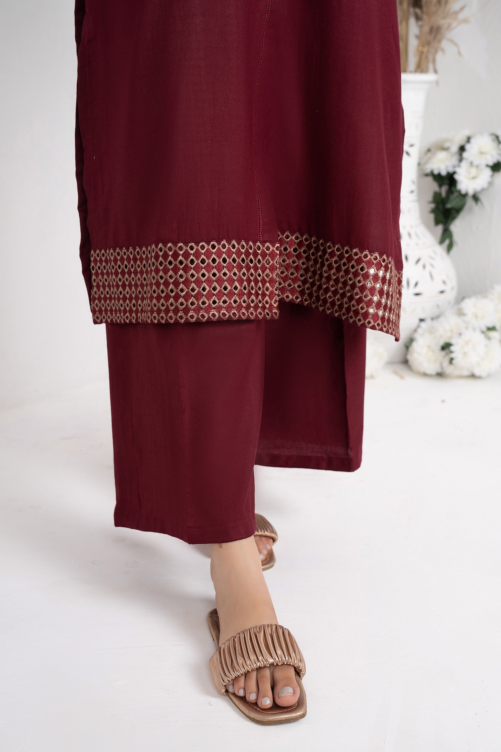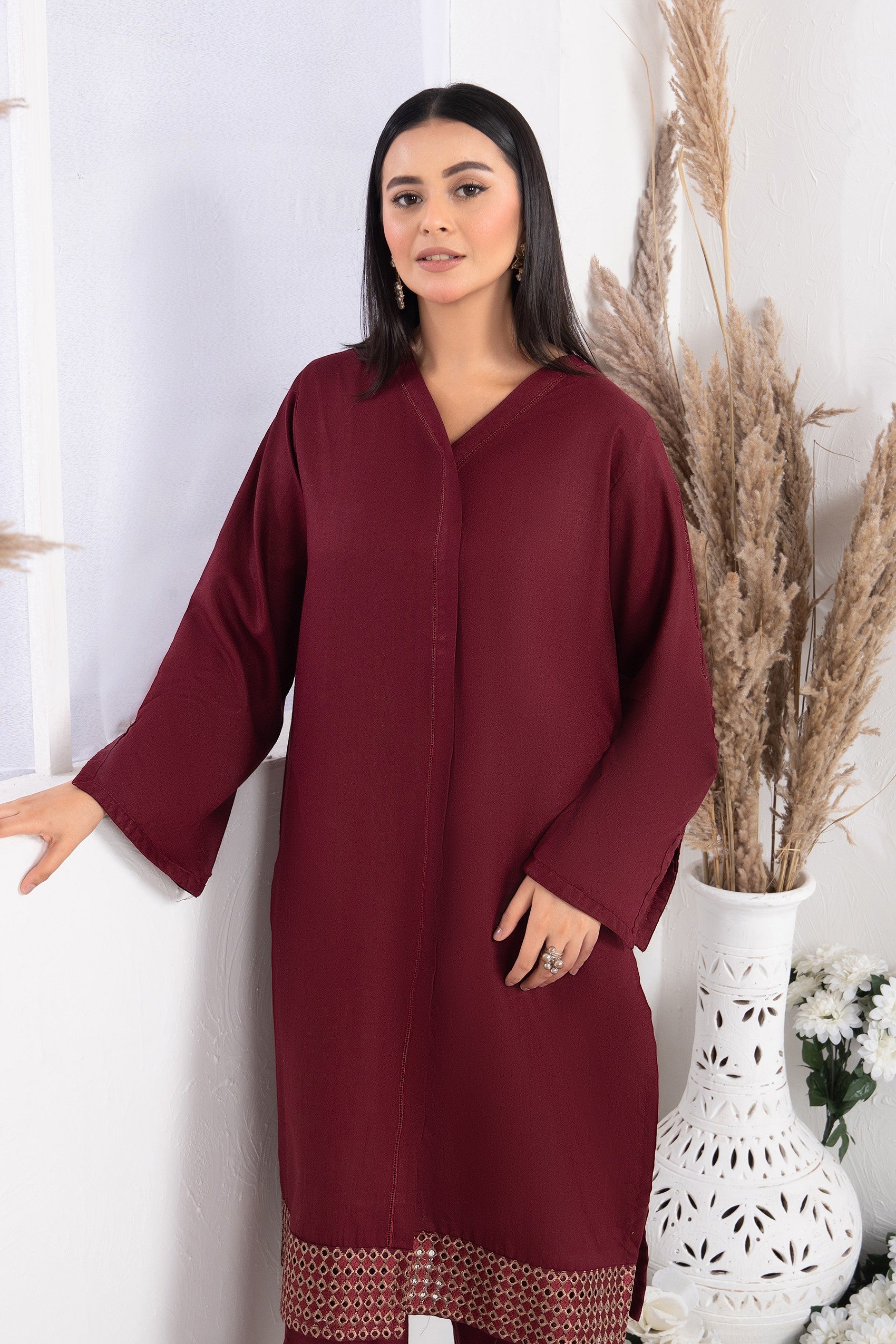 Embrace winter sophistication with Layl, a deep maroon two-piece crafted from soft marina fabric for warmth and comfort. Designed with a flowy cut, the outfit offers a relaxed, straight silhouette. The shirt has a chic V-neckline with a slit at front hemline, flared sleeves for an easy, comfortable fit. Paired with wide-leg, straight-cut pants, this ensemble effortlessly balances casual elegance.