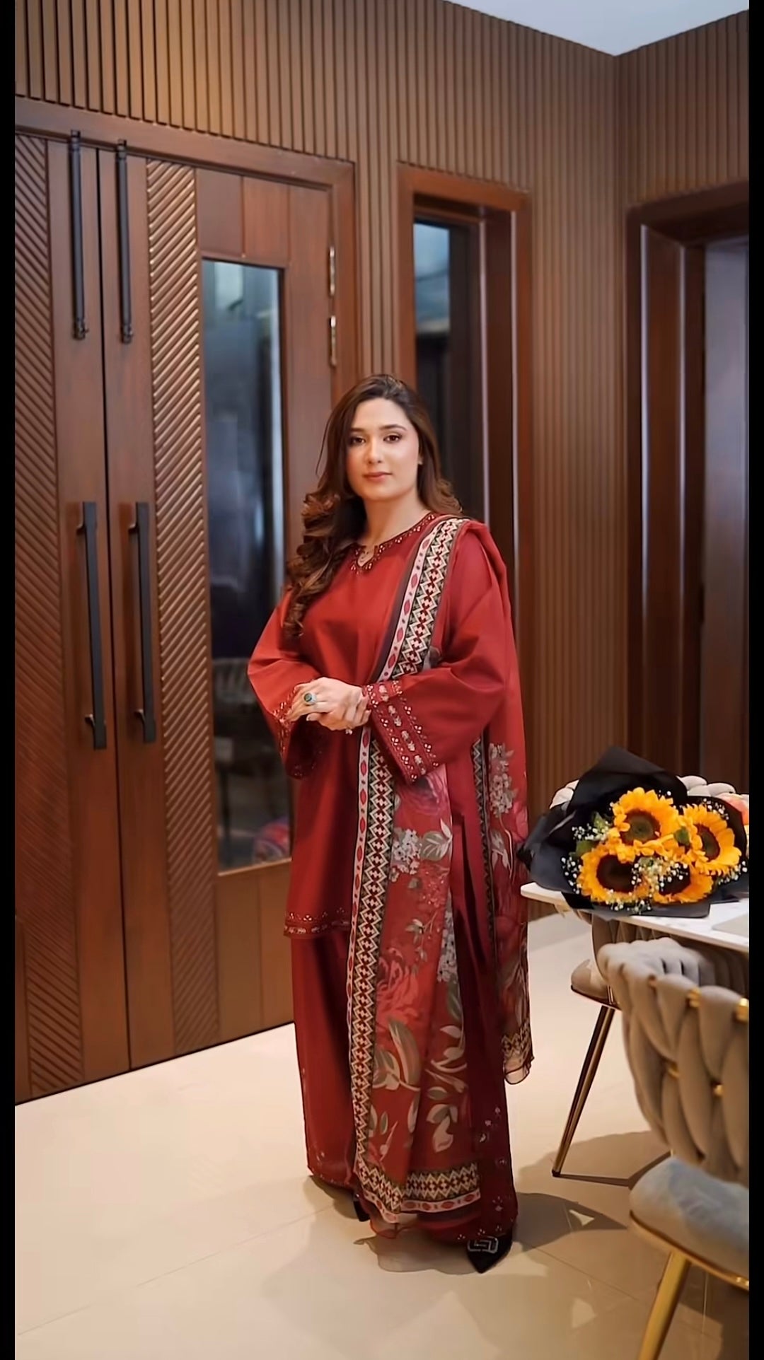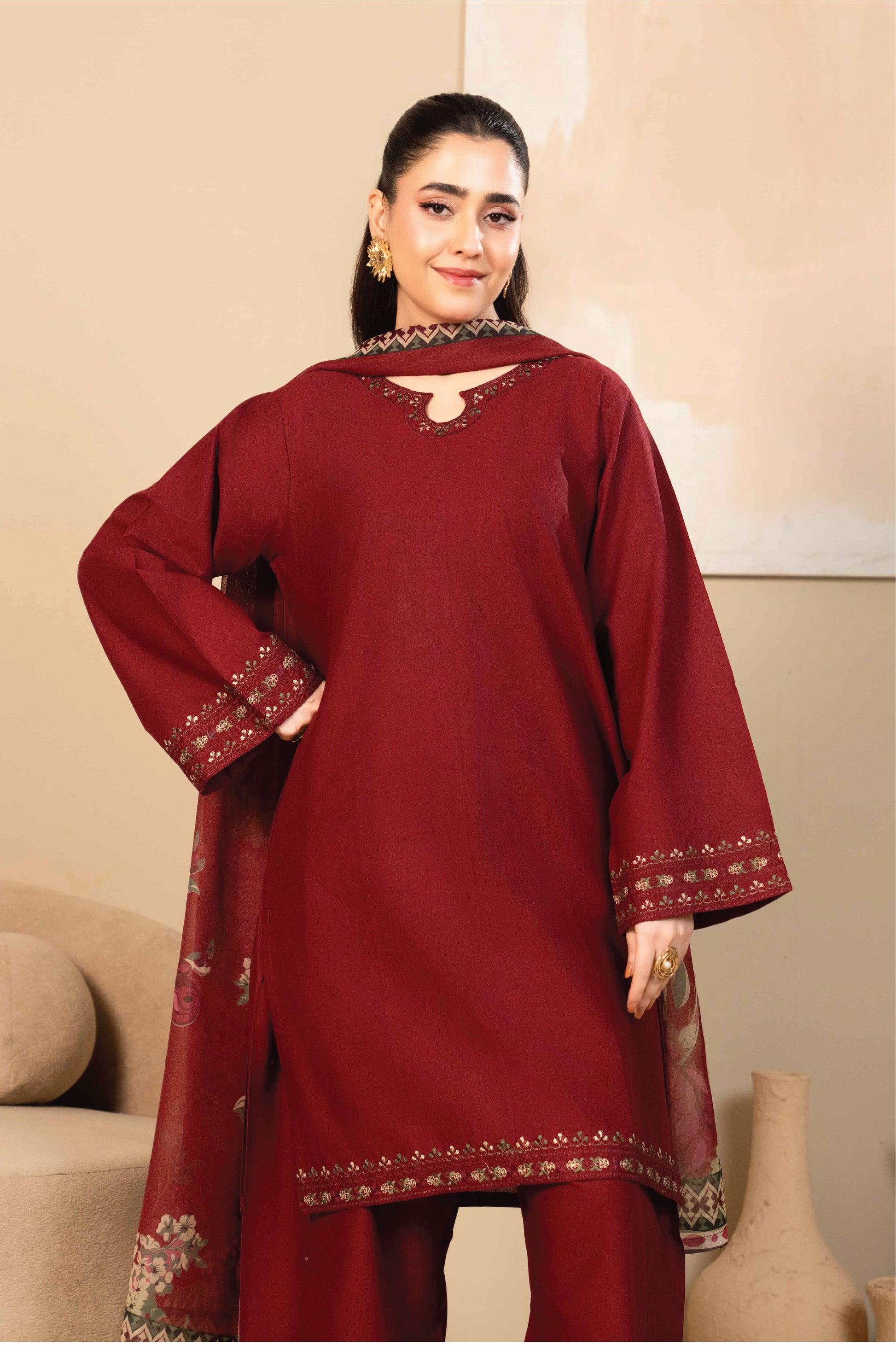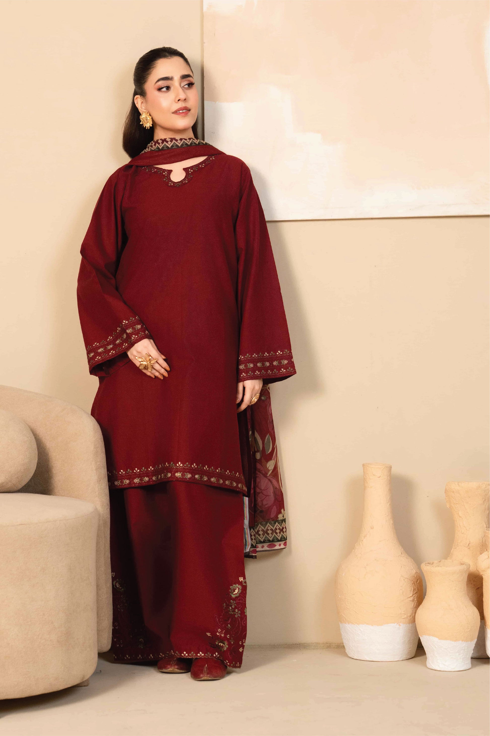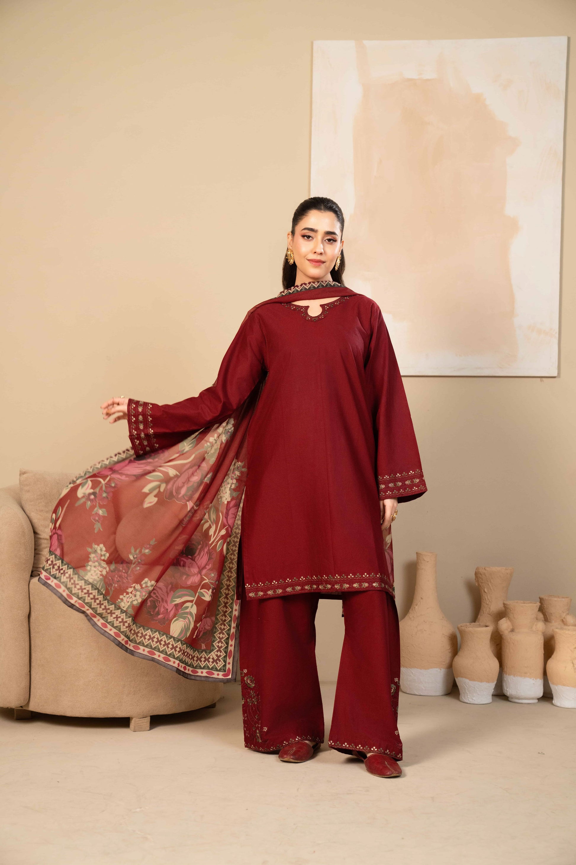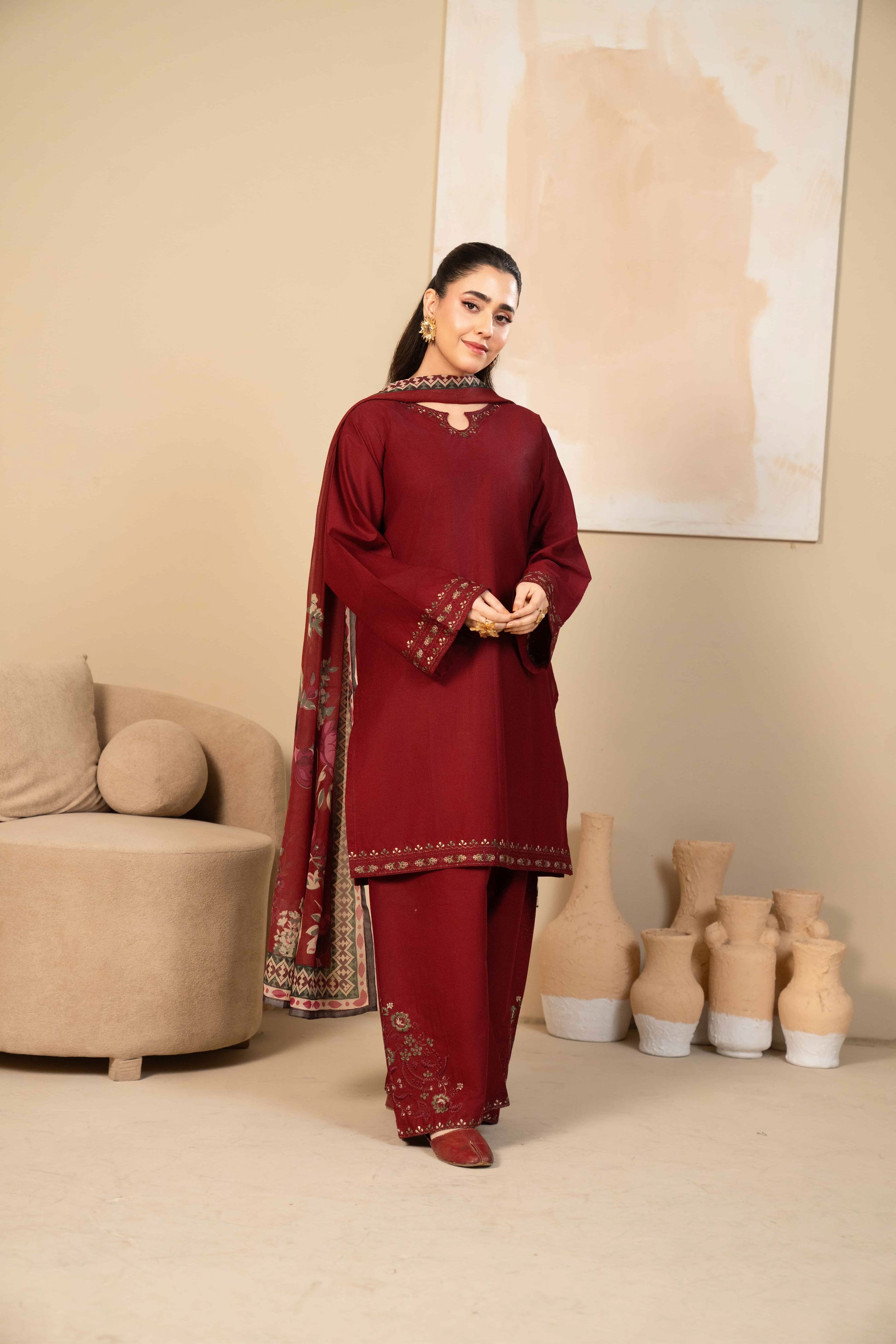 Stitched 3 piece - A timeless maroon embroidered short shirt paired with an embroidered farshi shalwar, designed to give you that royal, elegant look. Finished with a beautiful printed silk dupatta that adds the perfect contrast to the outfit.