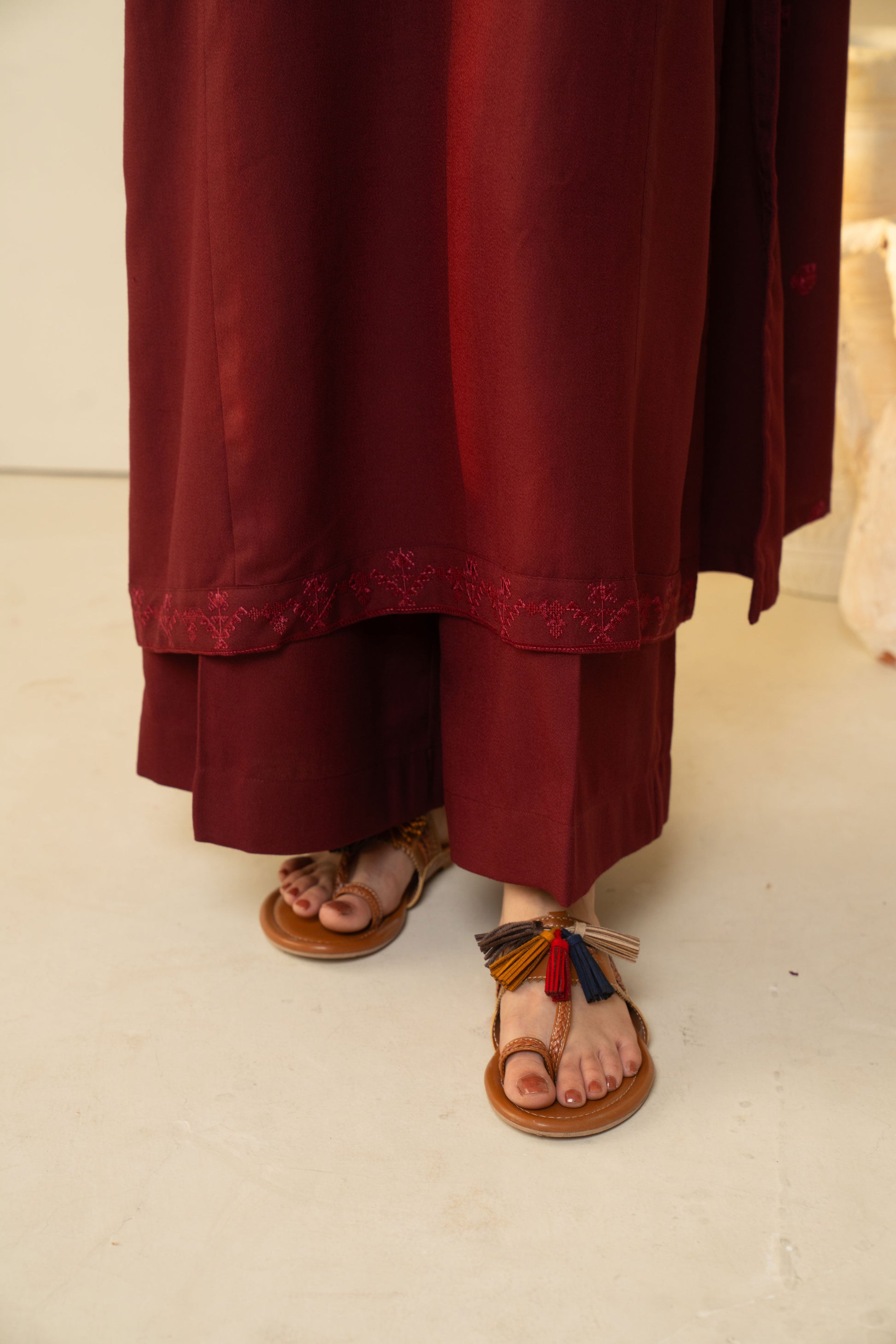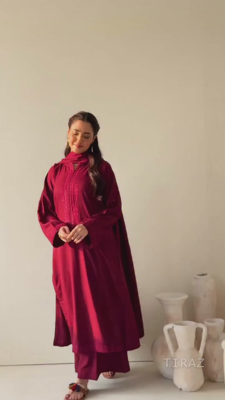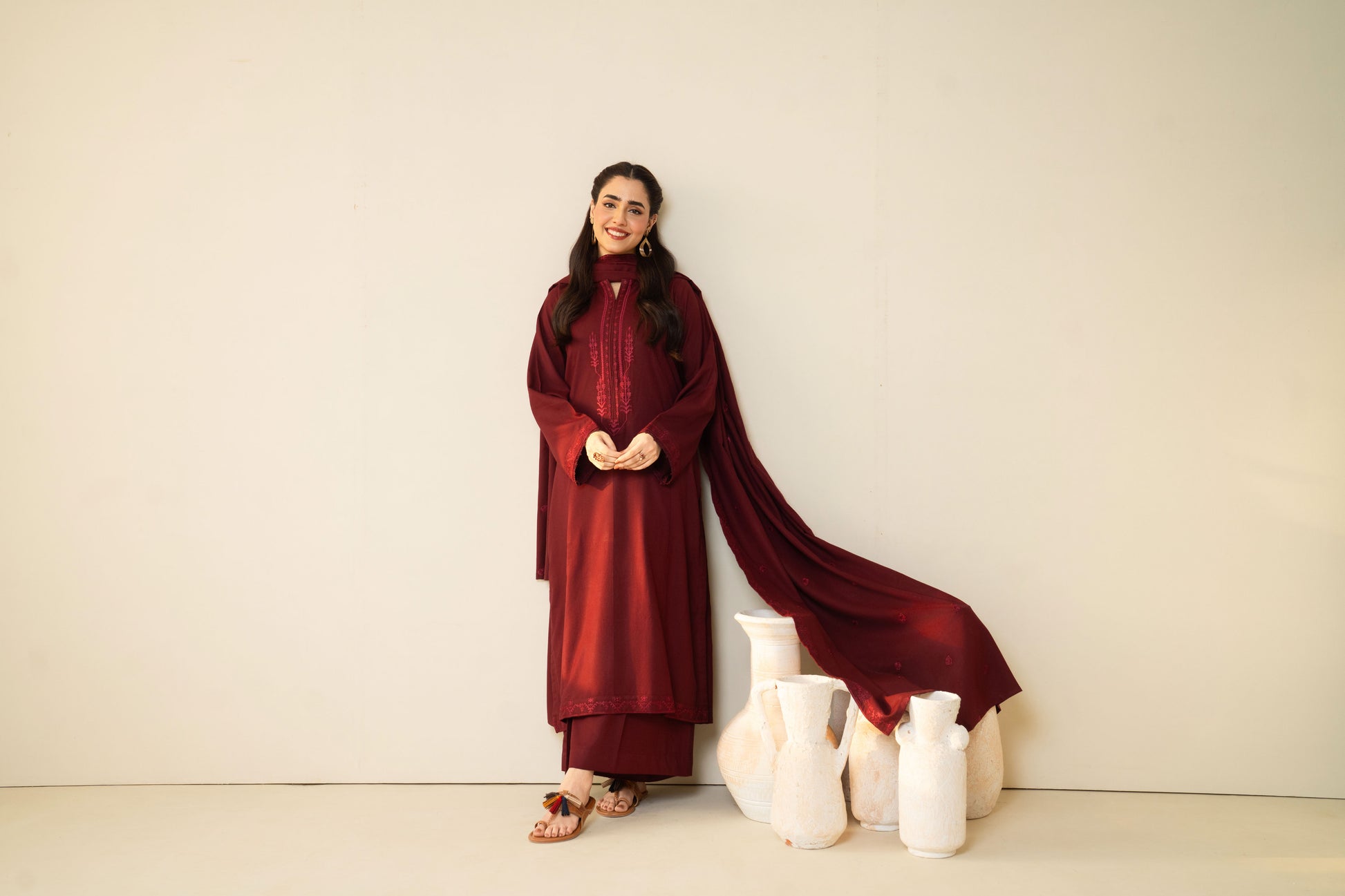 Step into effortless elegance with our sophisticated Maroon ensemble. This timeless outfit features refined embroidery on the shirt paired with a straight trouser and beautifully embroidered shawl.