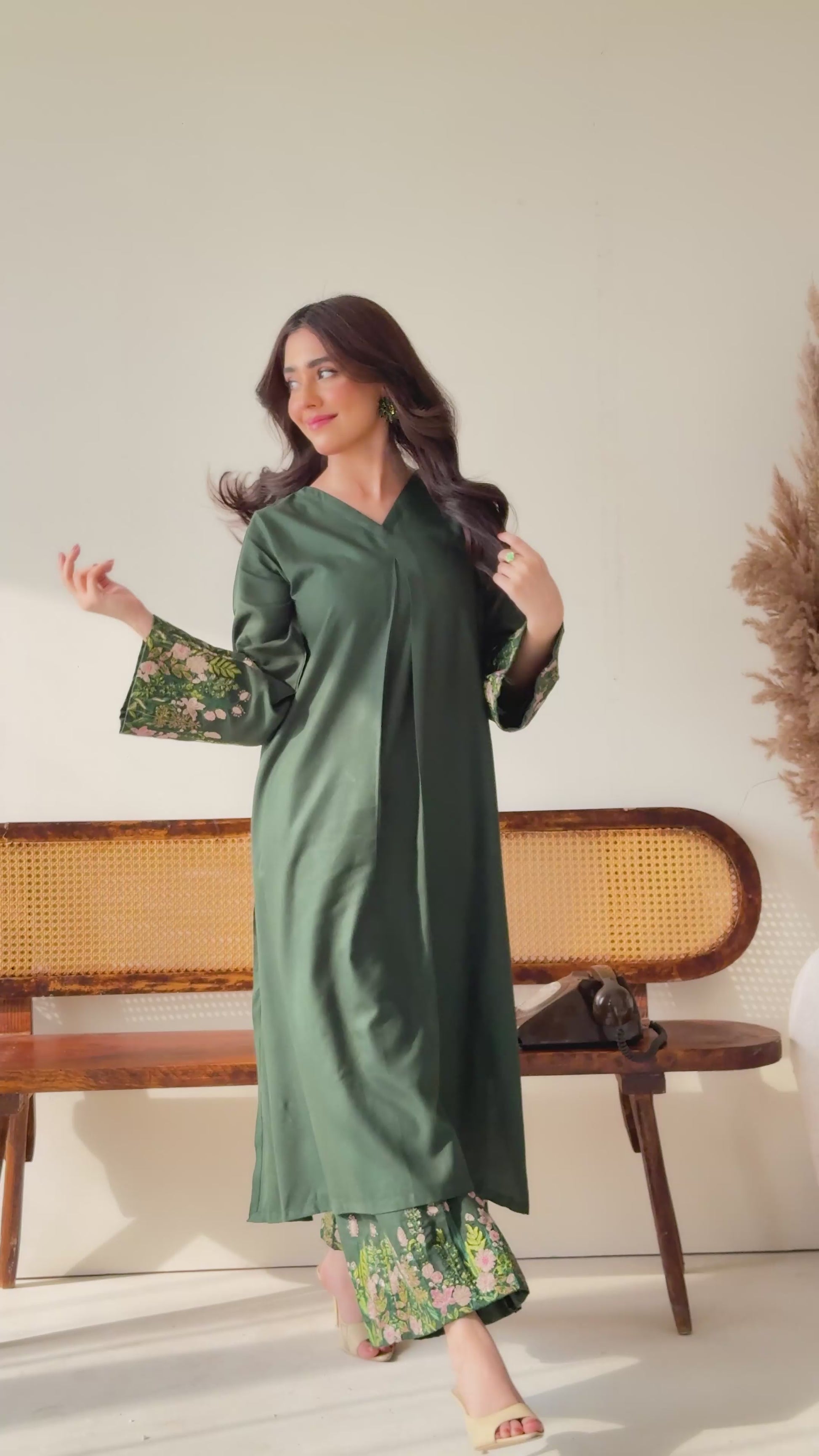 Experience style with our bottle green ensemble. This winter collection piece features A-line long shirt with loose bottom trouser. This stitched 2 piece has embroidery on sleeves and trouser.