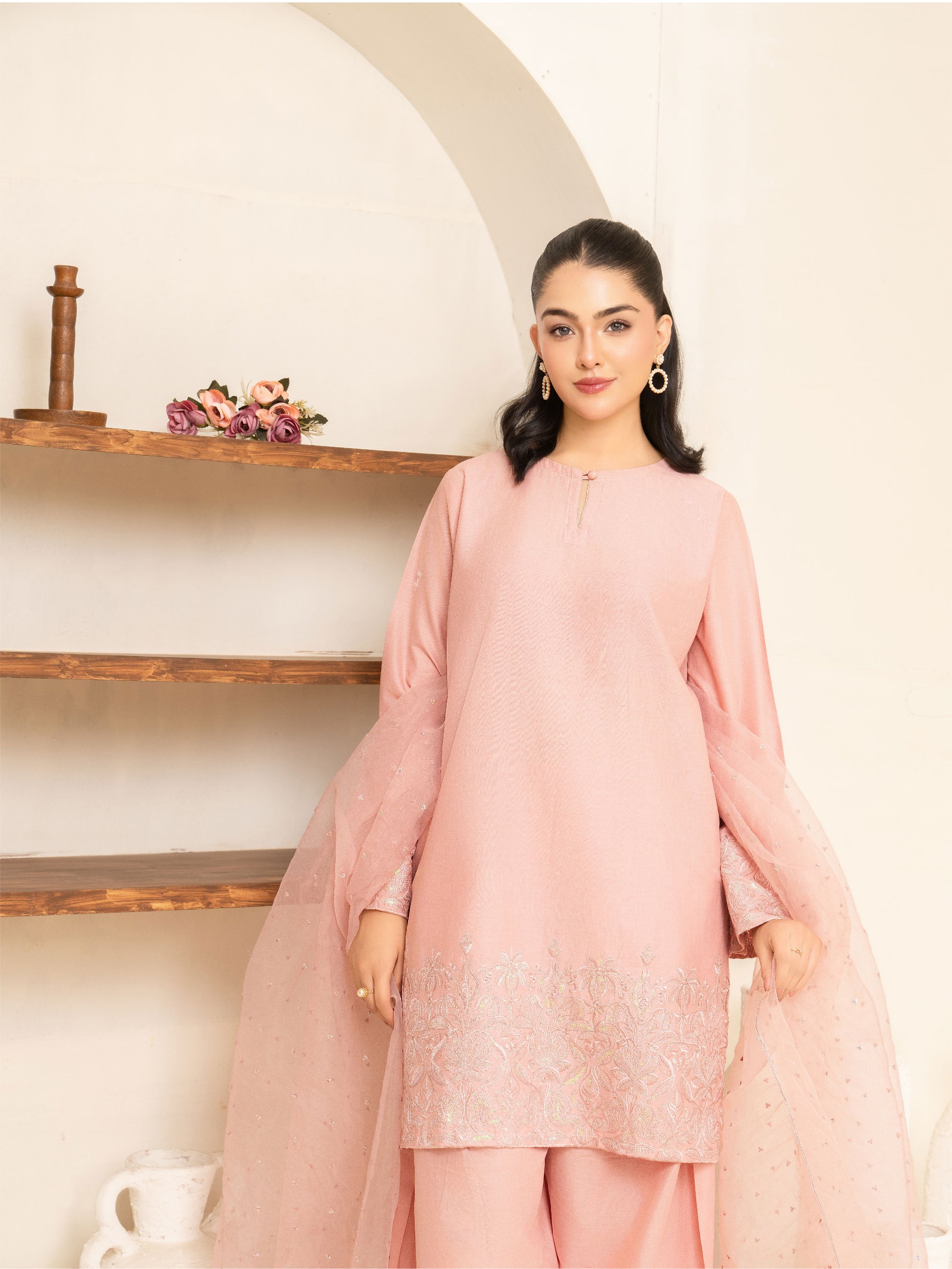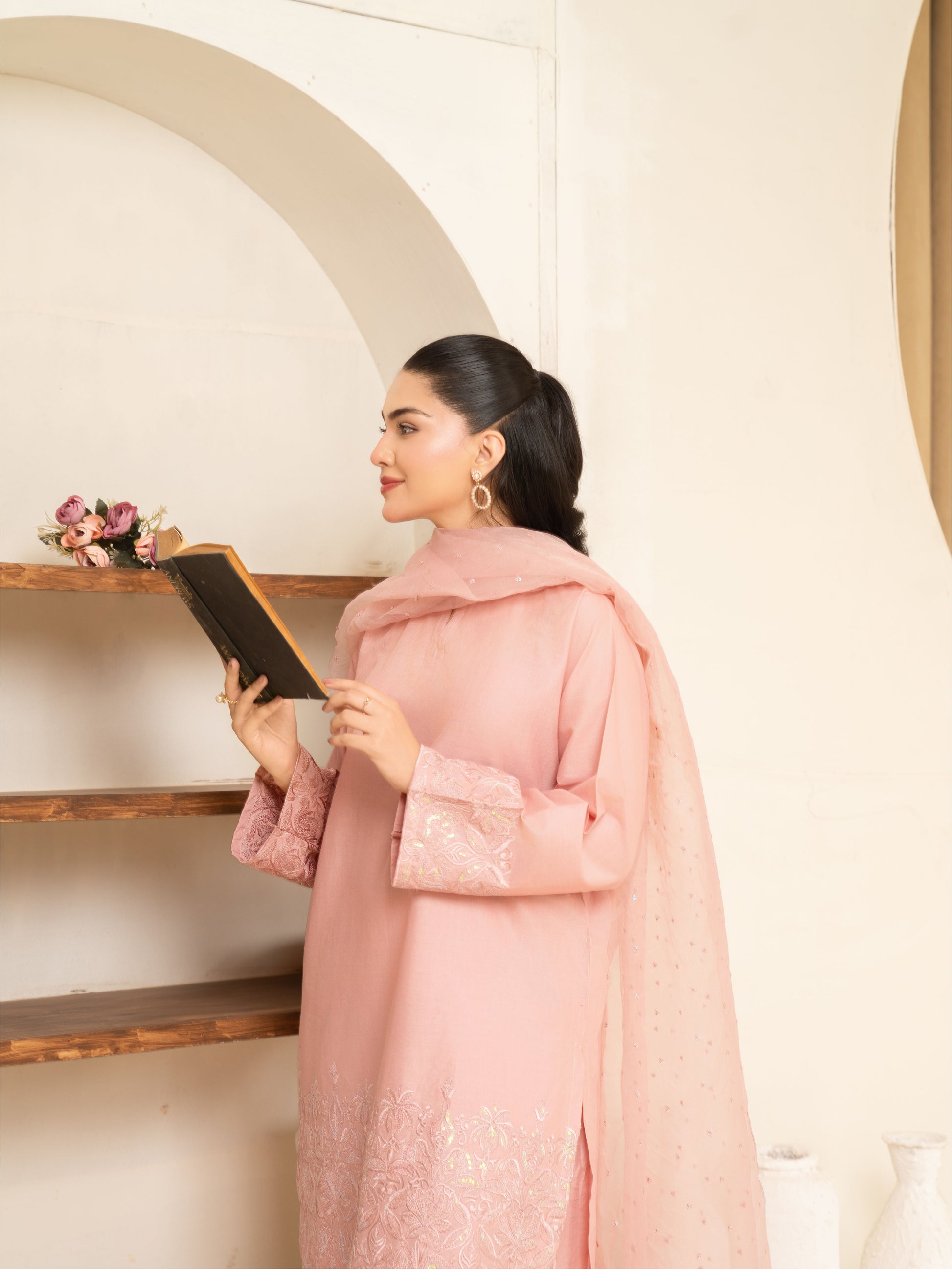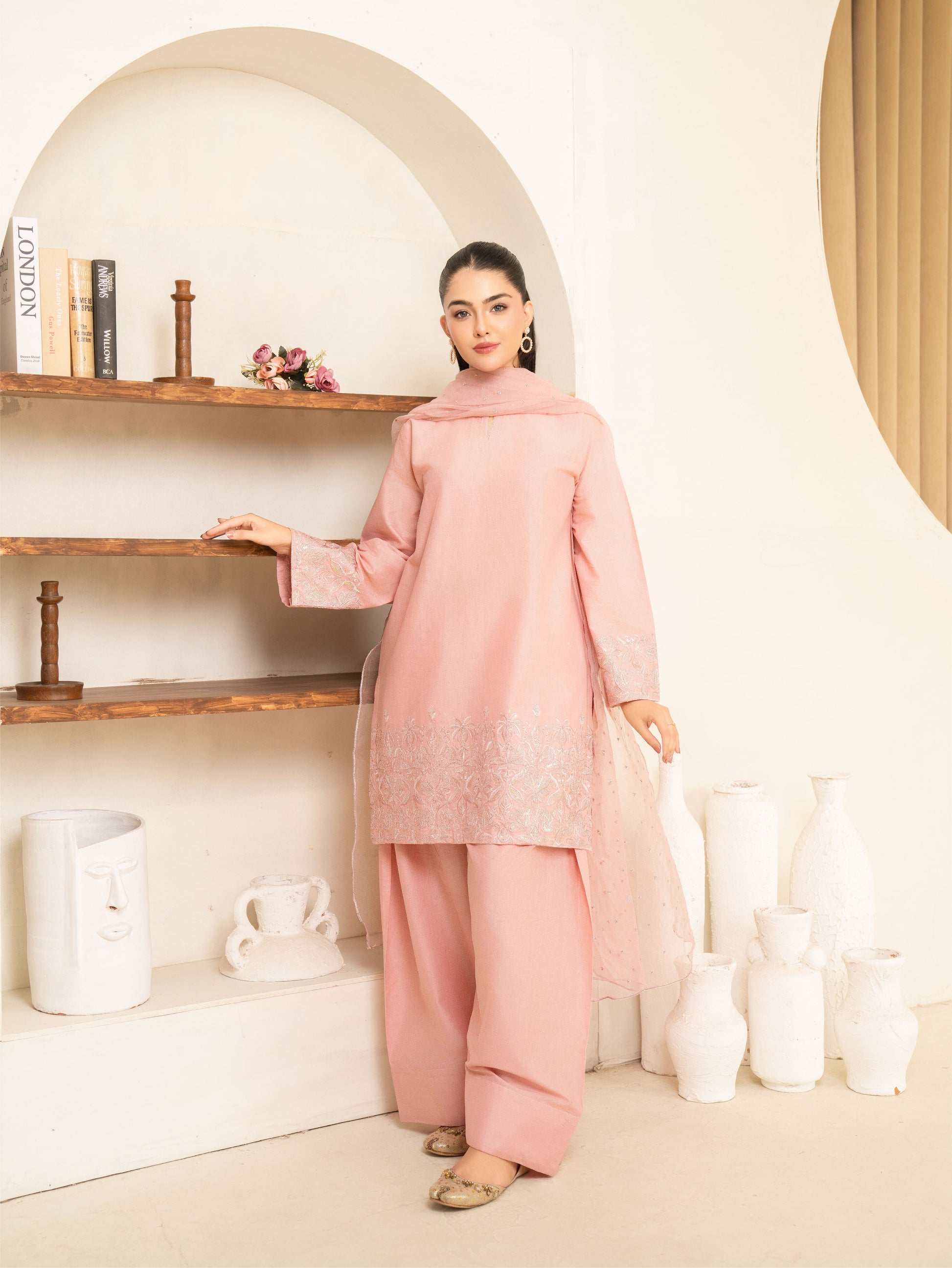 Experience elegance with our exquisite tea pink Nahil ensemble. This article features a short straight embroided shirt with button looped neckline with a farshi shalwar along with a soft organza with sequin work dupatta.