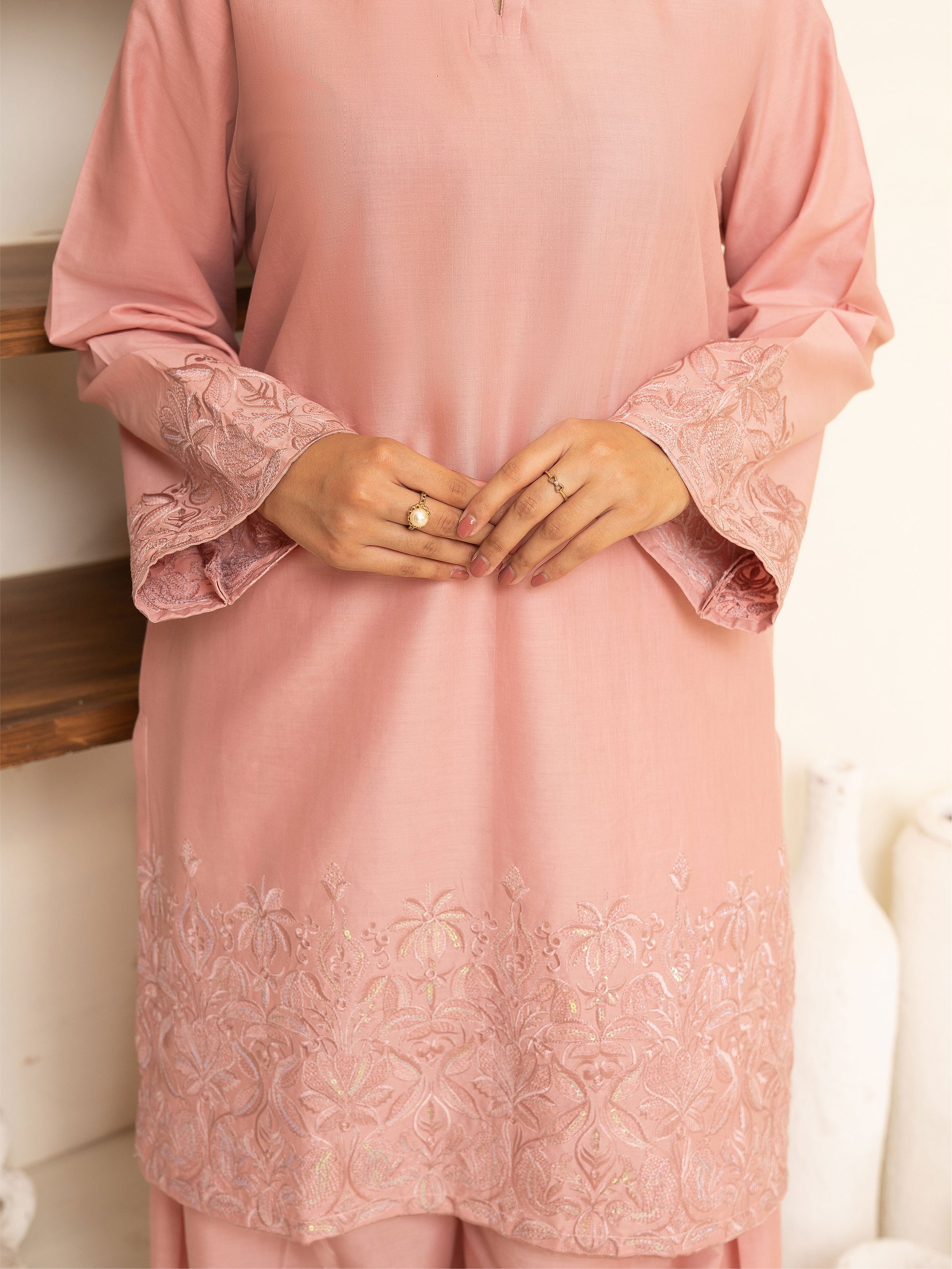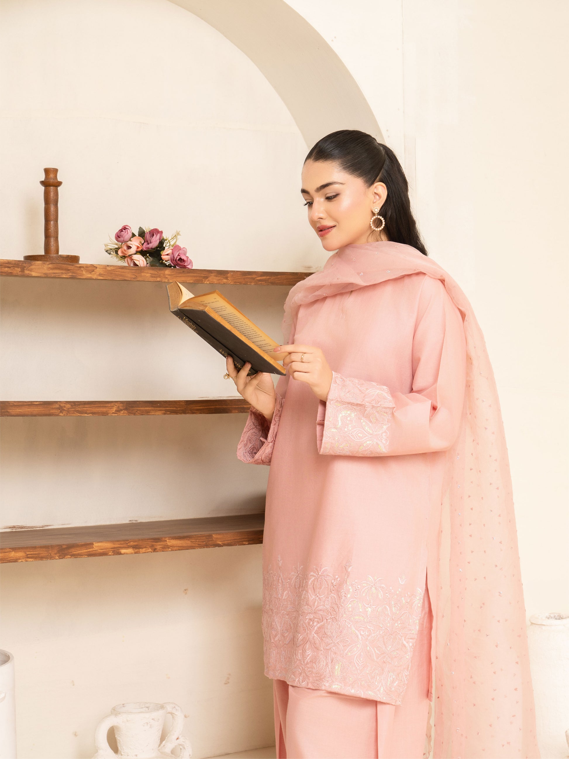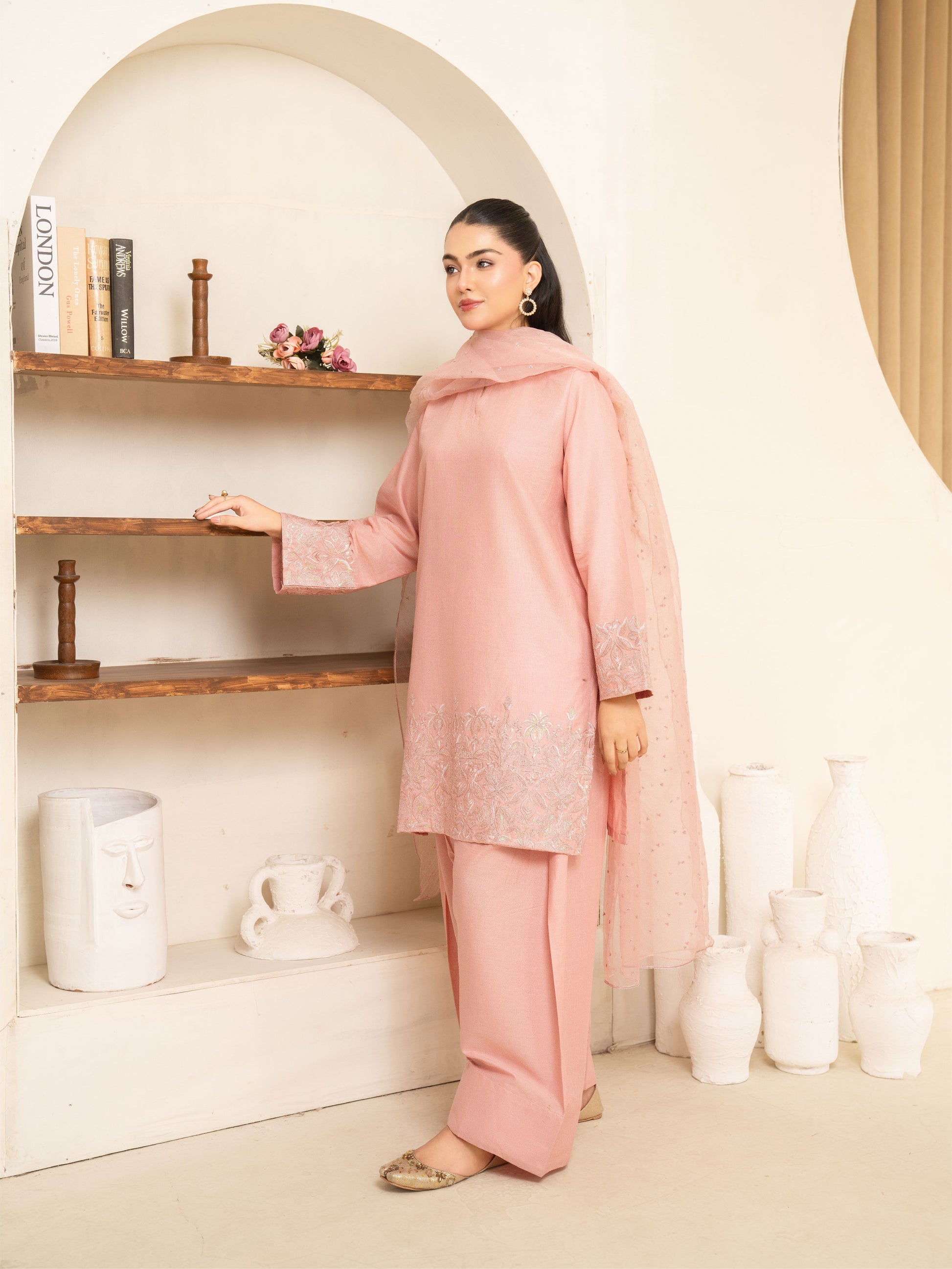 Experience elegance with our exquisite tea pink Nahil ensemble. This article features a short straight embroided shirt with button looped neckline with a farshi shalwar along with a soft organza with sequin work dupatta.