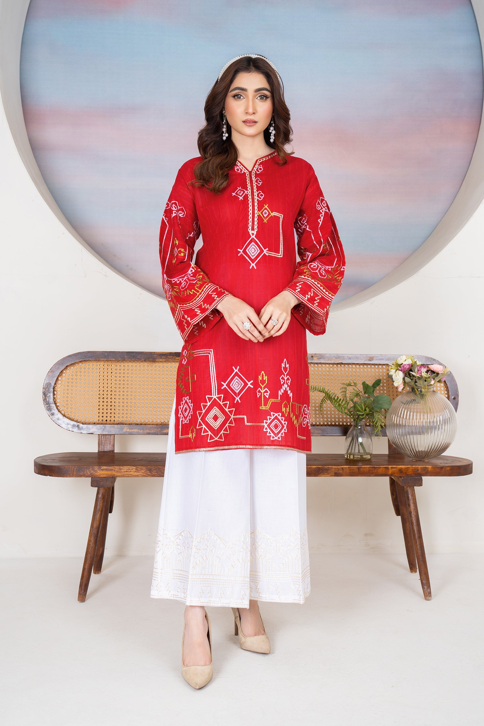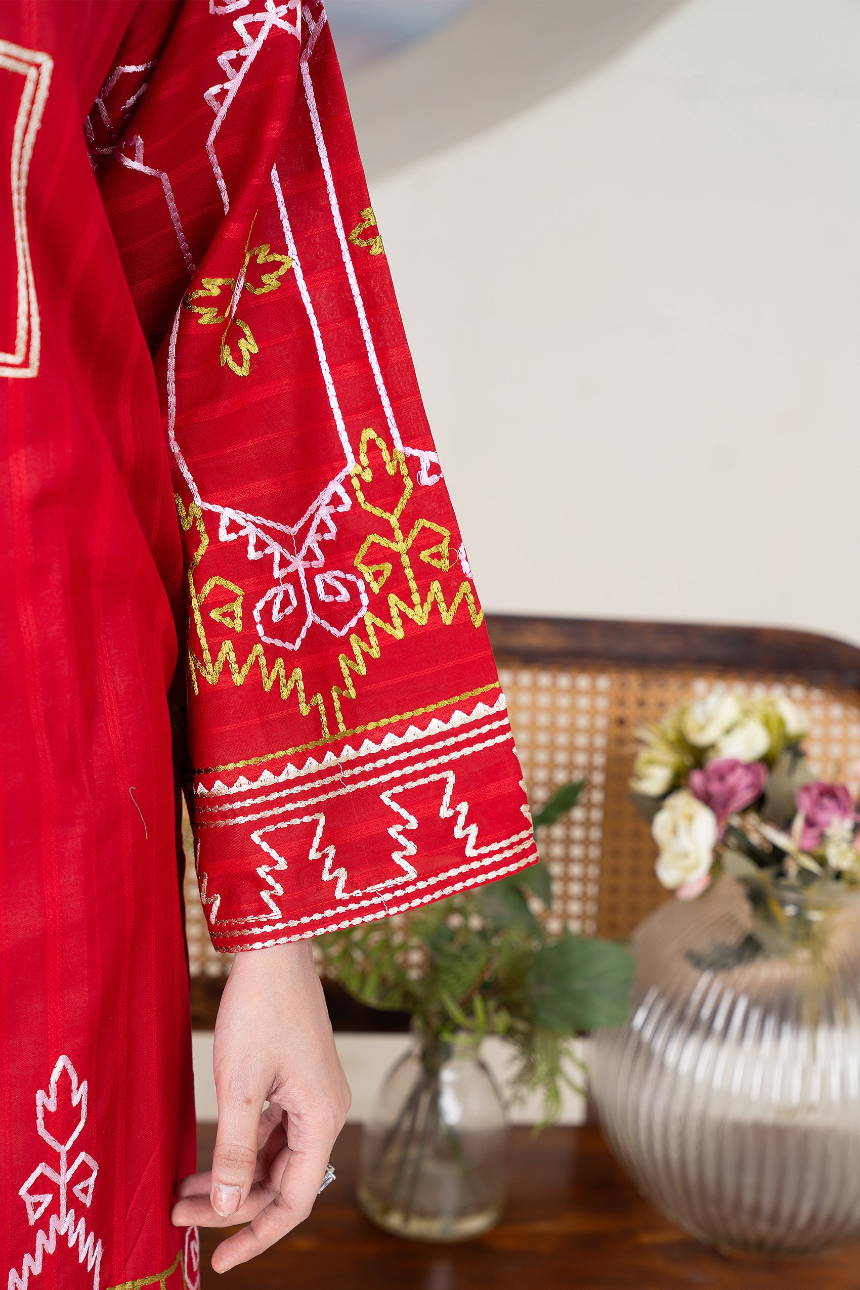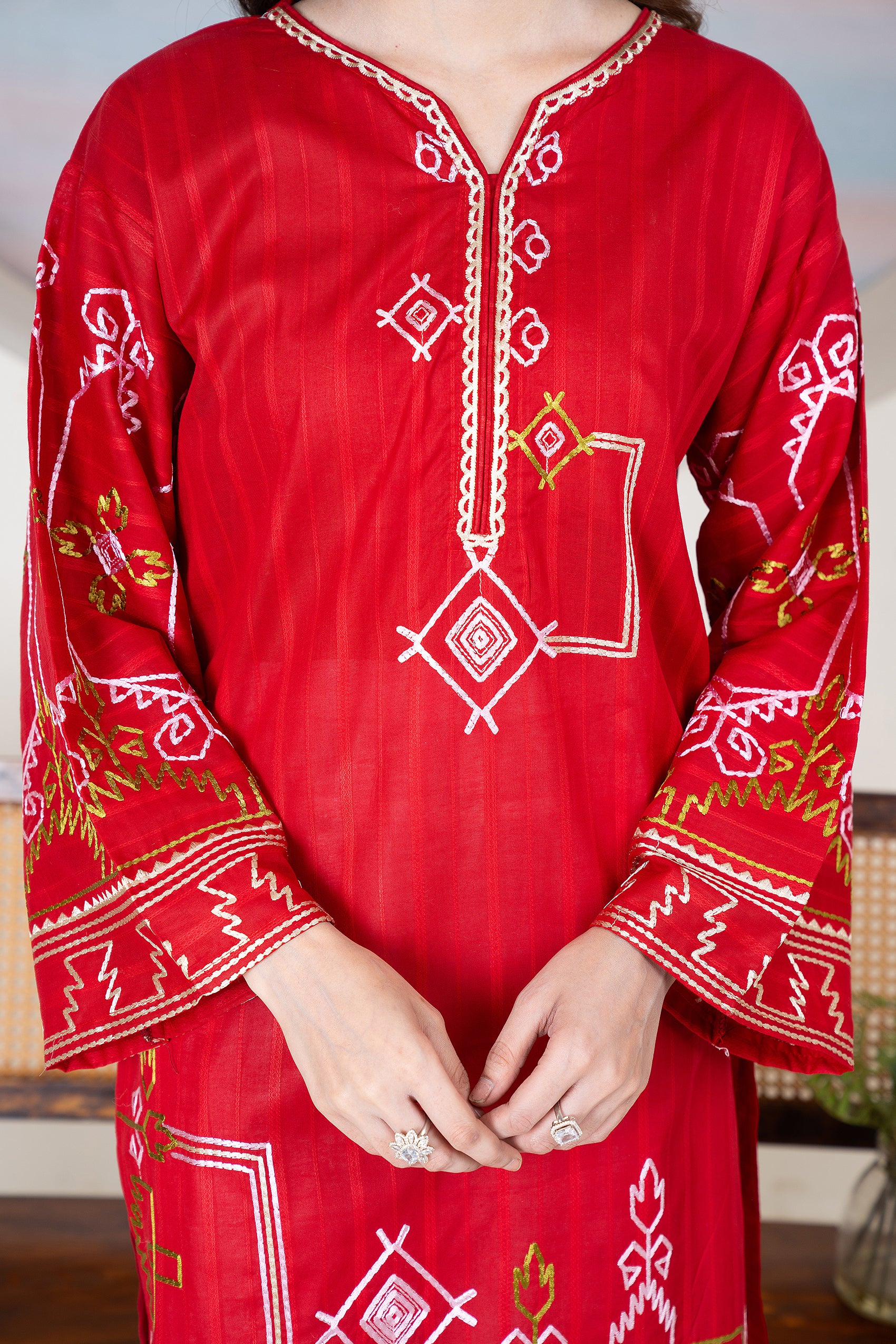 Experience elegance with our exquisite deep red Nazneen ensemble. This summer collection piece features red - this uniquely embroidered katpana lawn shirt paired with white embroidered trouser.