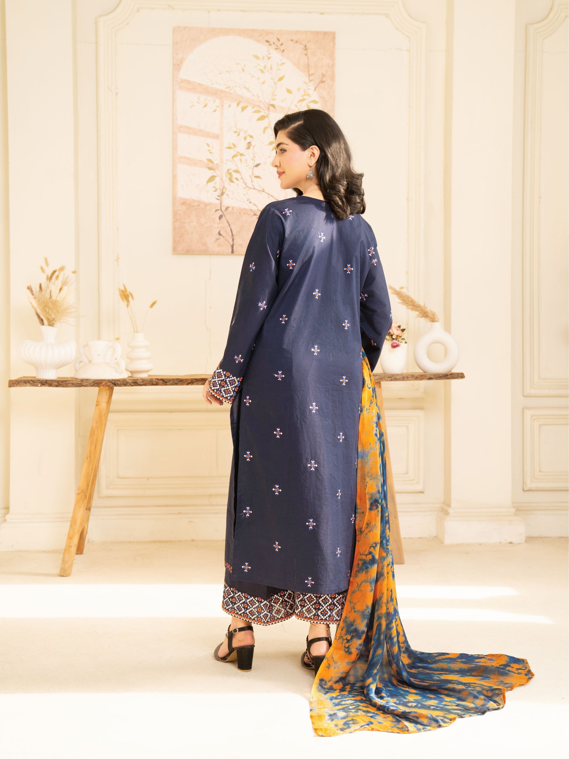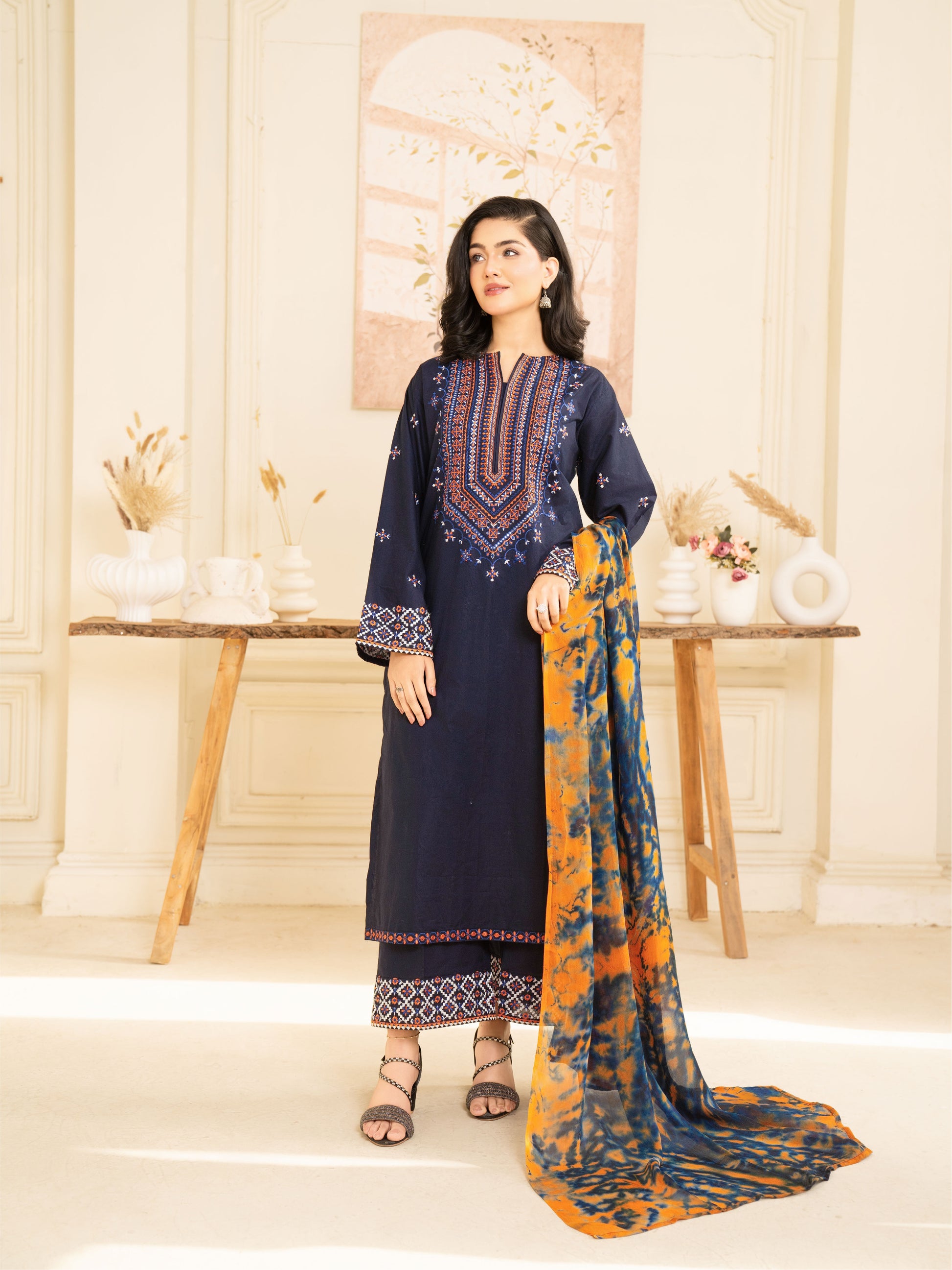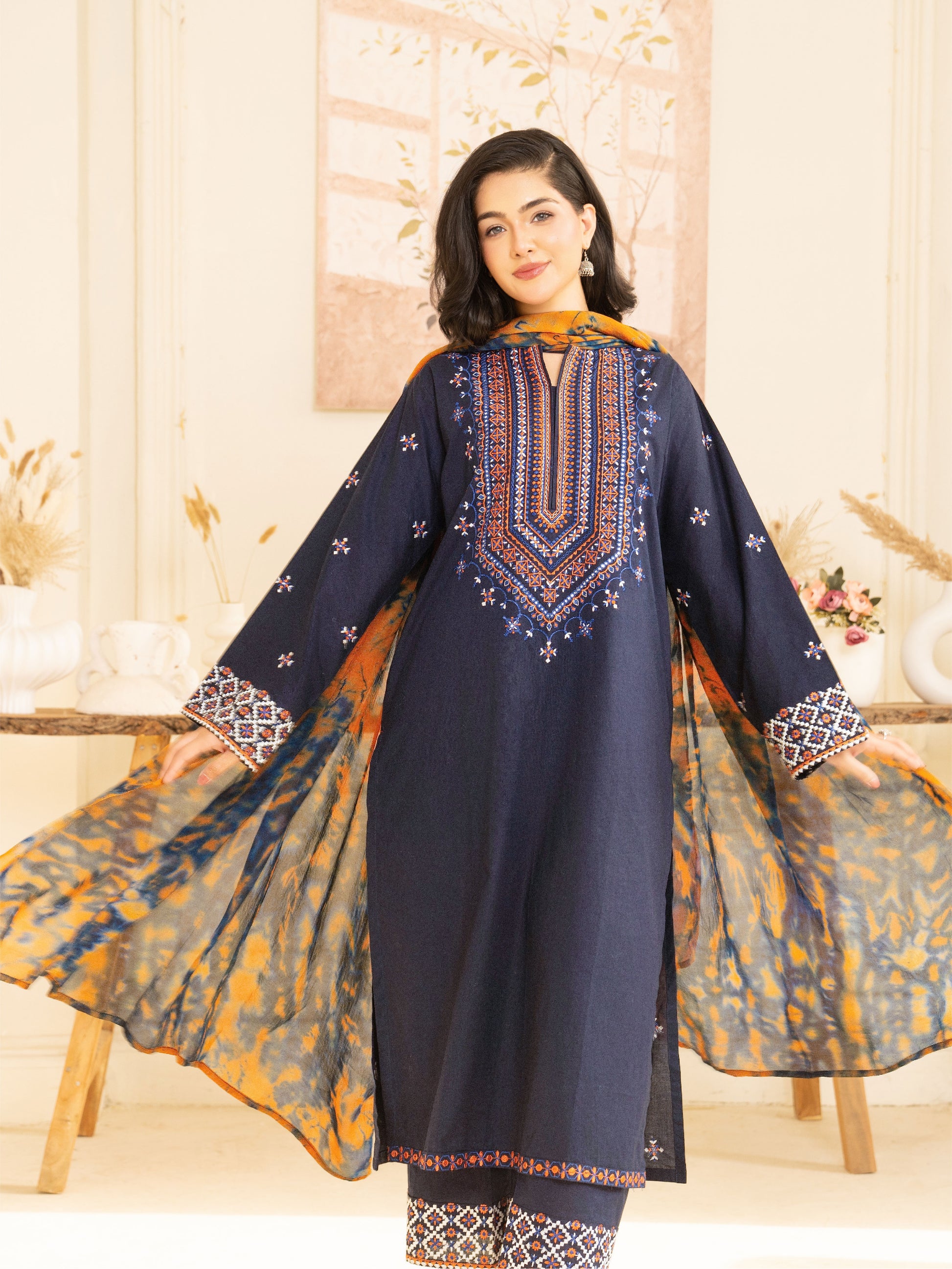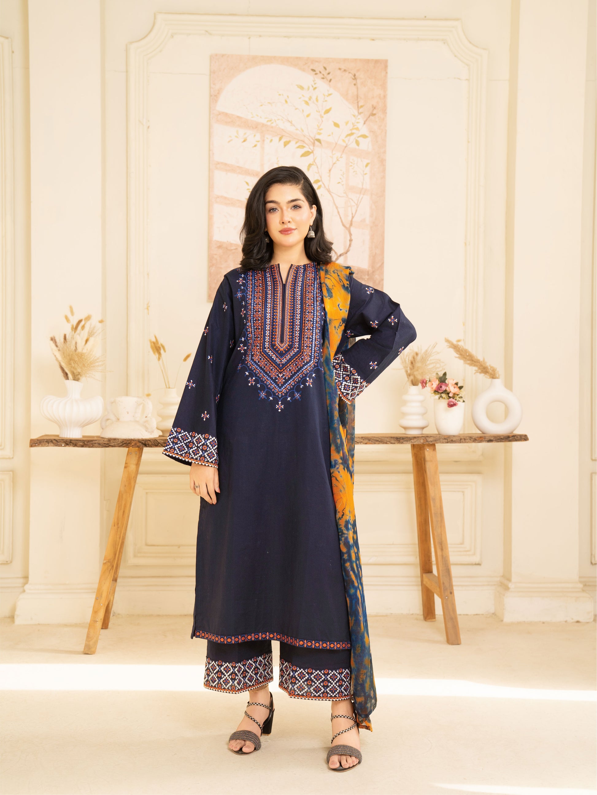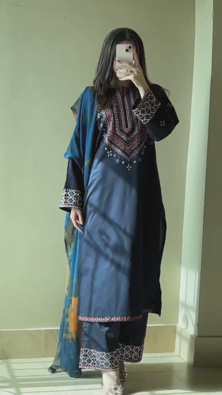Experience elegance with our premium navy blue Neel ensemble. This article features a long embroidered shirt with front and back embroidery with a loose straight embroidered trousers along with a chiffon tie and dye dupatta.