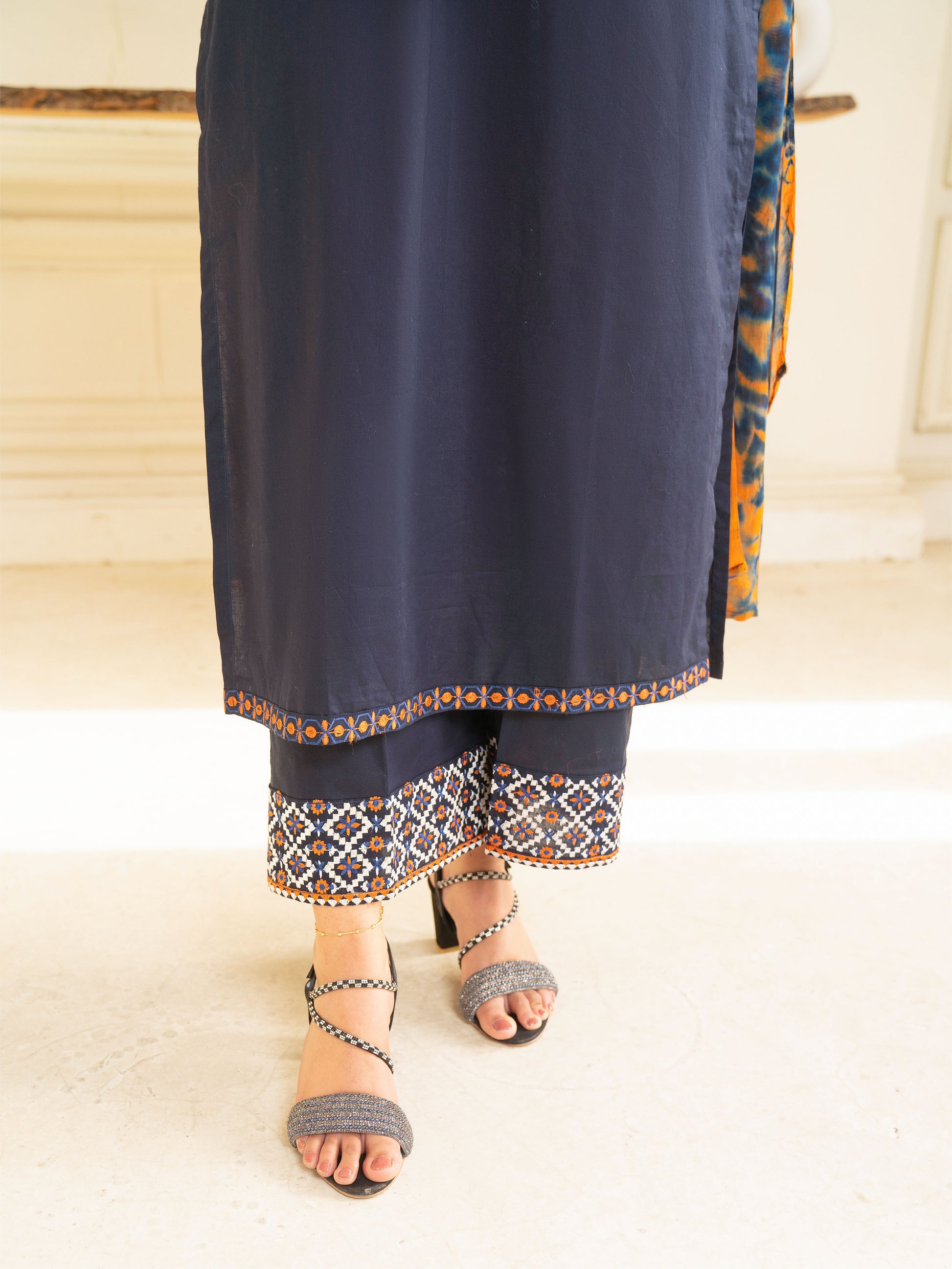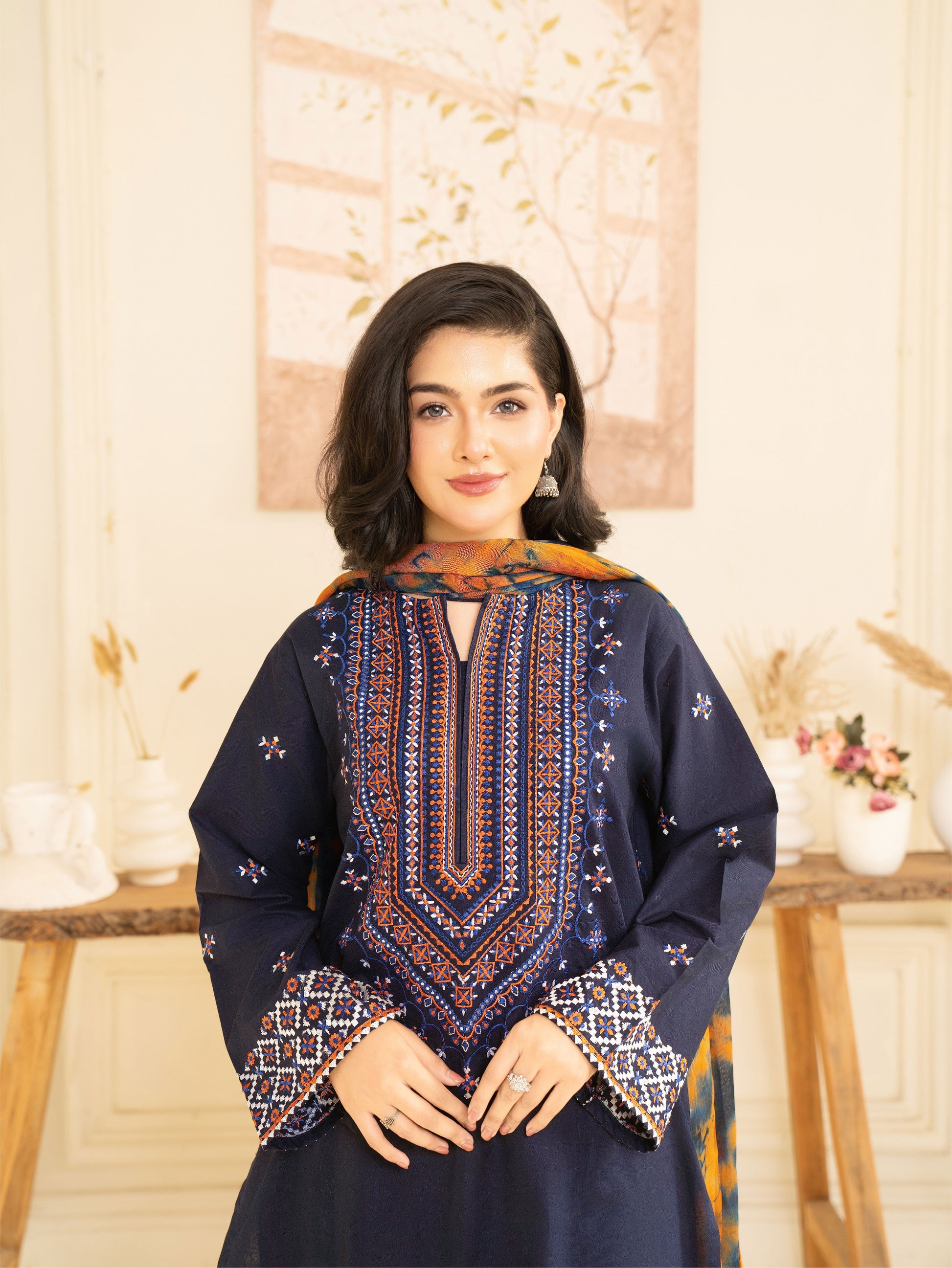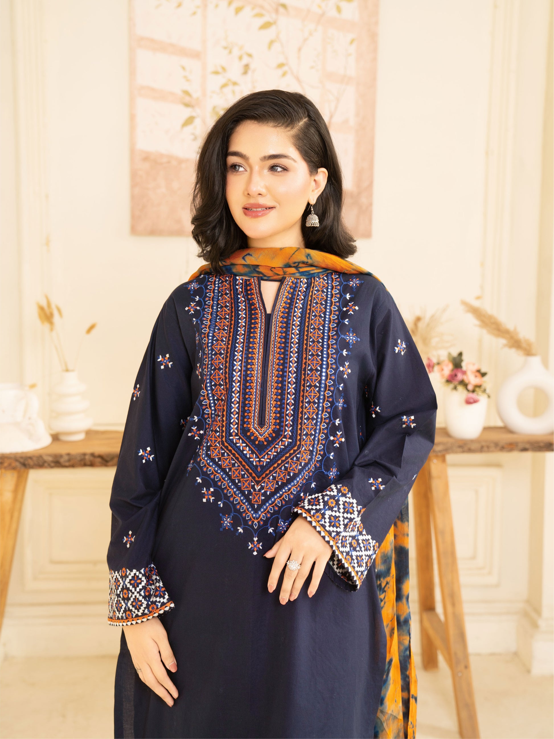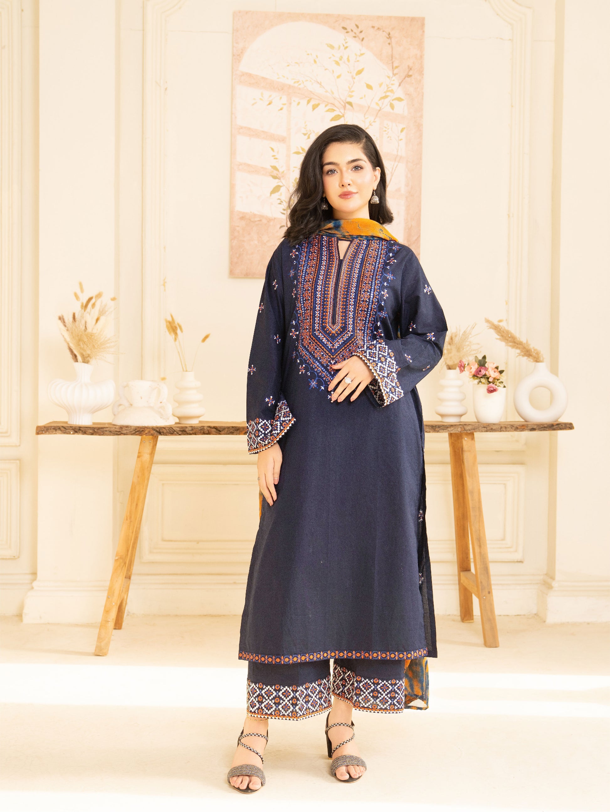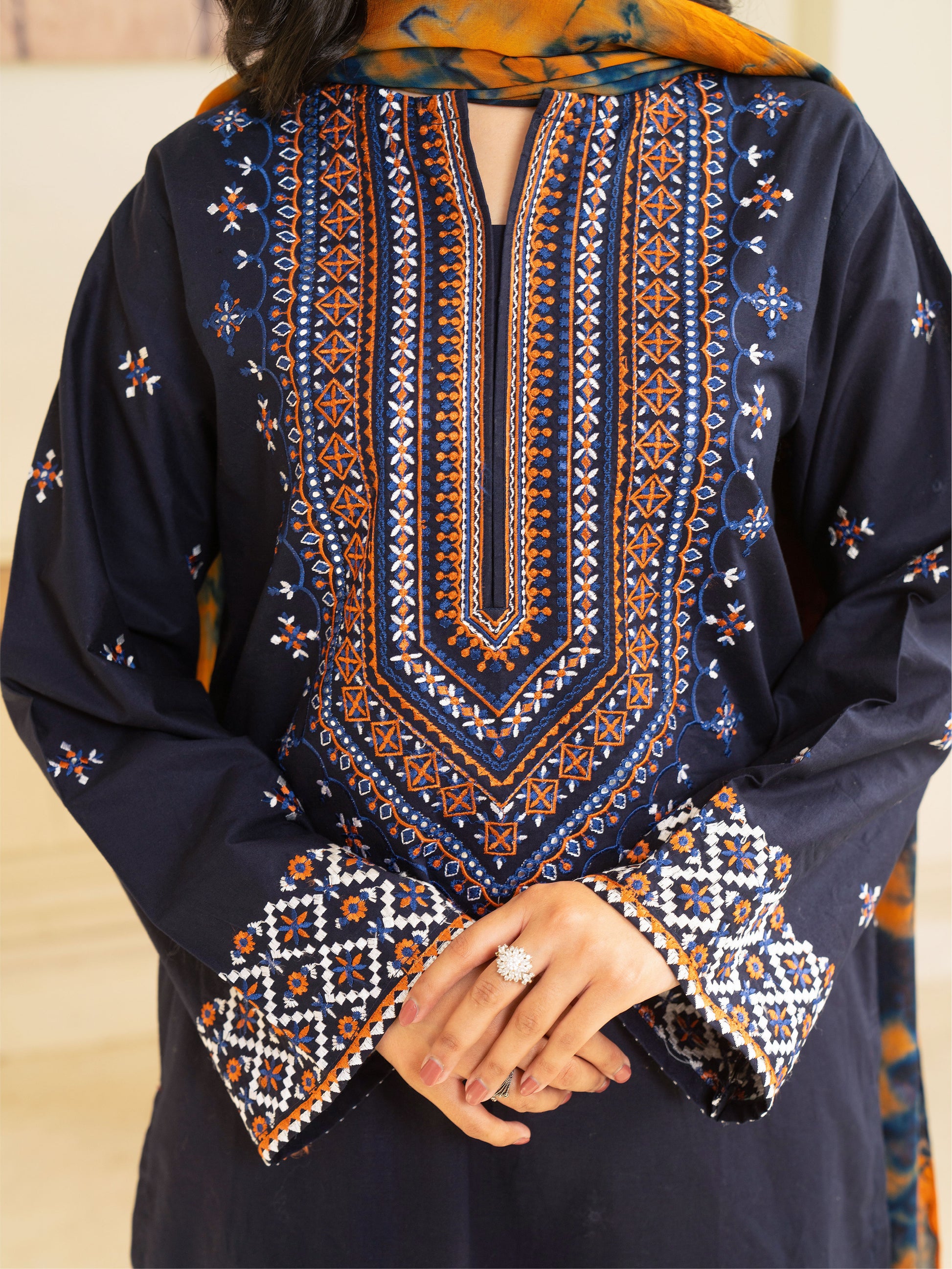 Experience elegance with our premium navy blue Neel ensemble. This article features a long embroidered shirt with front and back embroidery with a loose straight embroidered trousers along with a chiffon tie and dye dupatta.