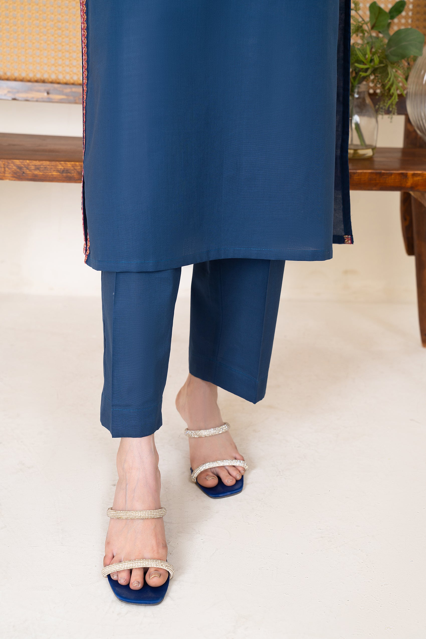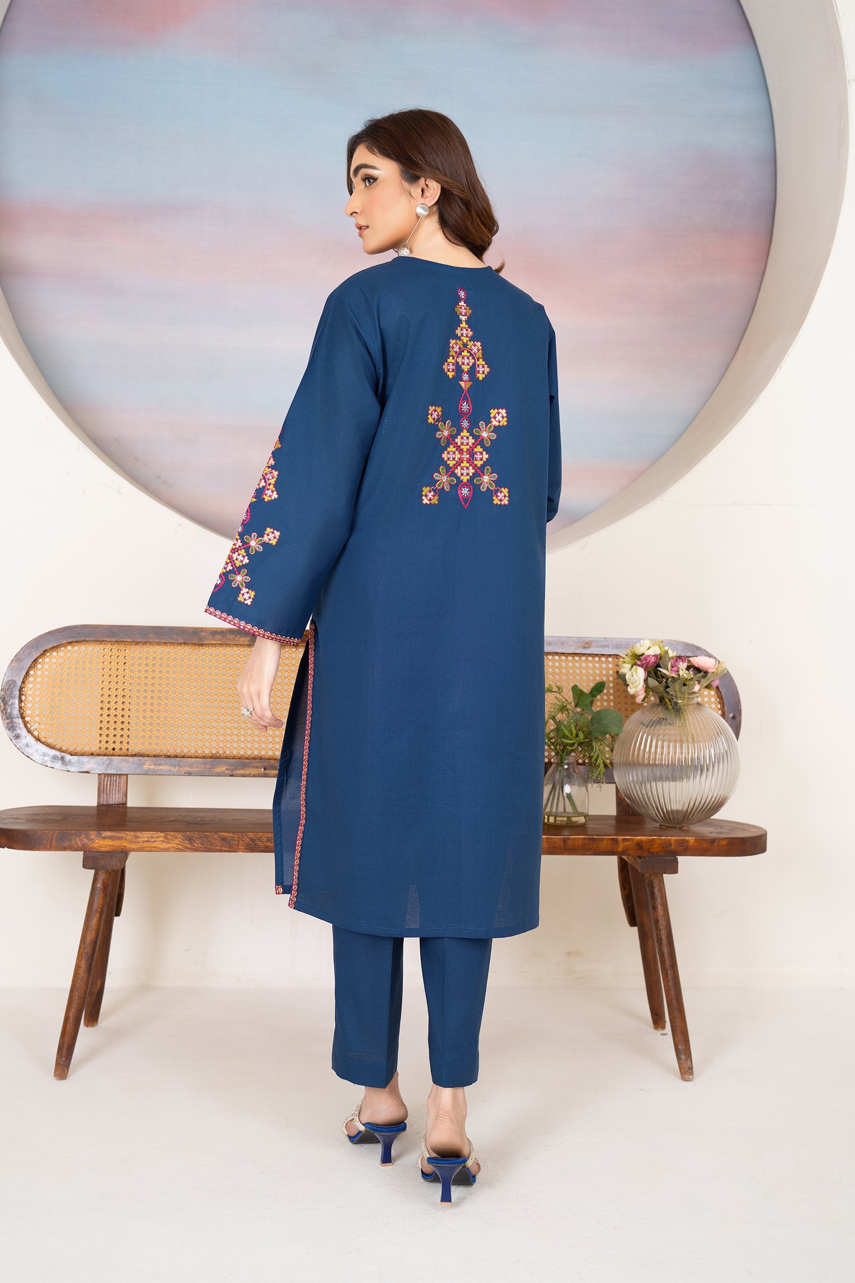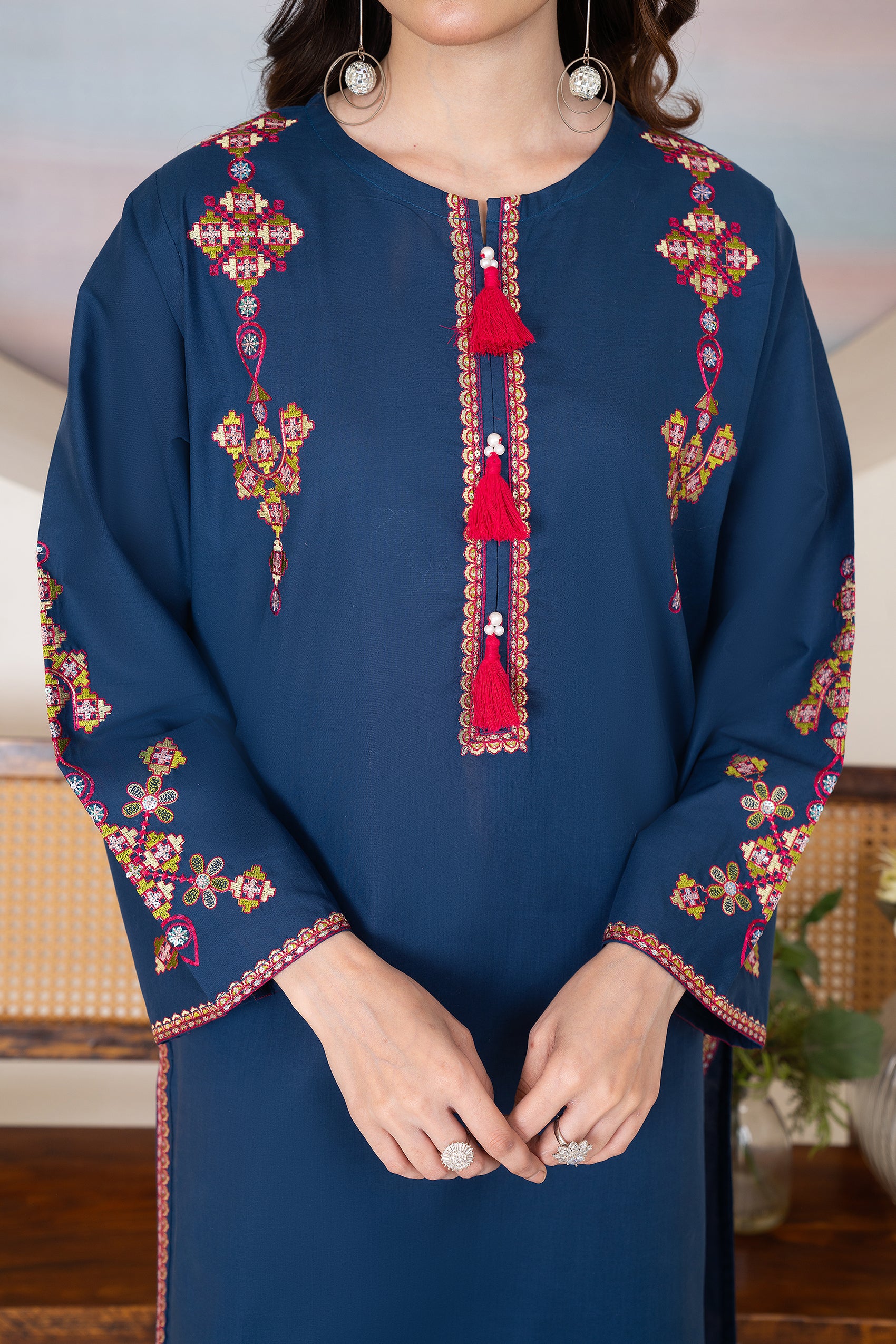 Experience elegance with our exquisite blue Nigaah ensemble. This article features navy blue 2 piece, has multi-colored embroidery on shirt front and back.