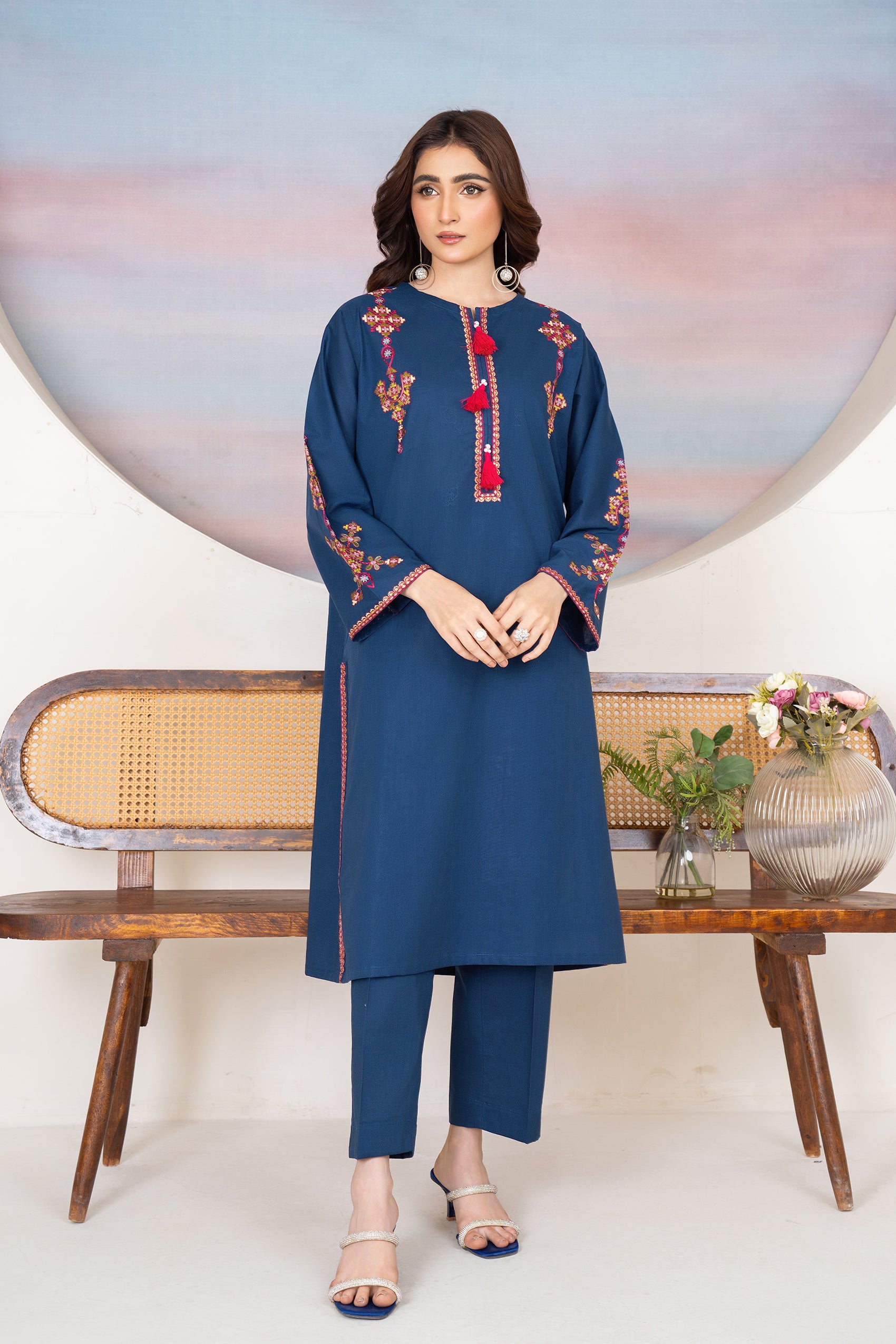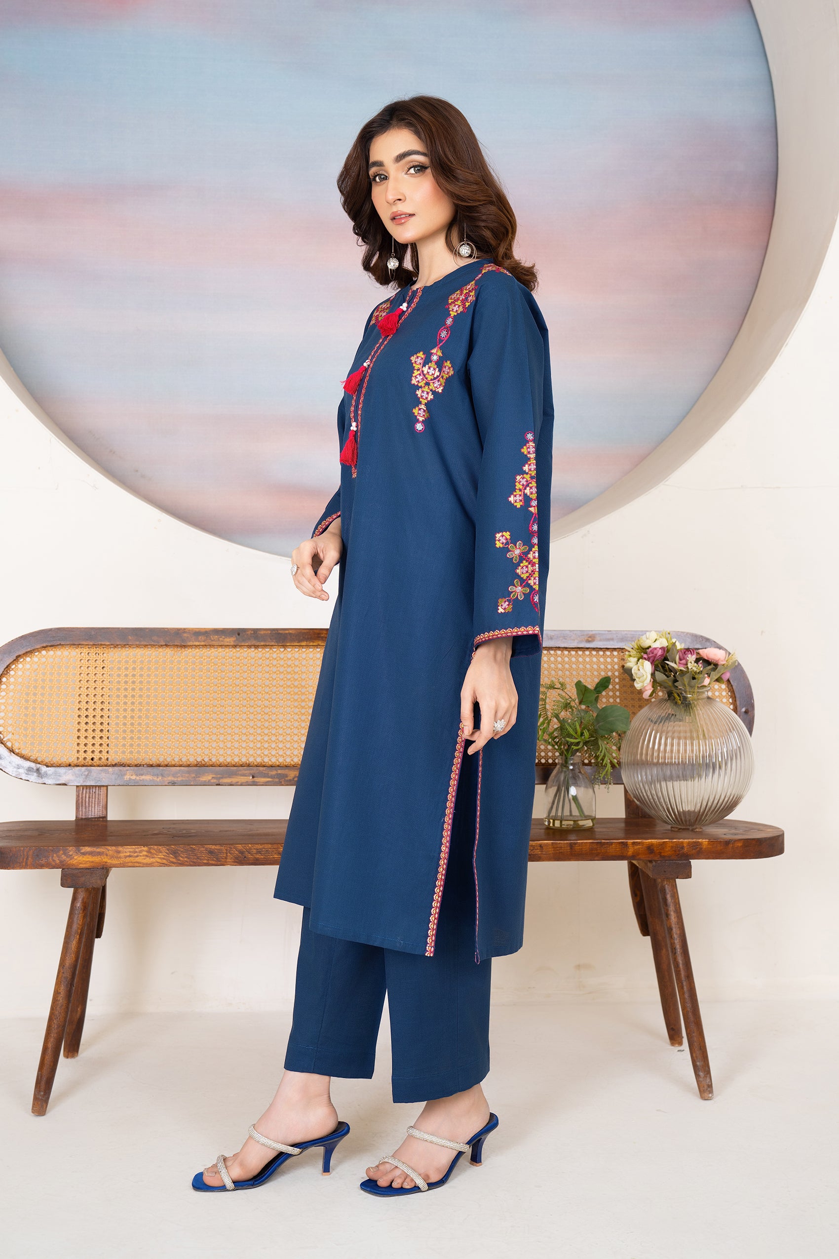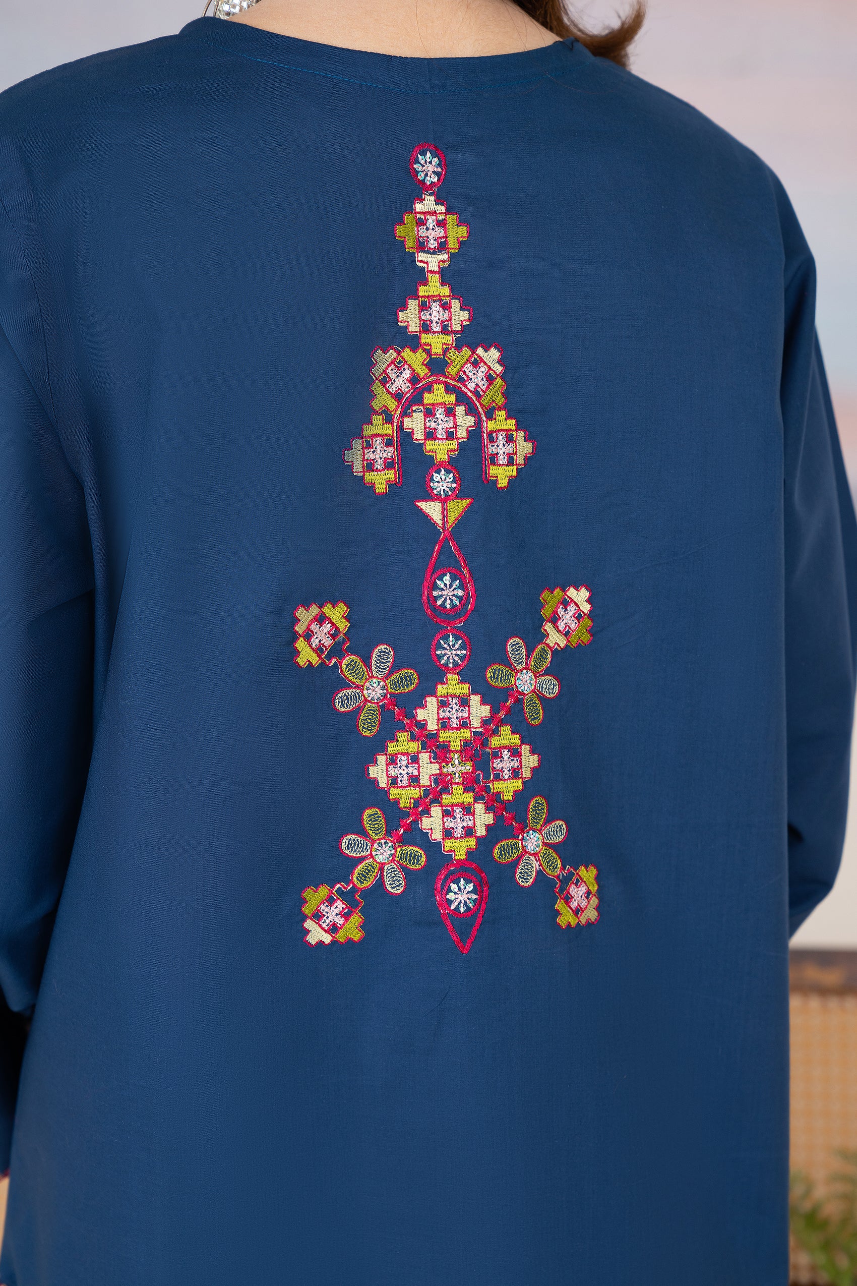 Experience elegance with our exquisite blue Nigaah ensemble. This article features navy blue 2 piece, has multi-colored embroidery on shirt front and back.