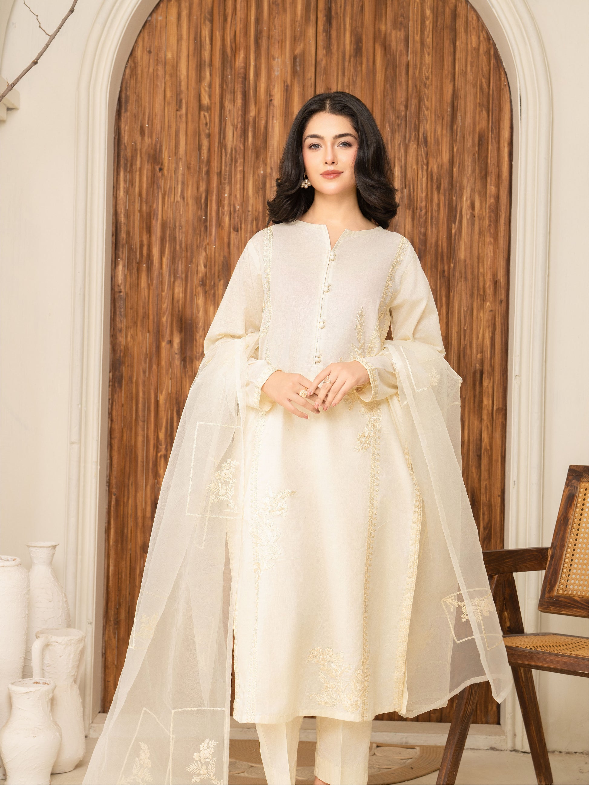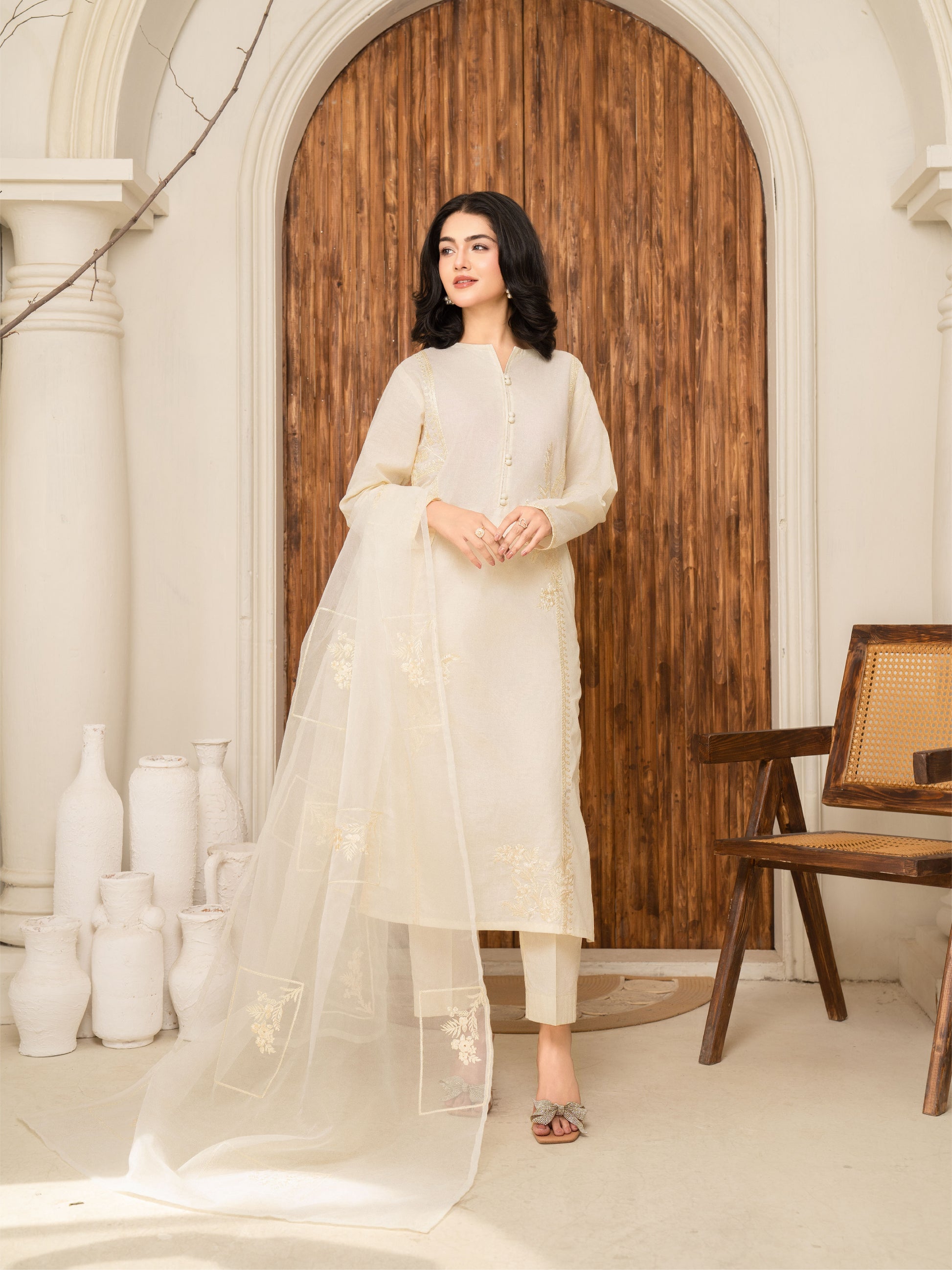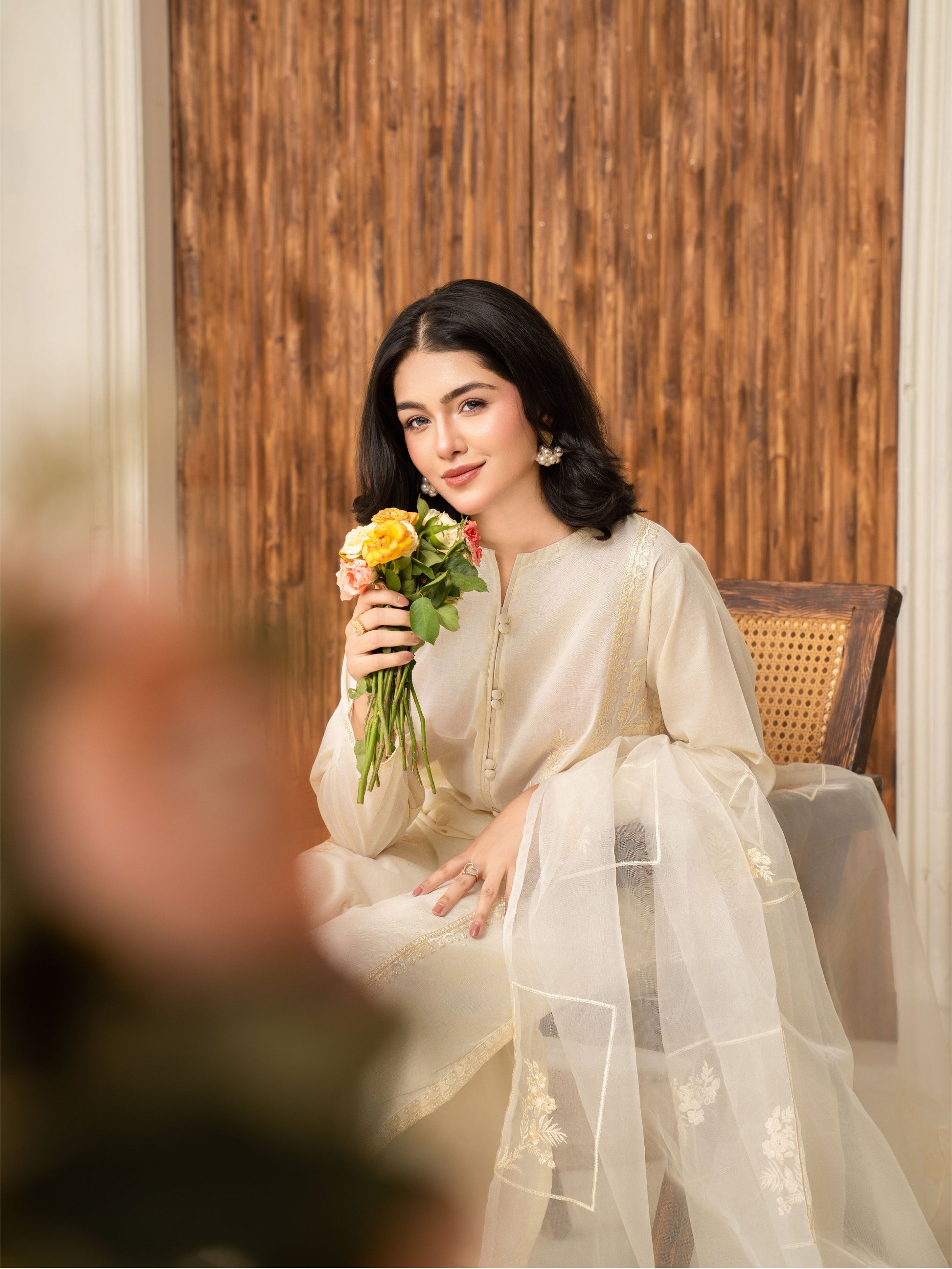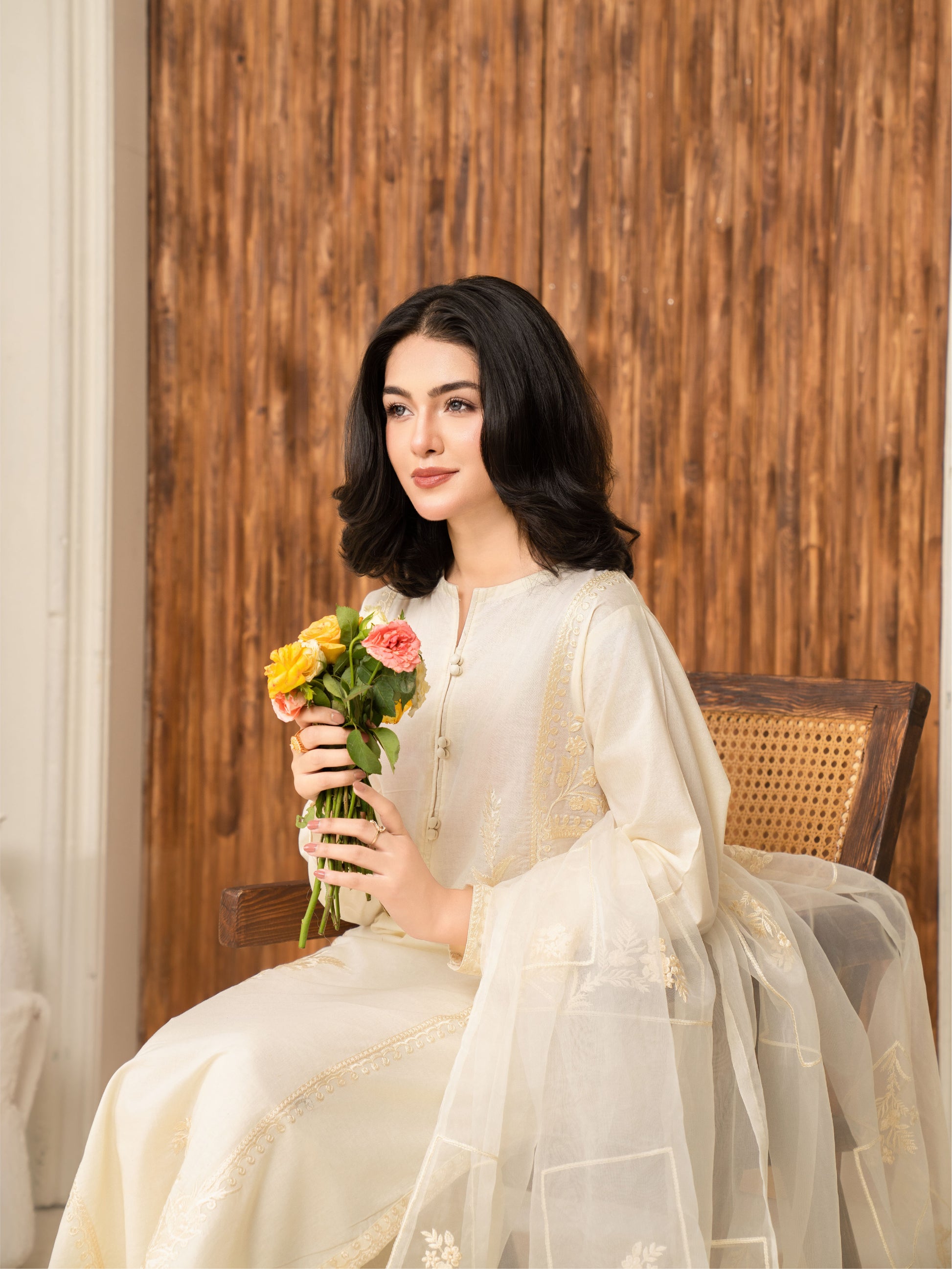 Experience grace and sophistication with our elegant Ivory ensemble. This article features a self-color embroidery on front and sleeves, paired with a beautifully embroidered soft organza dupatta.