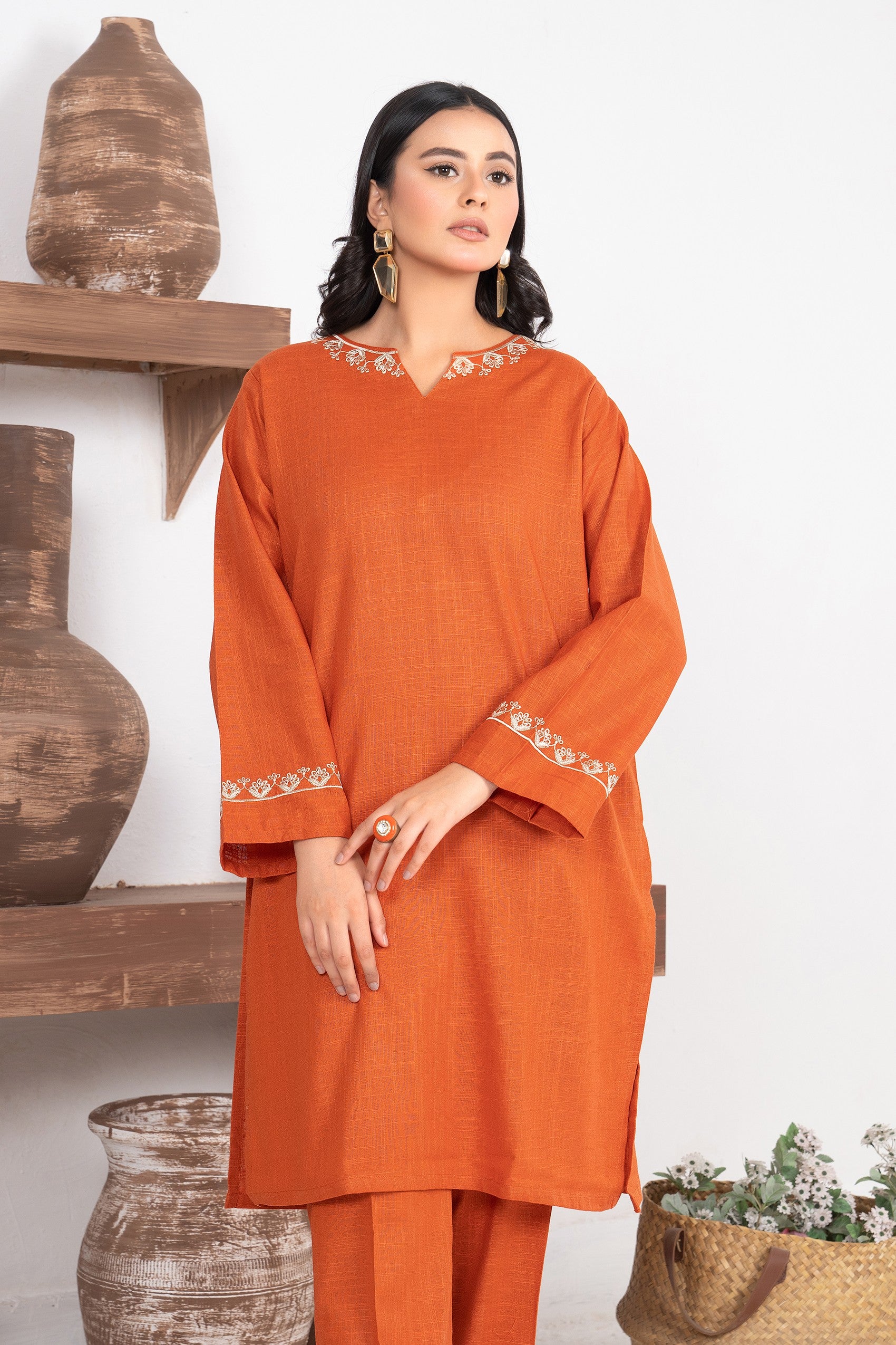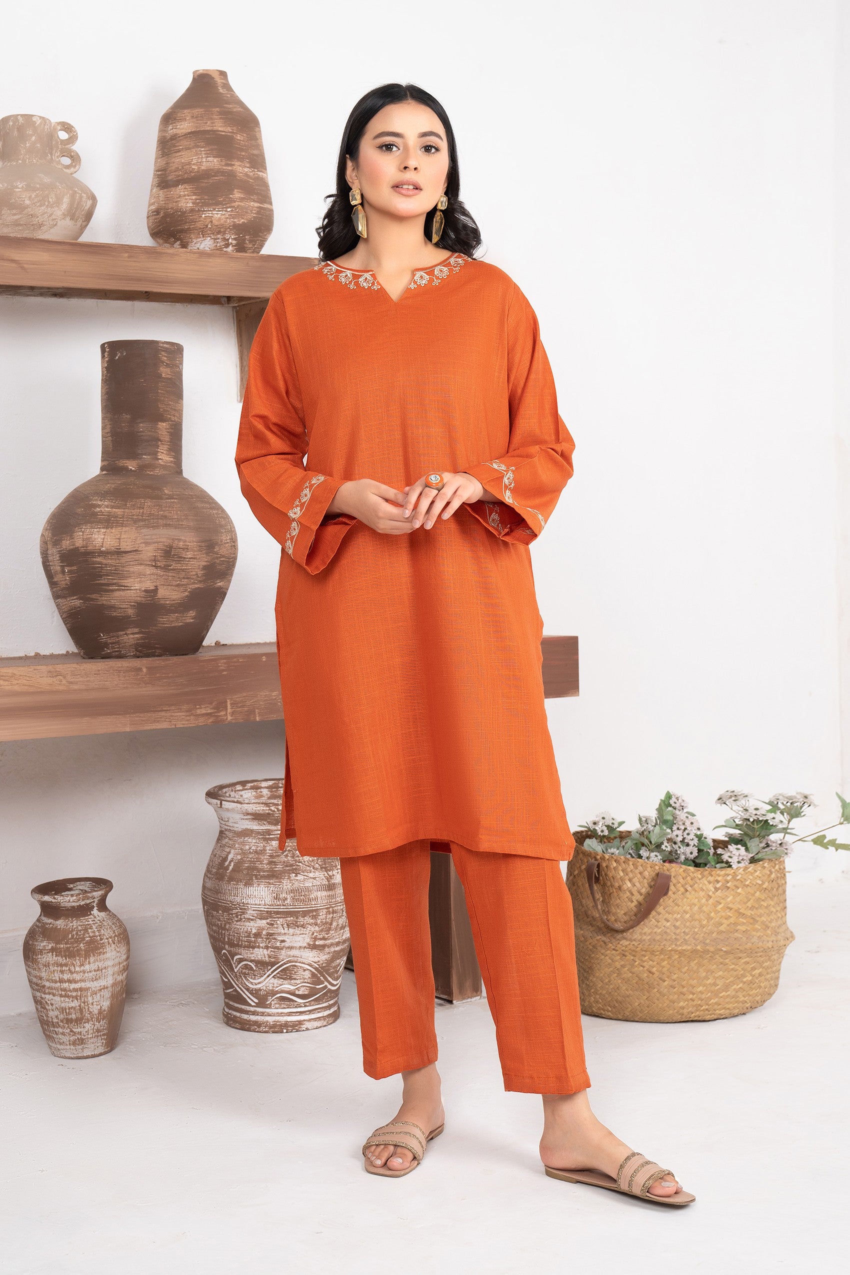 Elevate your everyday style with this vibrant Rust Orange Embroidered two piece. Crafted from slub khaddar fabric for all-day comfort, this two-piece ensemble features a relaxed, straight-cut kurta and tapered pants for a timeless, flattering silhouette. The kurta is adorned with delicate floral embroidery along the neckline and sleeves.
