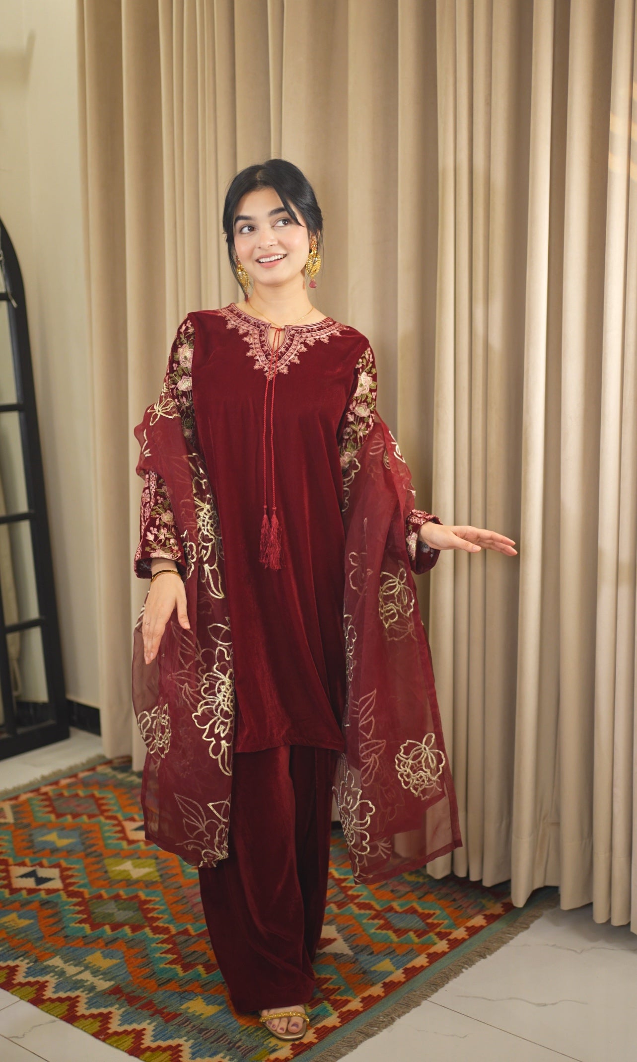 Radiate Festive Grace in Maroon with this exquisite velvet ensemble, an ode to timeless luxury. The short A-line flared embroidered shirt exudes regal elegance, perfectly paired with a beautifully embroidered farshi shalwar that enhances its traditional charm. Completing the look is an allover embroidered organza dupatta, adding a touch of opulence and festive allure. A statement piece that flawlessly blends classic craftsmanship with modern sophistication.