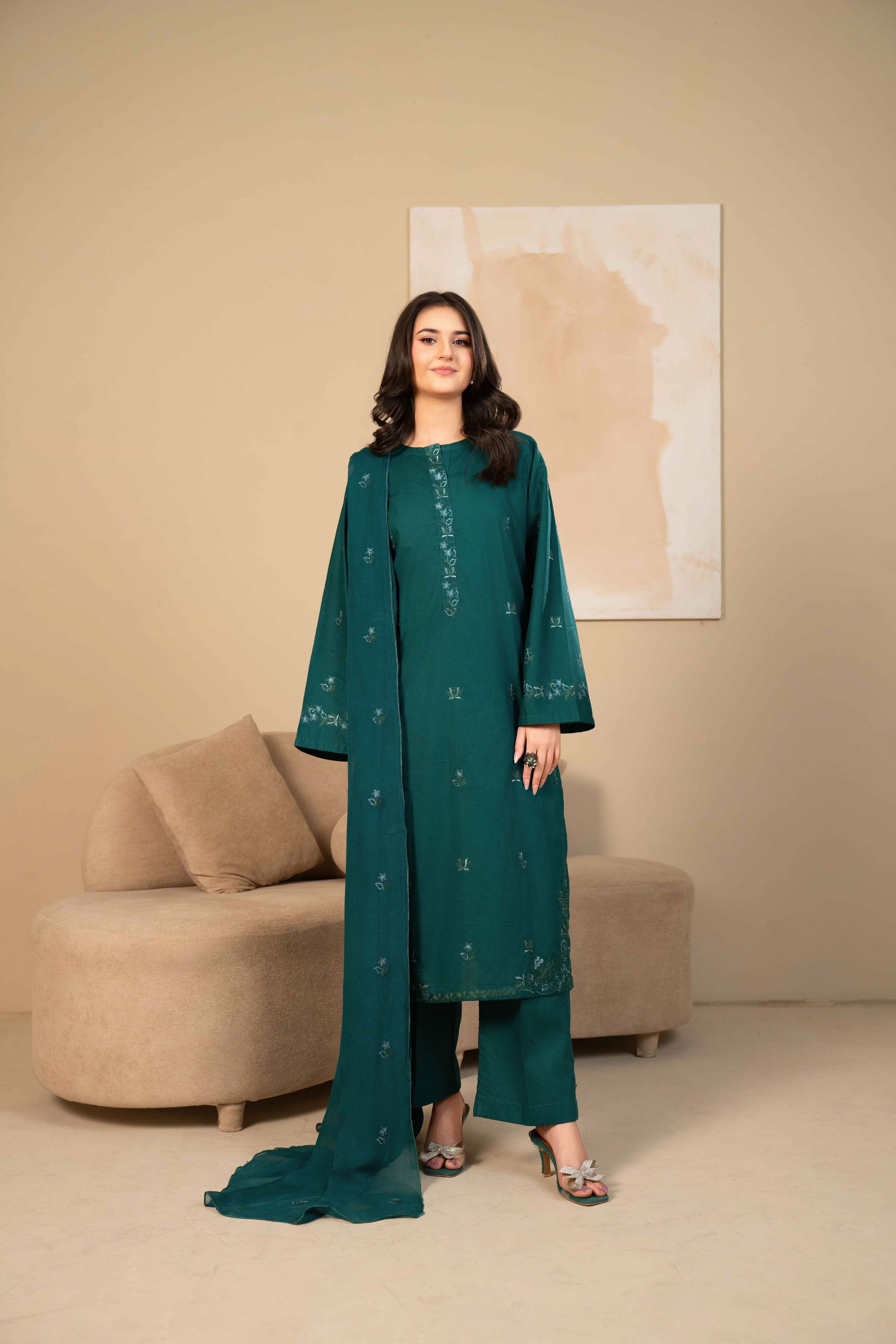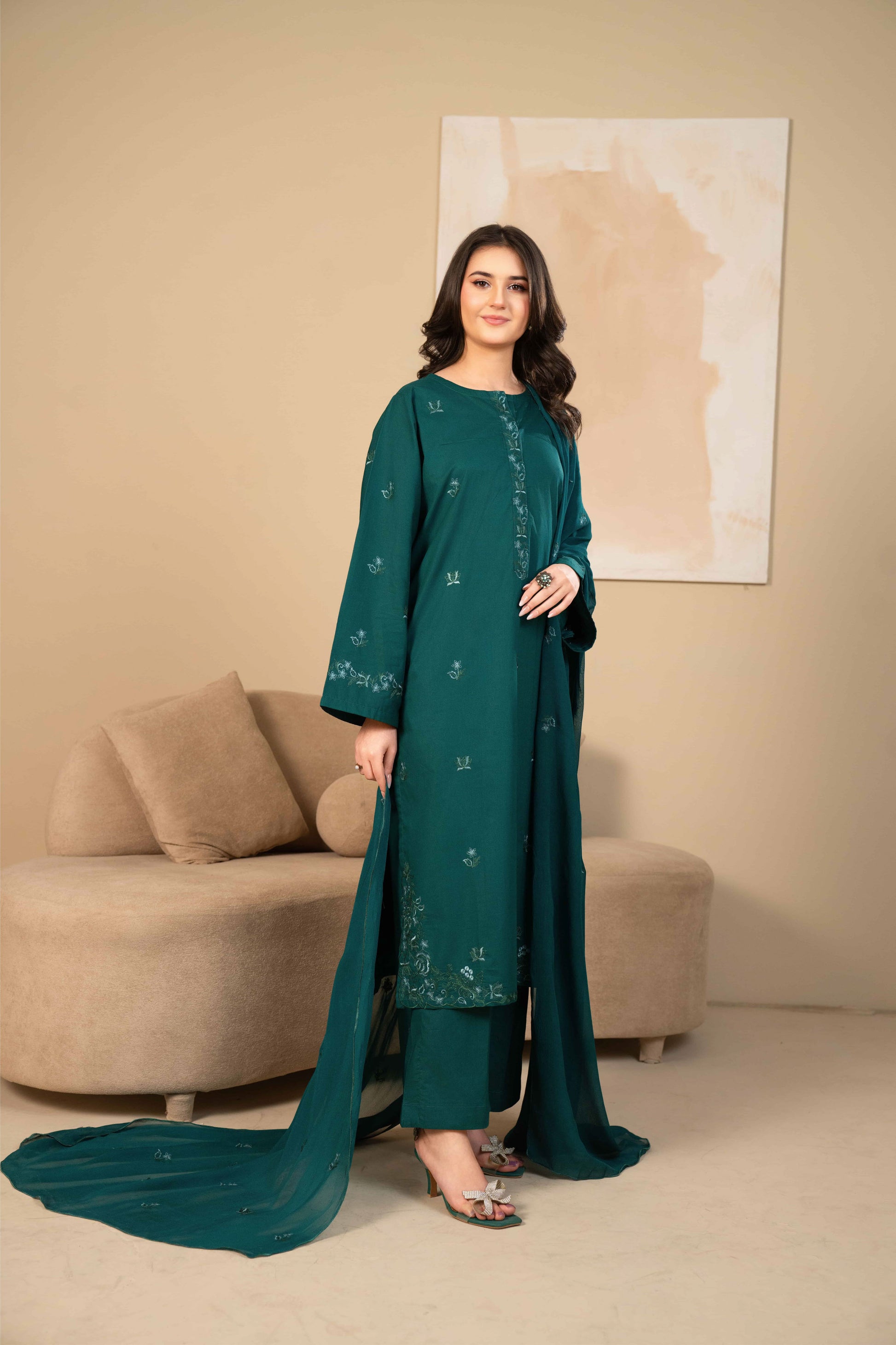 Stitched 3 piece - An elegantly zinc long shirt beautifully embroidered, Paired with straight trousers and completed with an embroidered chiffon dupatta that adds a touch of luxury and flow.