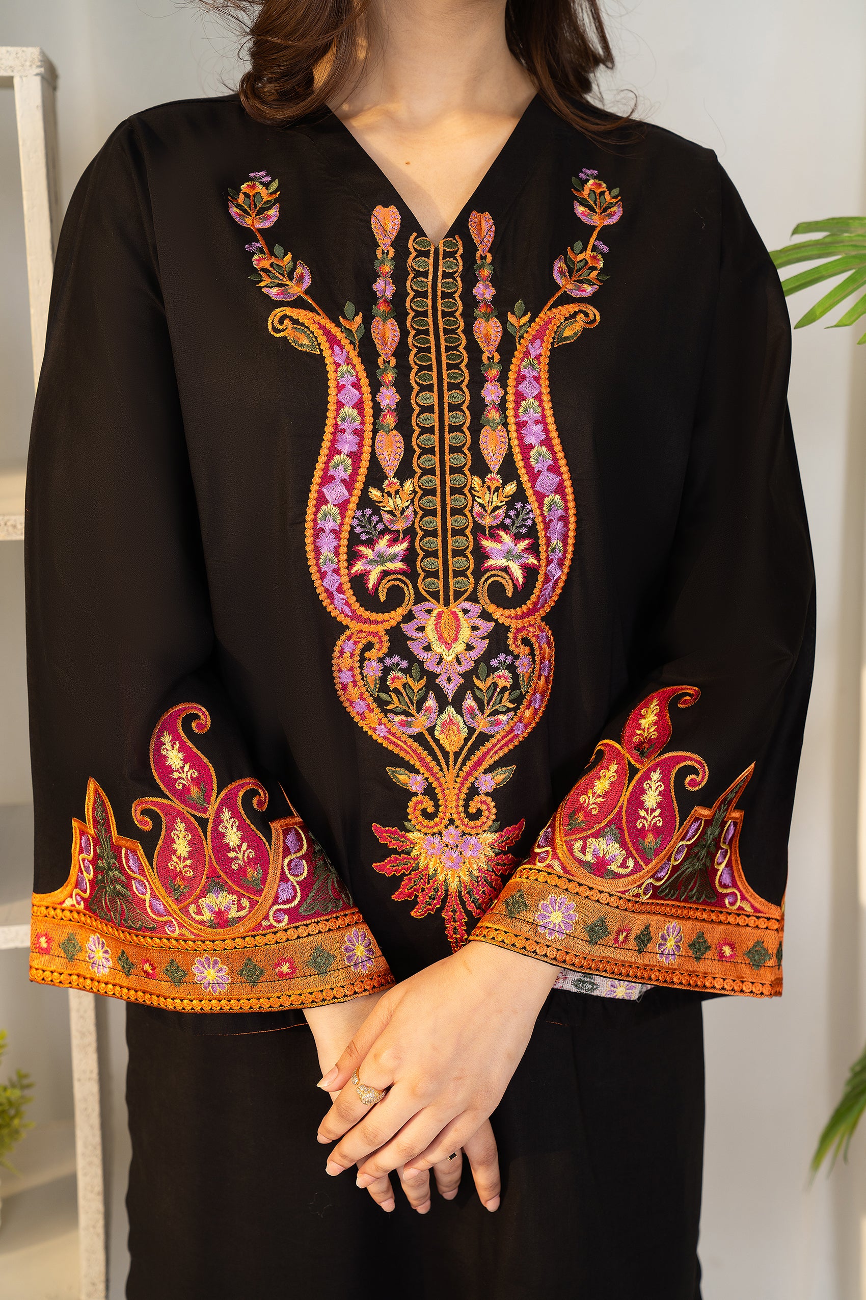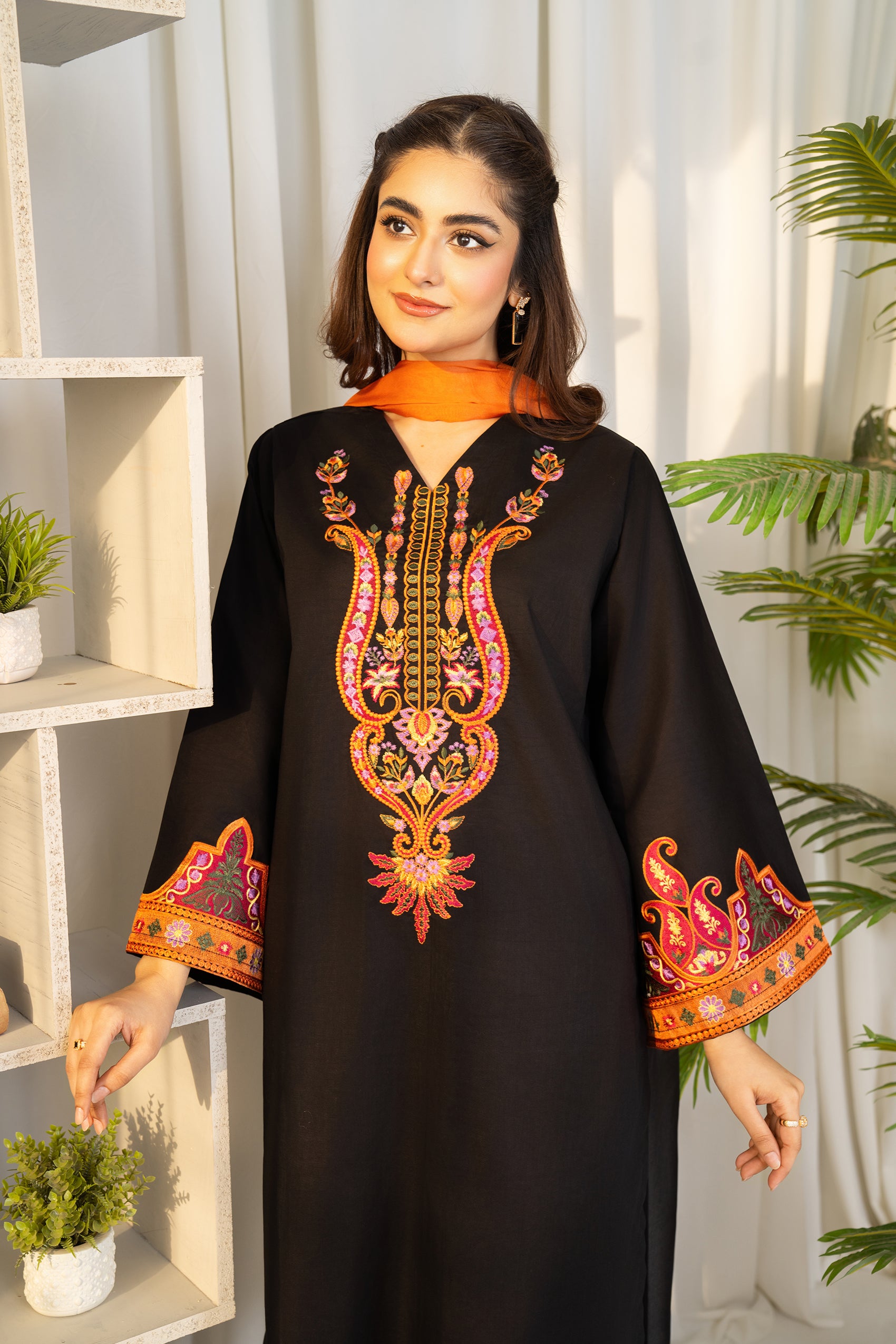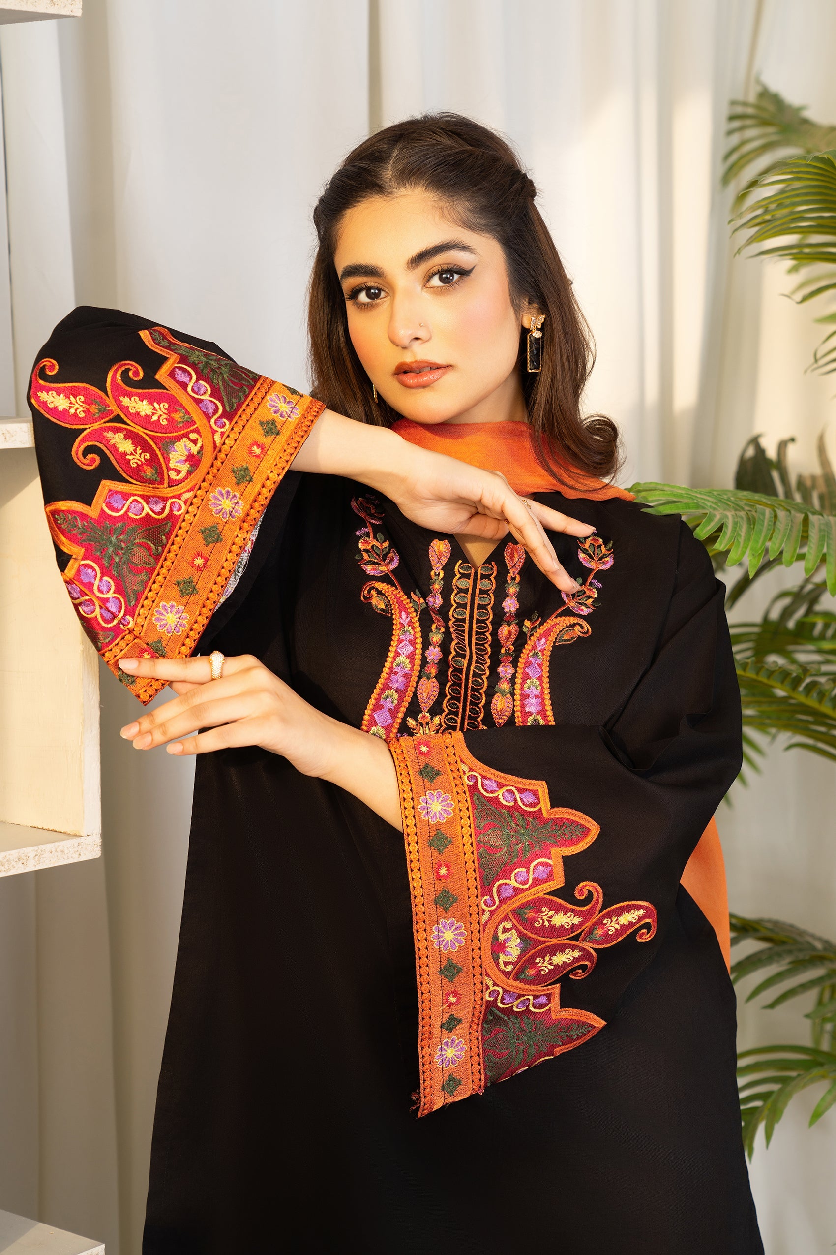 Experience elegance with our exquisite black Sahar ensemble. This eid collection piece features black - embroidered neck along with embroidered sleeves pair with double shaded chiffon dupatta.