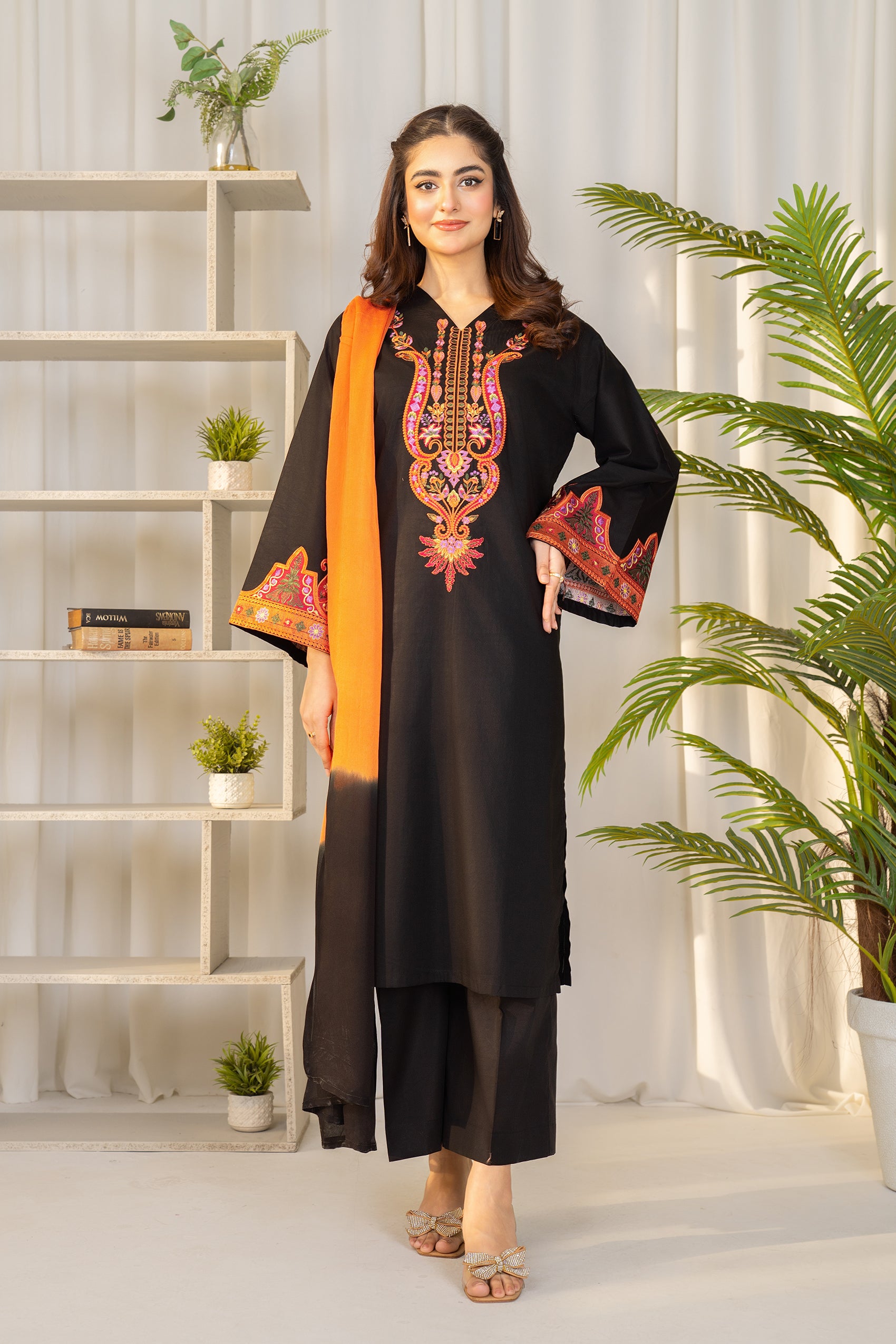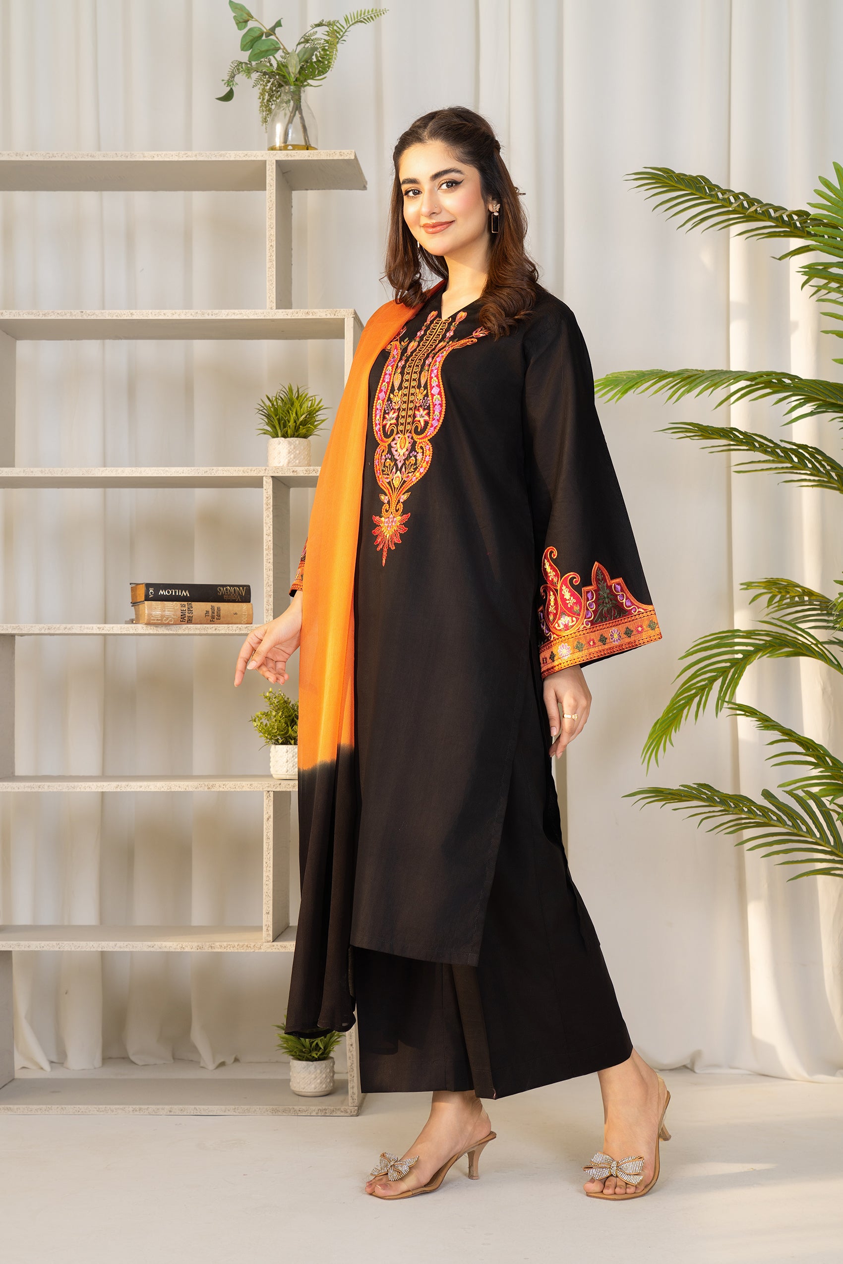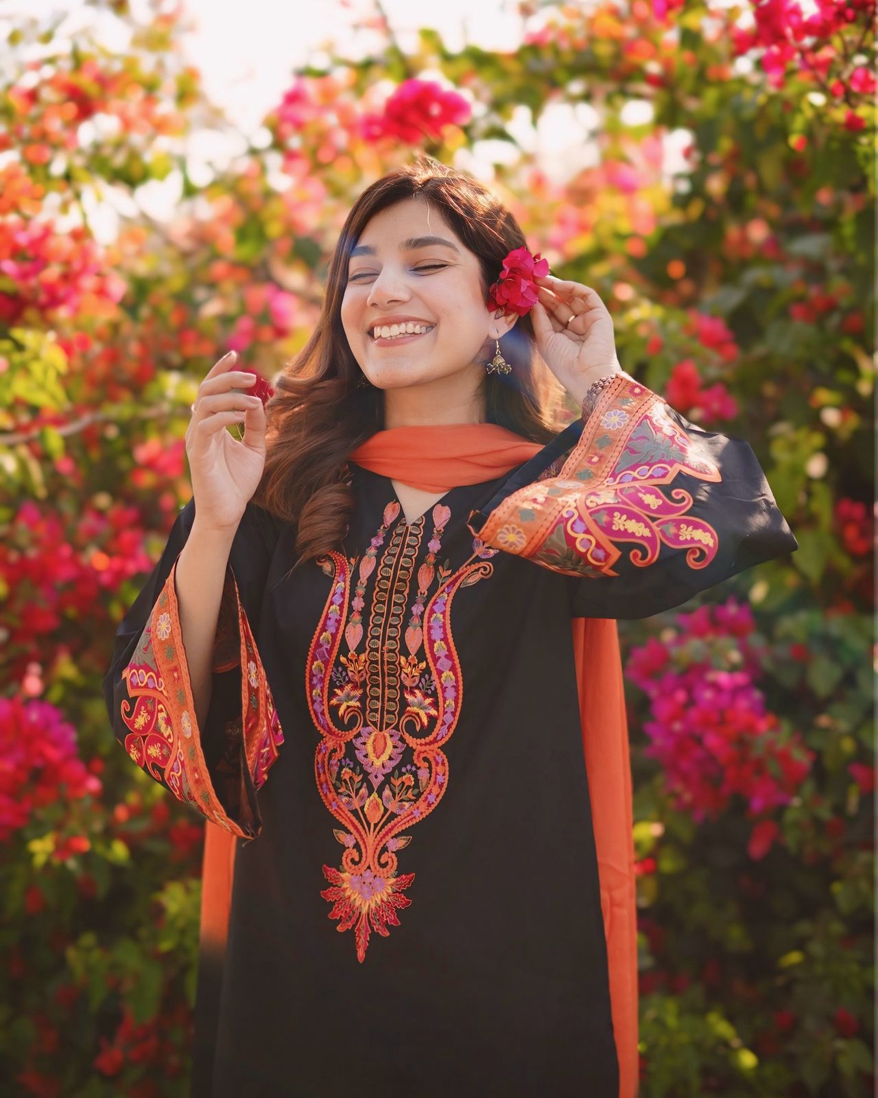 Experience elegance with our exquisite black Sahar ensemble. This eid collection piece features black - embroidered neck along with embroidered sleeves pair with double shaded chiffon dupatta.