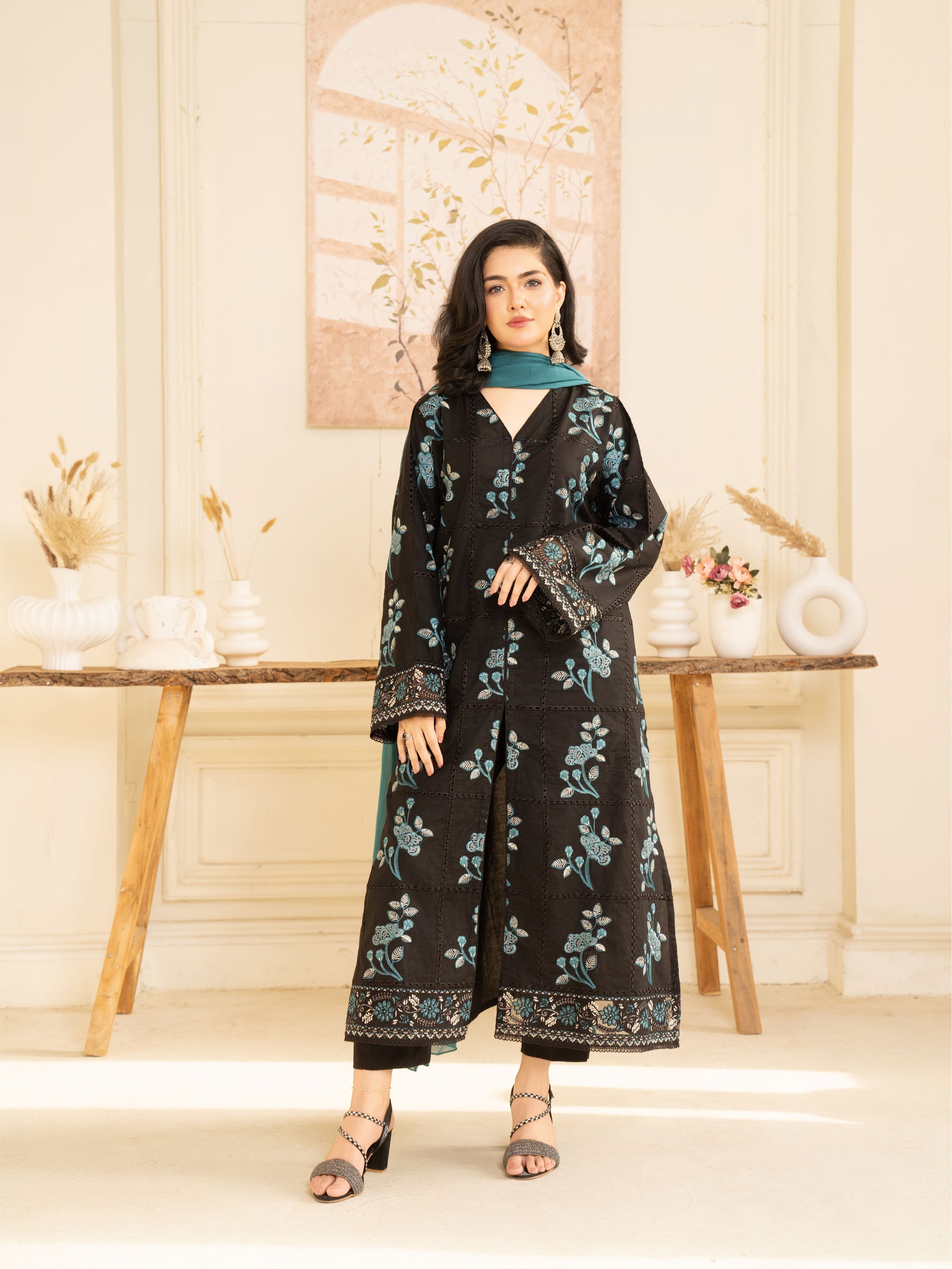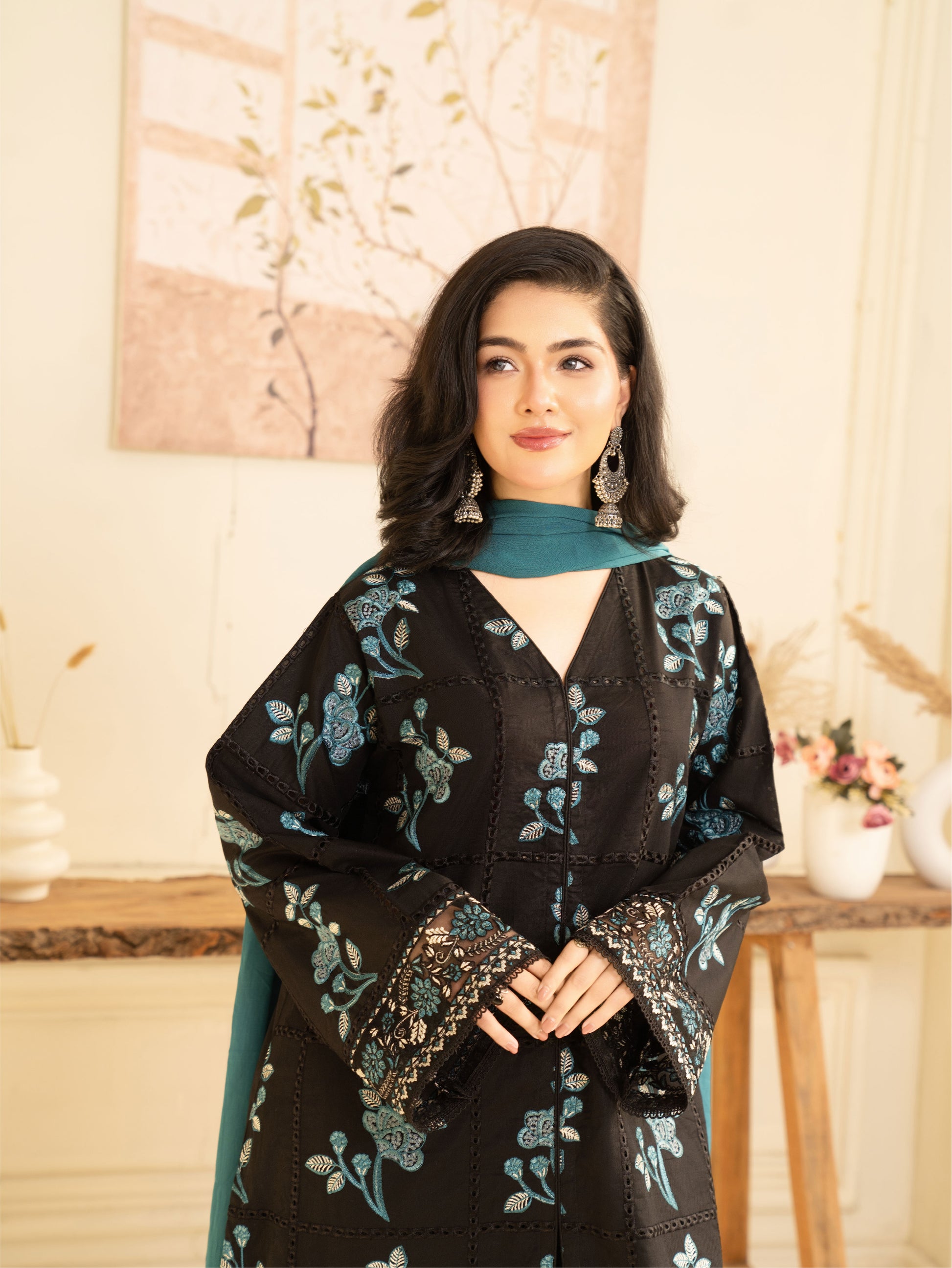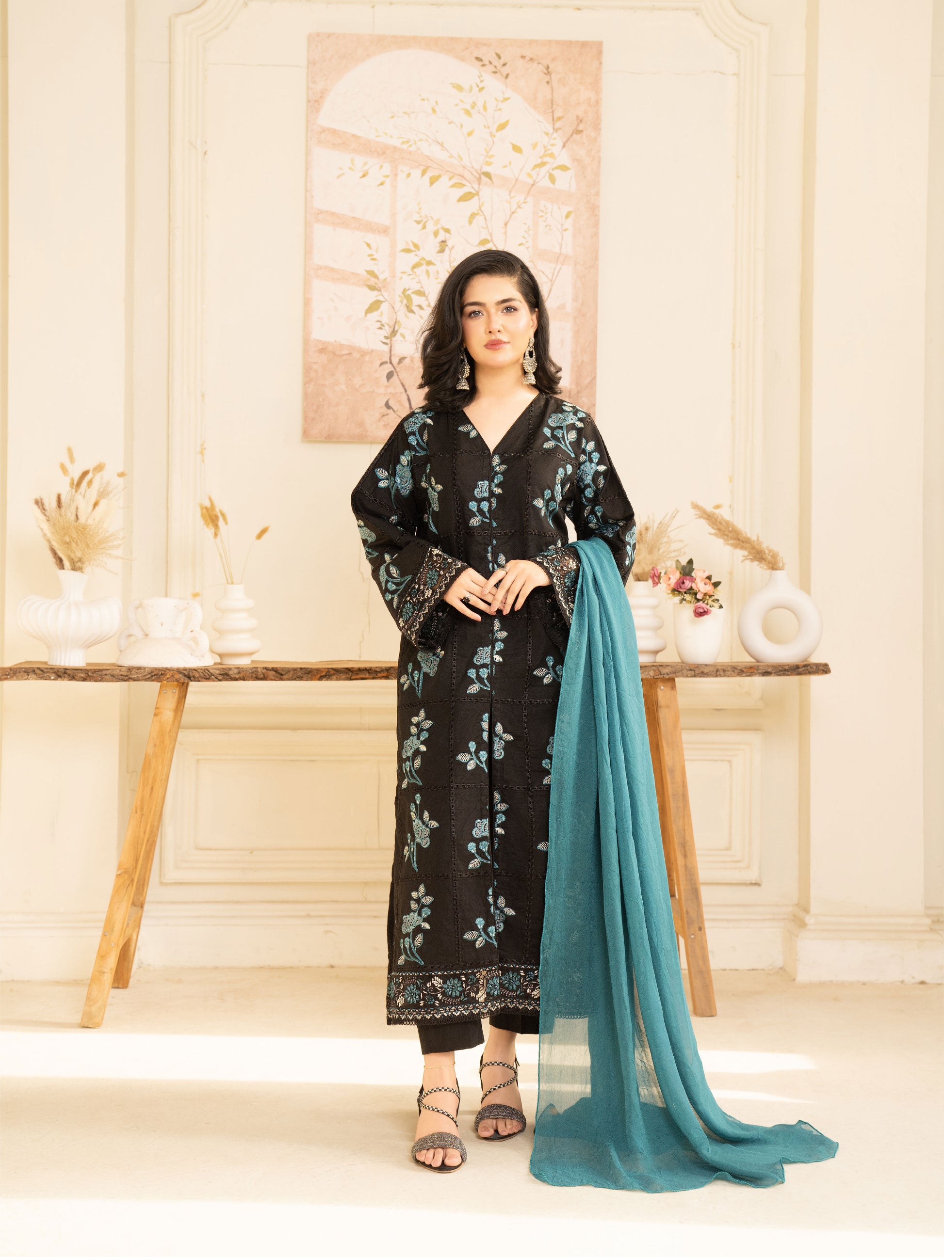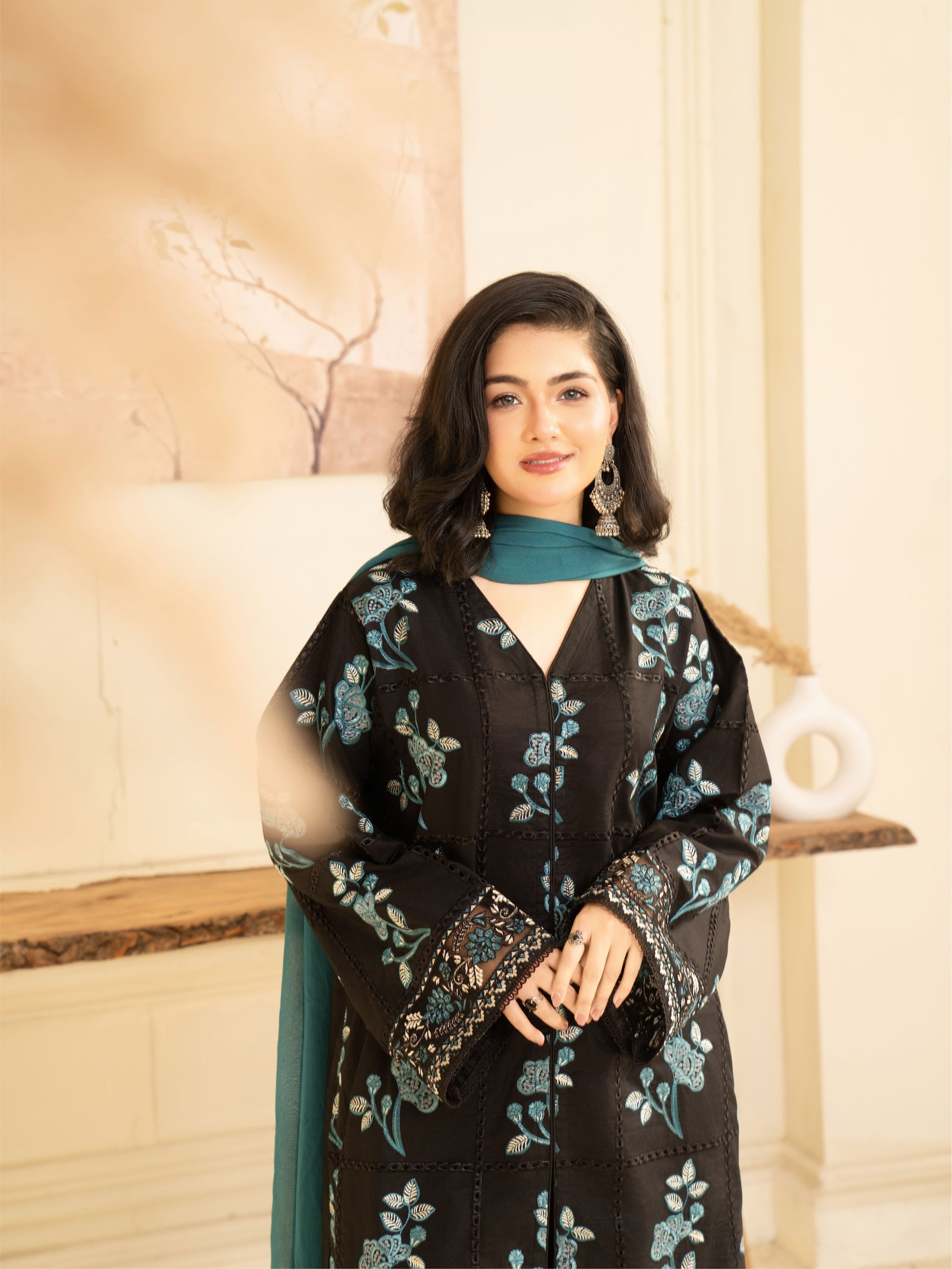 Experience elegance with our exquisite black Sahil ensemble. This outfit features a long A-line shirt with a front slit and delicate embroidery all over the front. It is paired with a plain straight pant and a flowy chiffon dupatta — a perfect blend of grace and simplicity for your festive wardrobe.