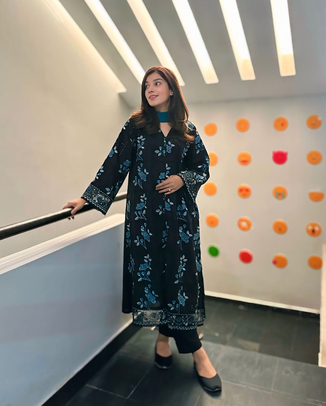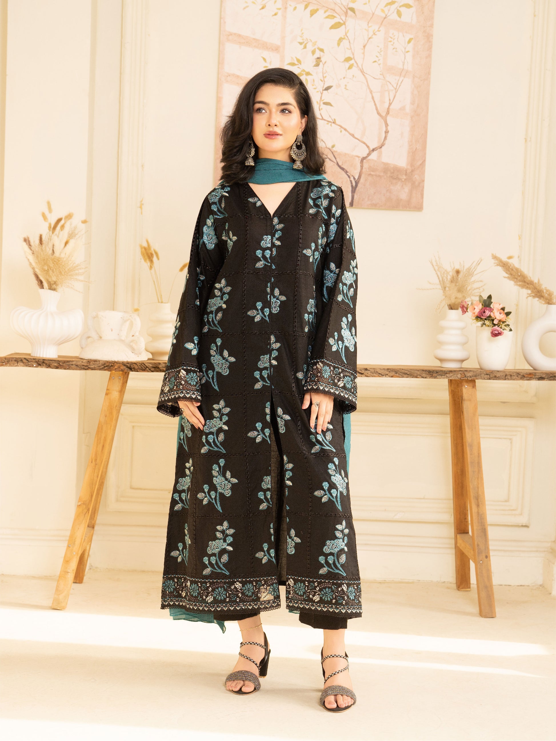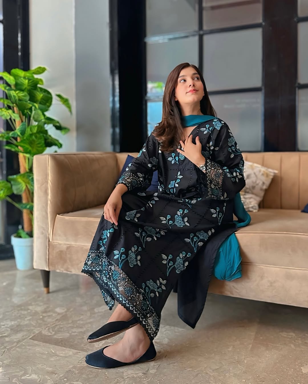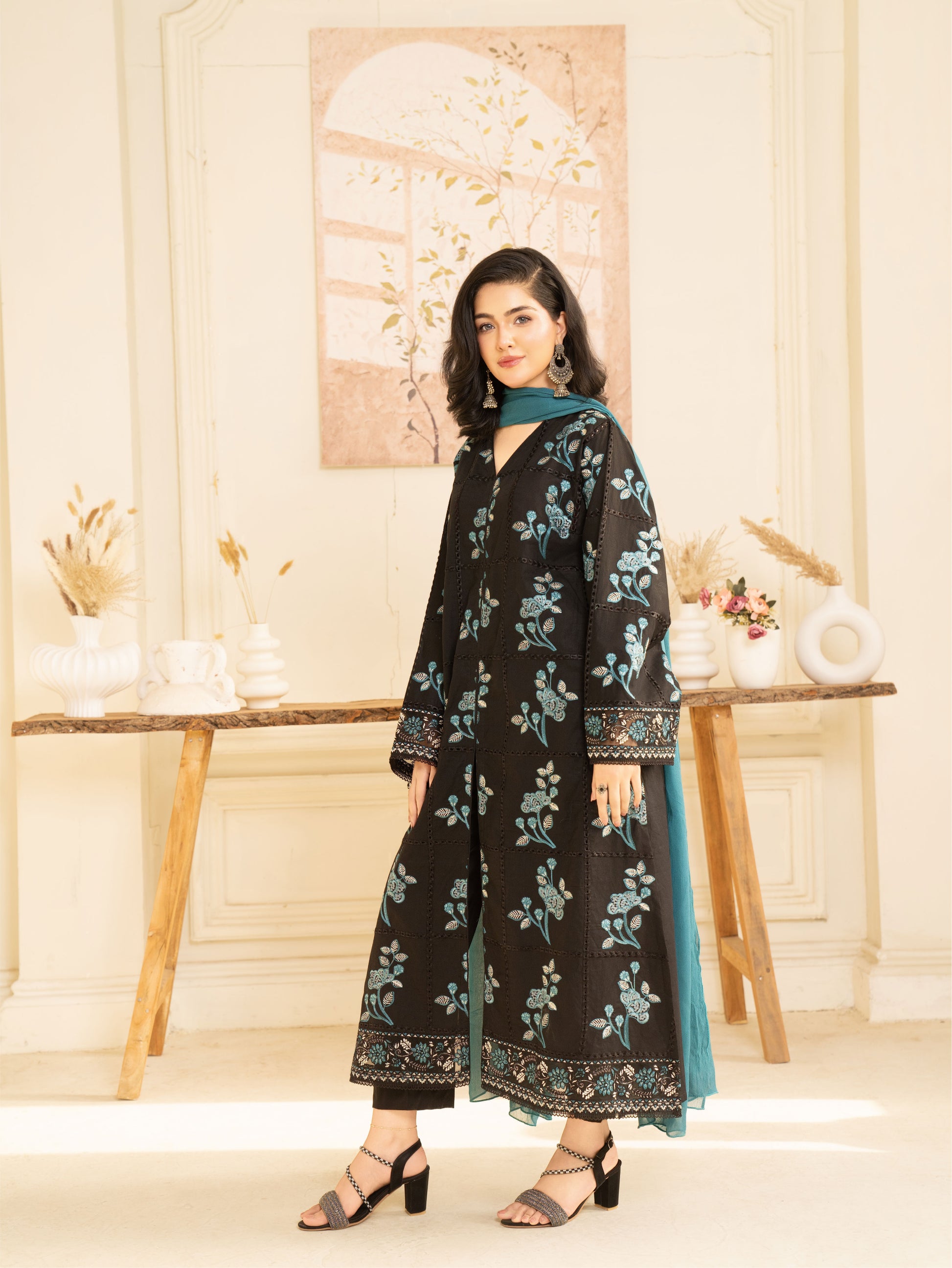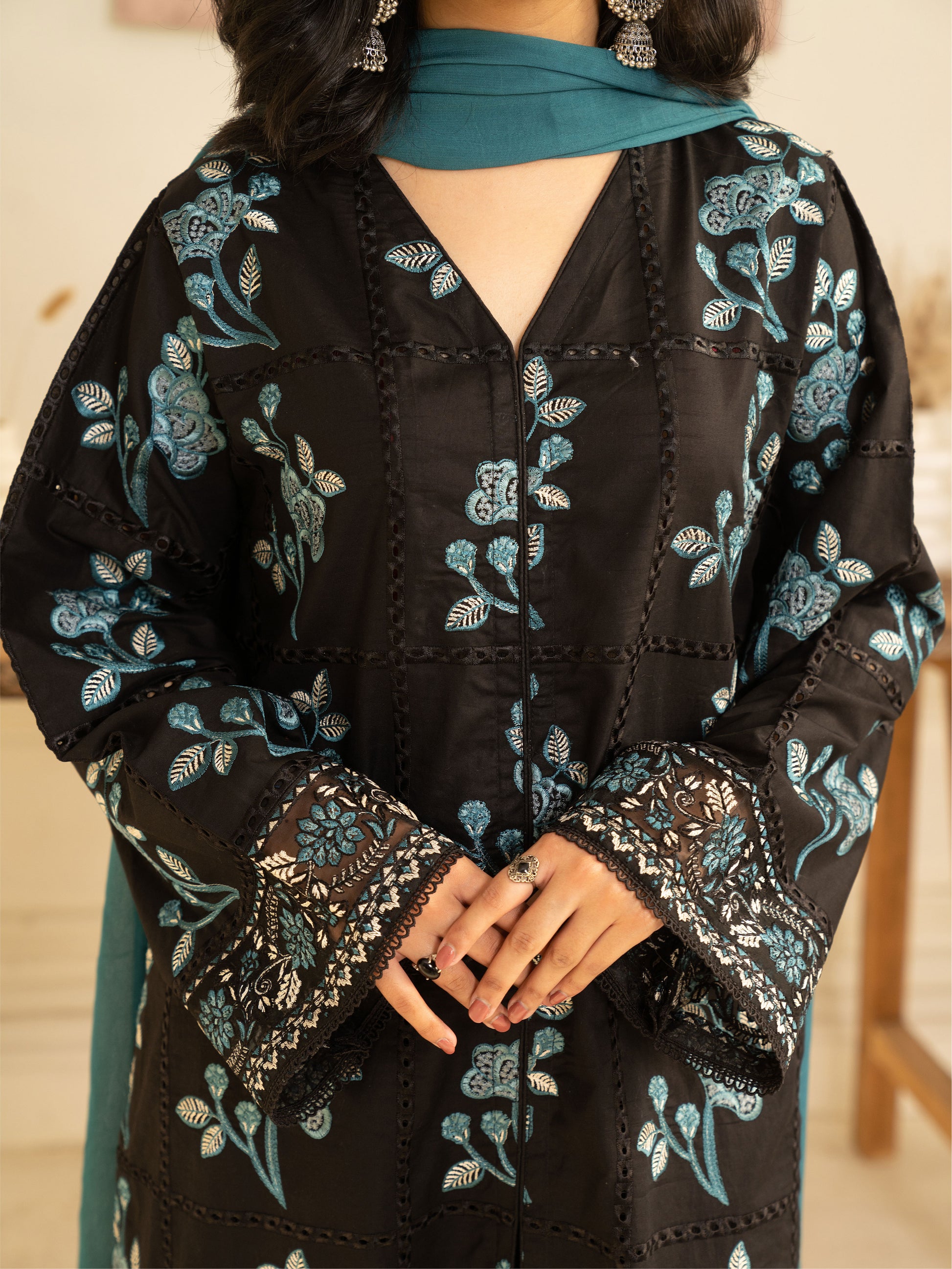 Experience elegance with our exquisite black Sahil ensemble. This outfit features a long A-line shirt with a front slit and delicate embroidery all over the front. It is paired with a plain straight pant and a flowy chiffon dupatta — a perfect blend of grace and simplicity for your festive wardrobe.