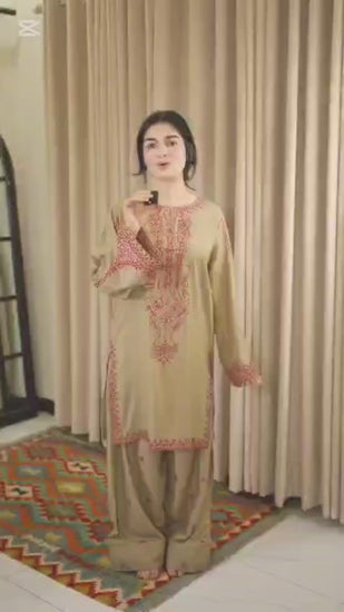 Turn heads with our captivating grey ensemble. Featuring intricate embroidery on the neckline, front and sleeves, paired with embroidered farshi shalwar. The look is elevated with a gracefully embroidered contrast maroon shawl.
