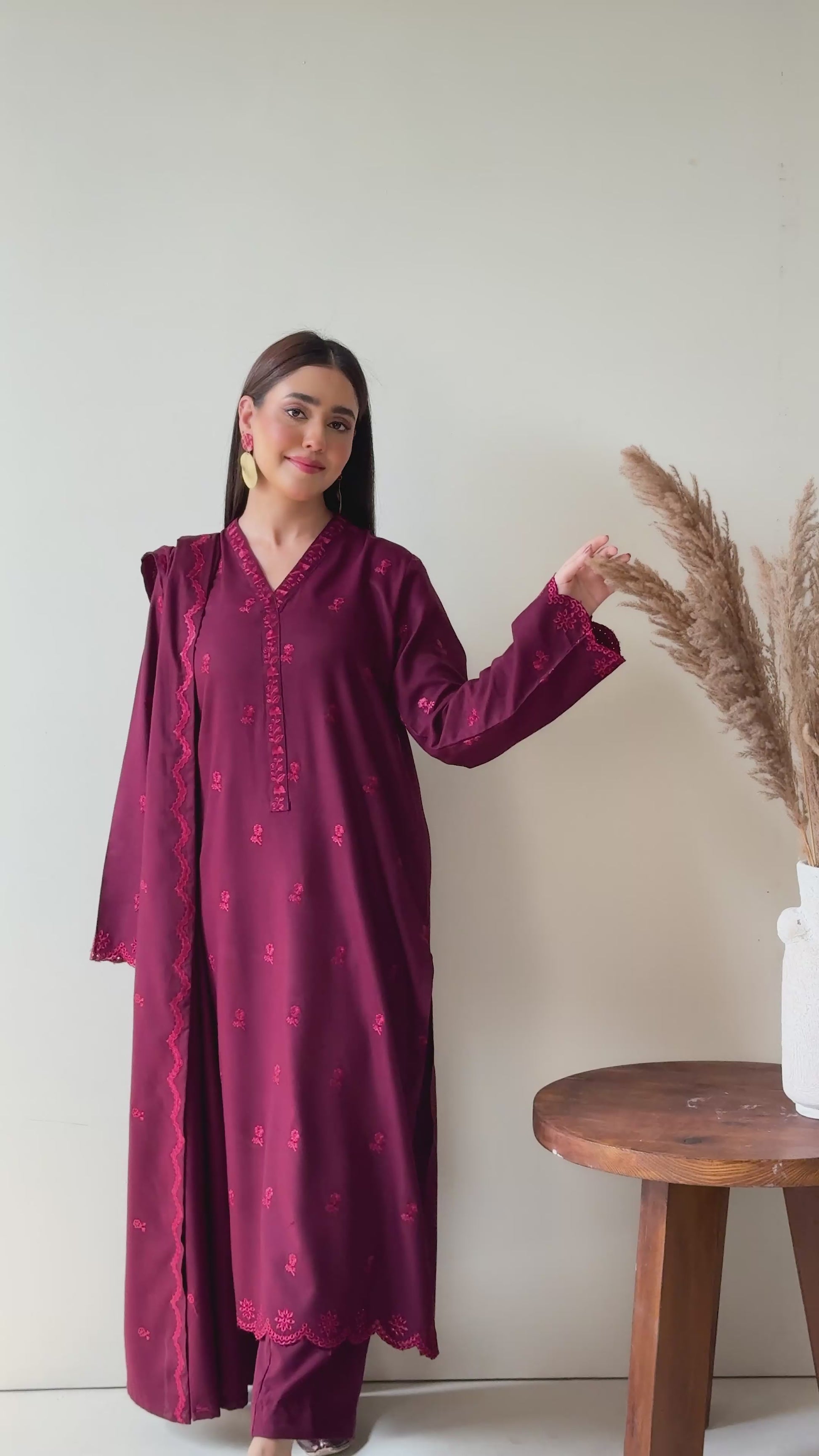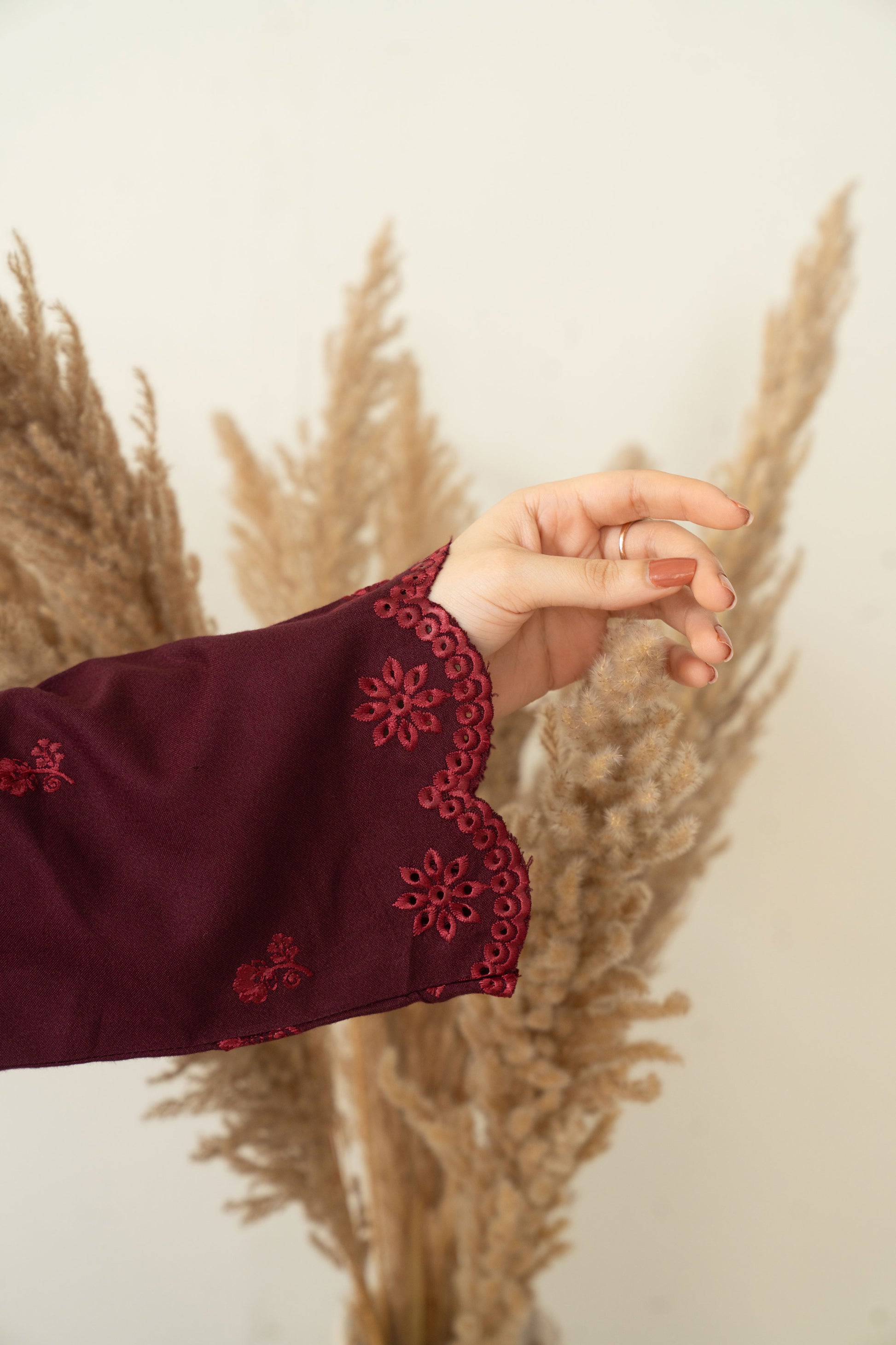 Turn heads with our captivating deep maroon ensemble. Featuring intricate embroidery on the neckline, front and sleeves, this outfit exudes timeless charm. The look is elevated with a gracefully embroidered marina shawl, perfect for any ocassion.