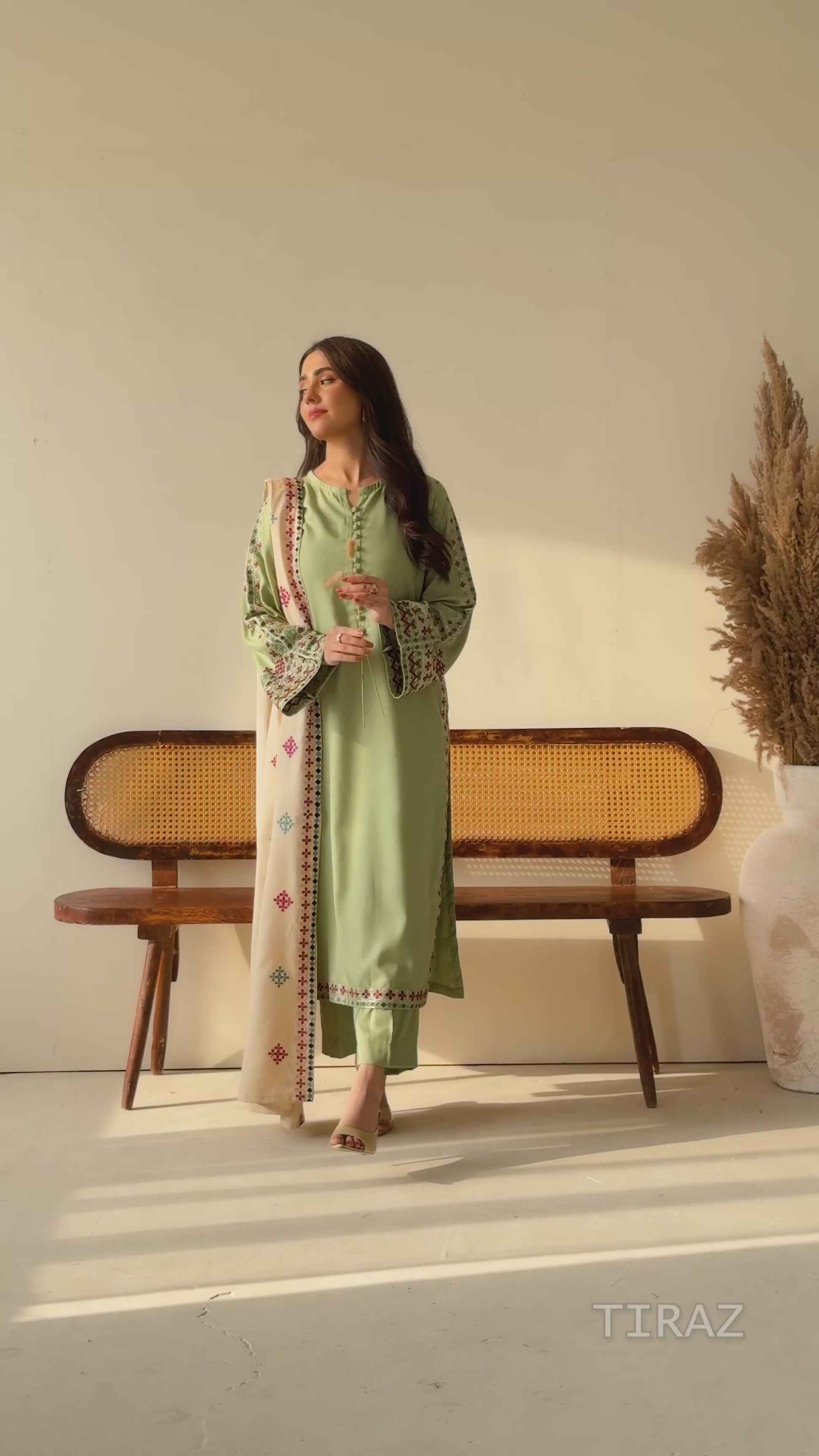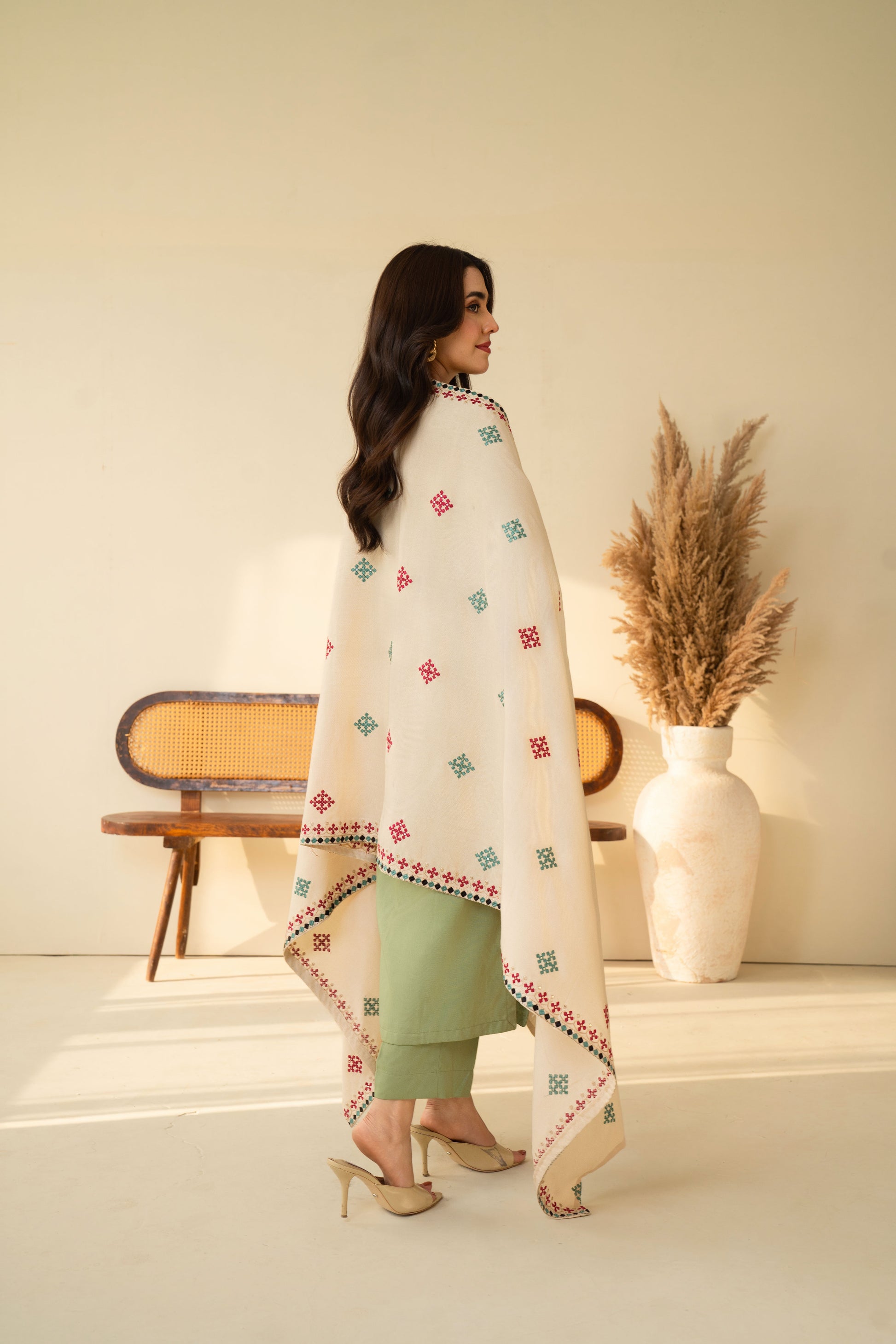 Step into effortless elegance with our sophisticated Sage Green a ensemble. This timeless outfit features refined embroidery on the sleeves, daman and side slits of the shirt and paired with a contrast skin embroidered shawl that adds a touch of understated luxury.