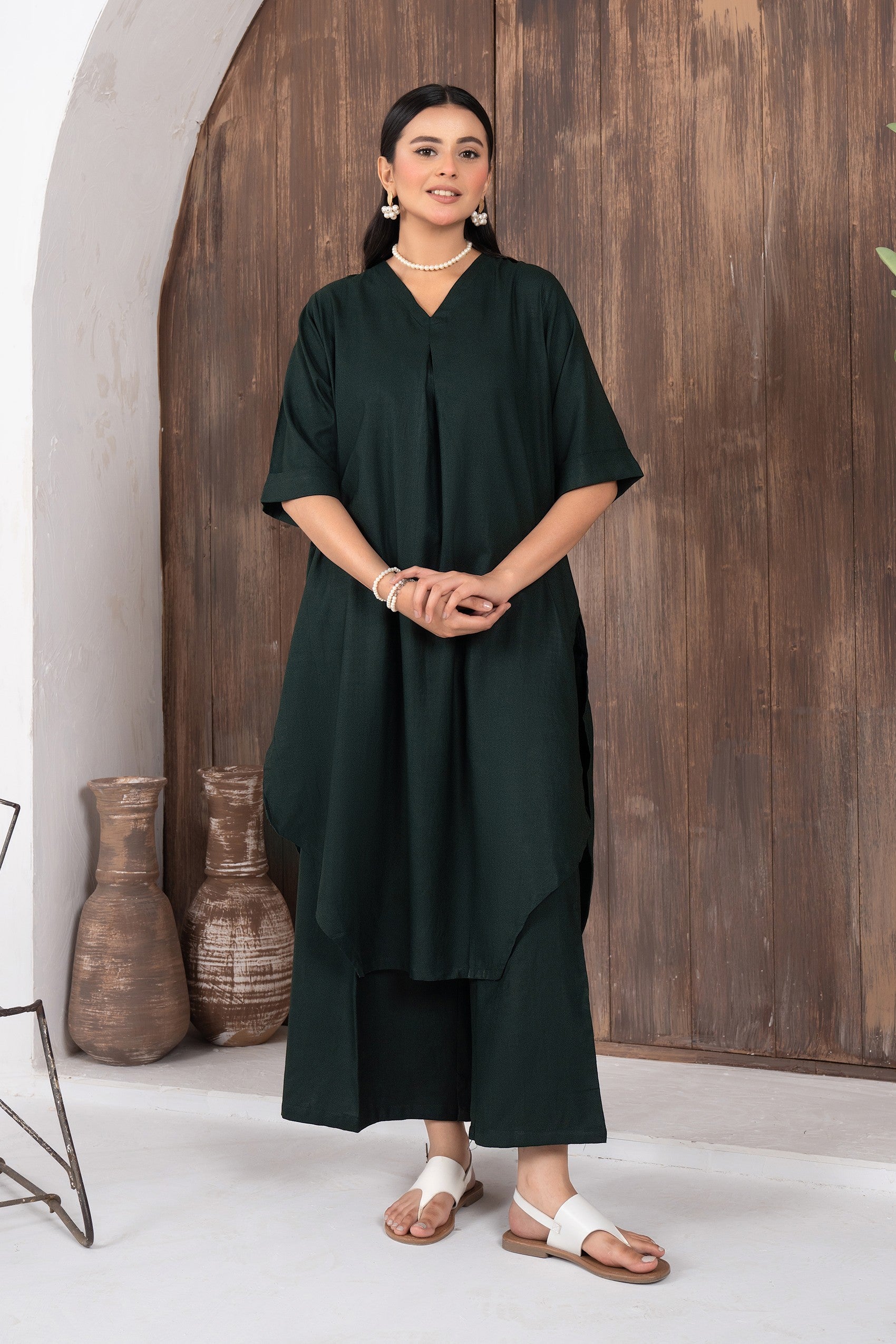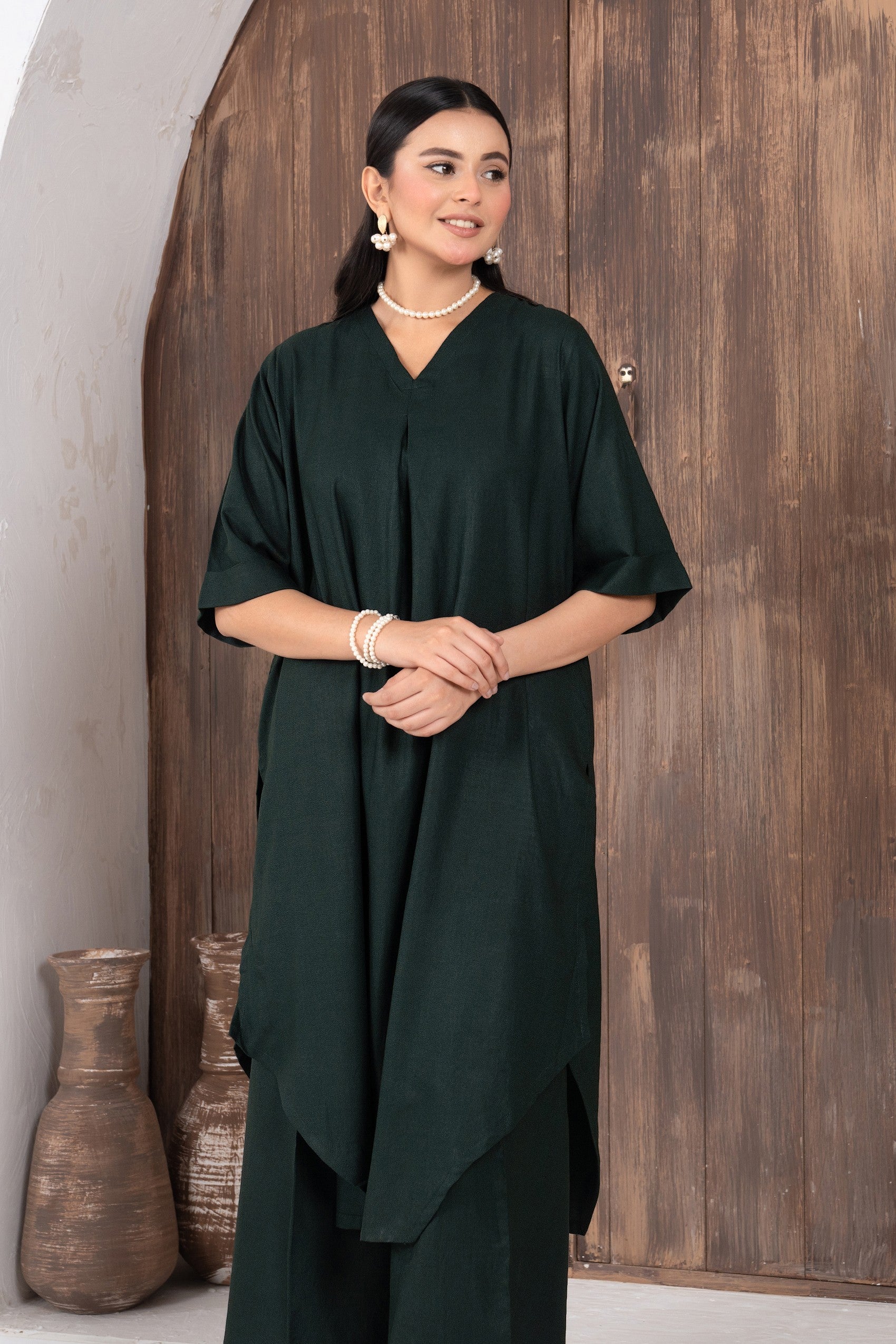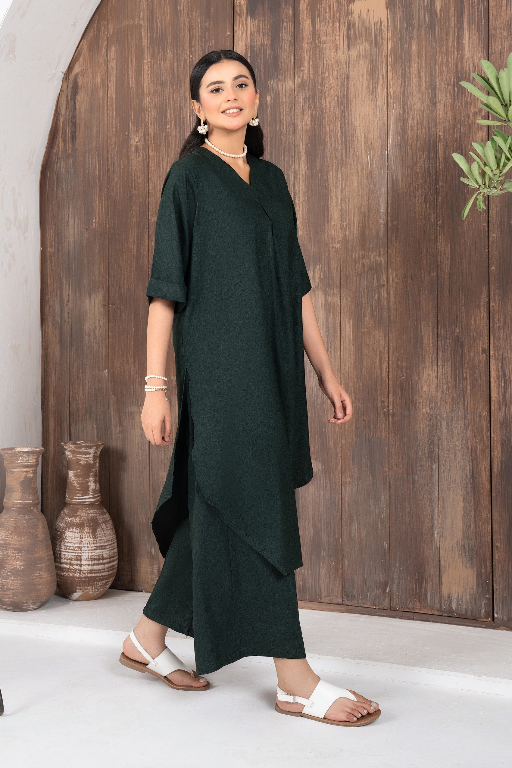This elegant ensemble features asymmetrical hemline paired with wide-leg trousers, creating a harmonious blend of comfort and style. The shirt has a soft V-neckline and a flattering loose silhouette. Crafted from lightweight fabric, the dress offers a relaxed fit, making it perfect for casual occasions.
