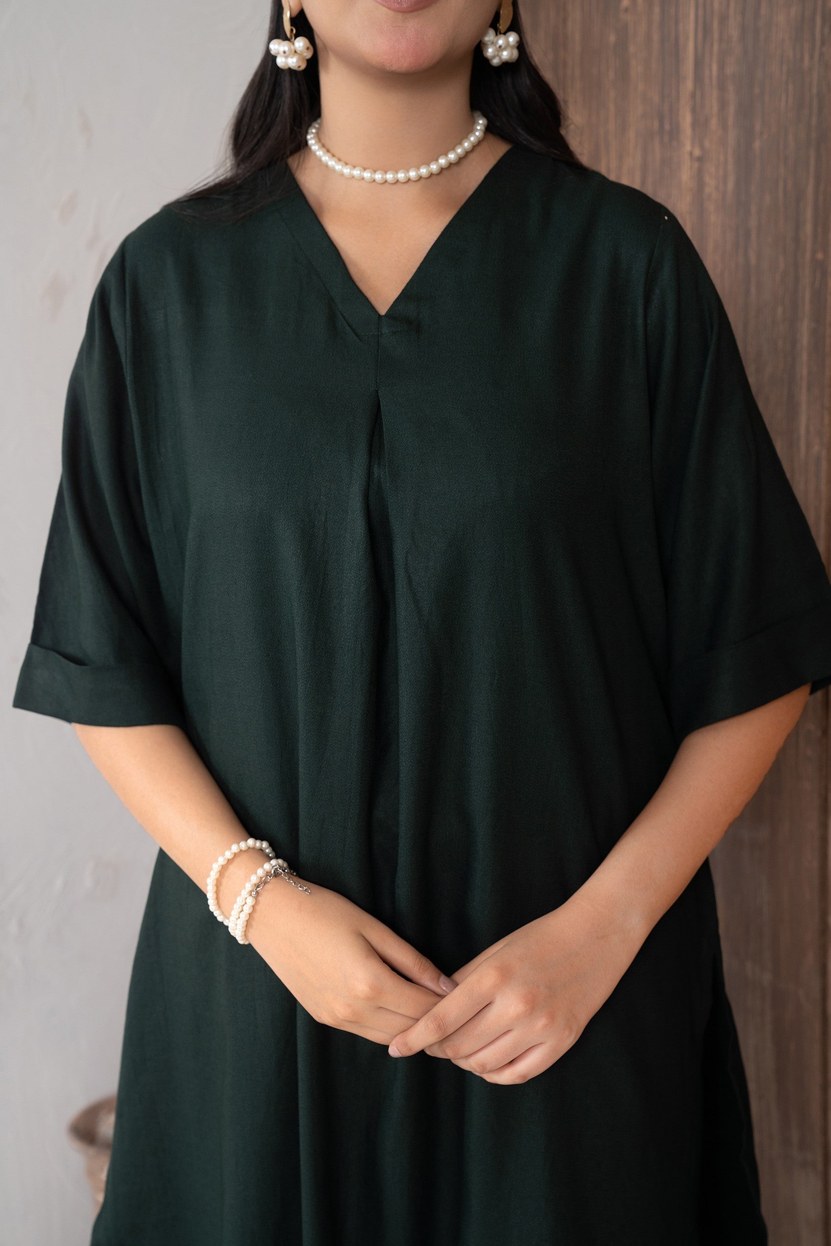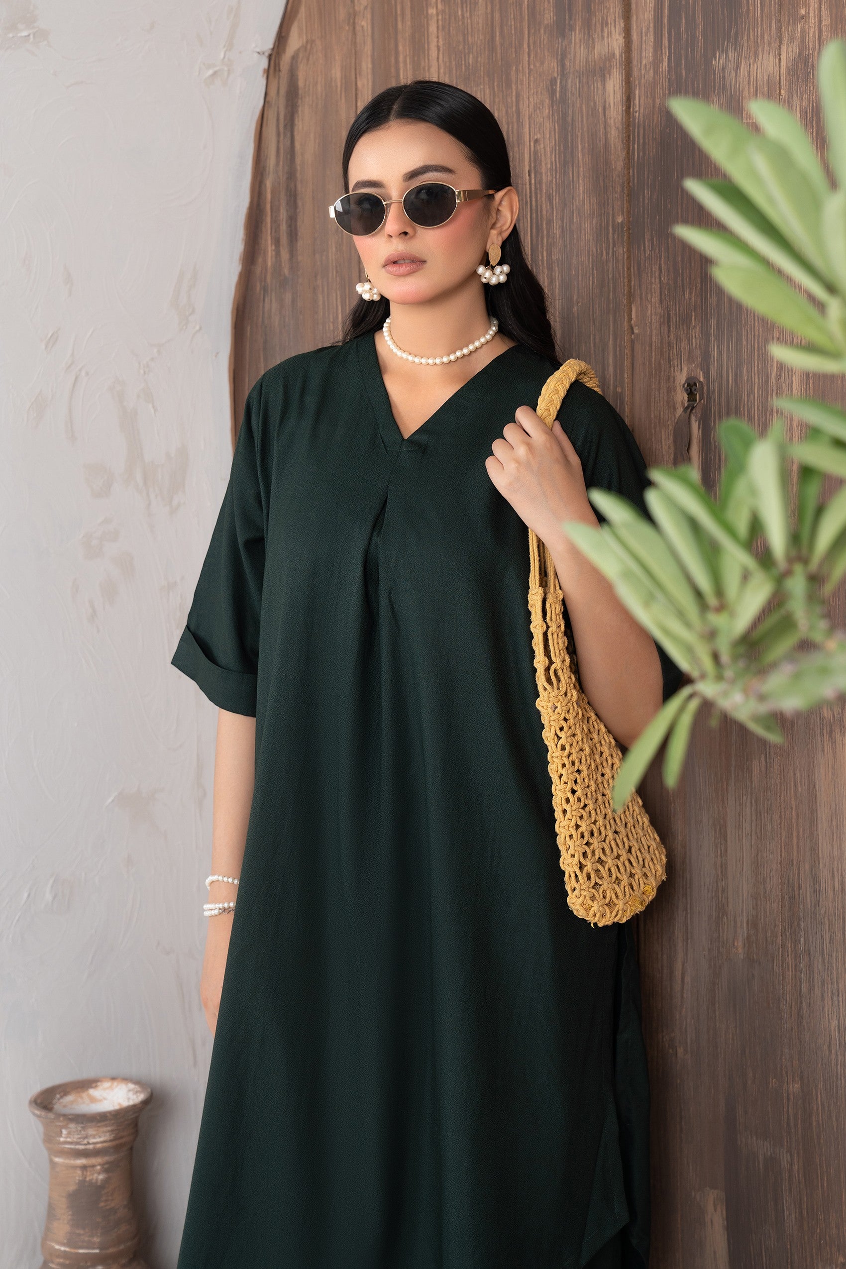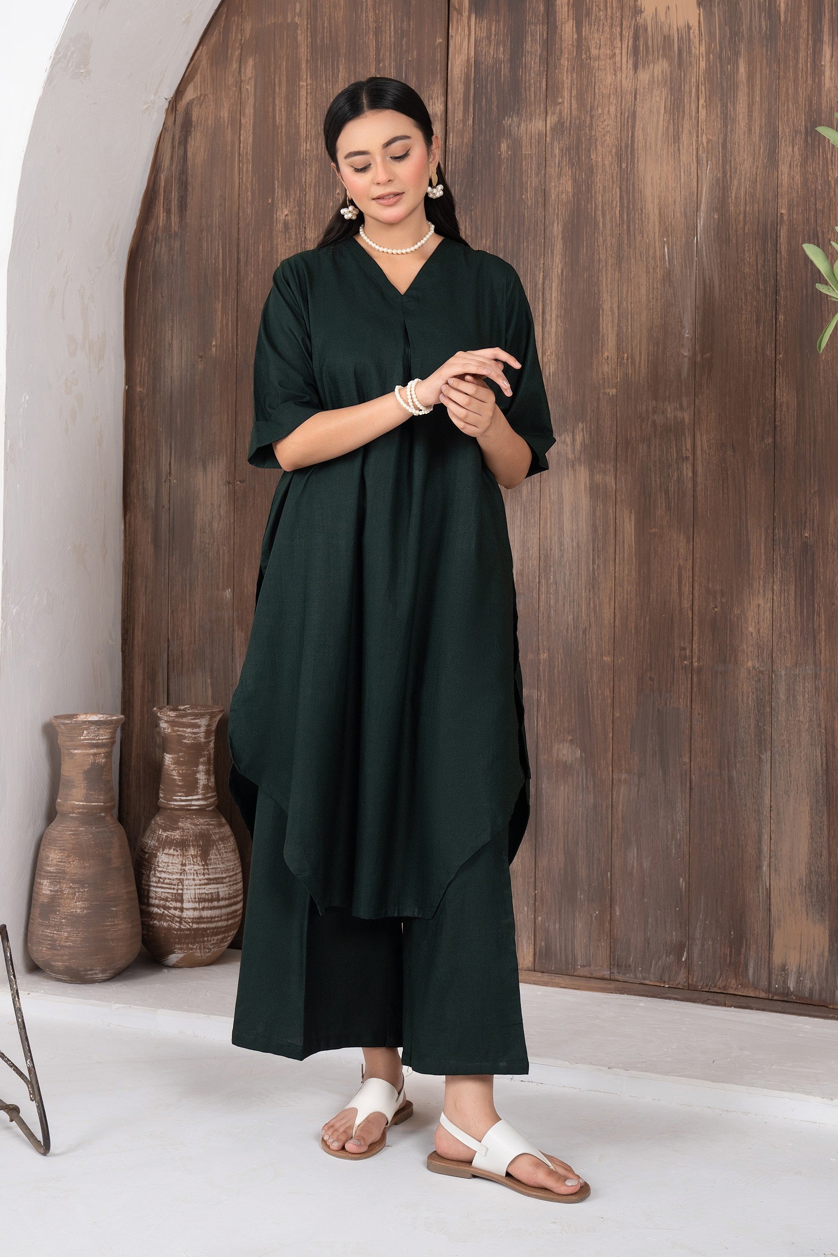 This elegant ensemble features asymmetrical hemline paired with wide-leg trousers, creating a harmonious blend of comfort and style. The shirt has a soft V-neckline and a flattering loose silhouette. Crafted from lightweight fabric, the dress offers a relaxed fit, making it perfect for casual occasions.