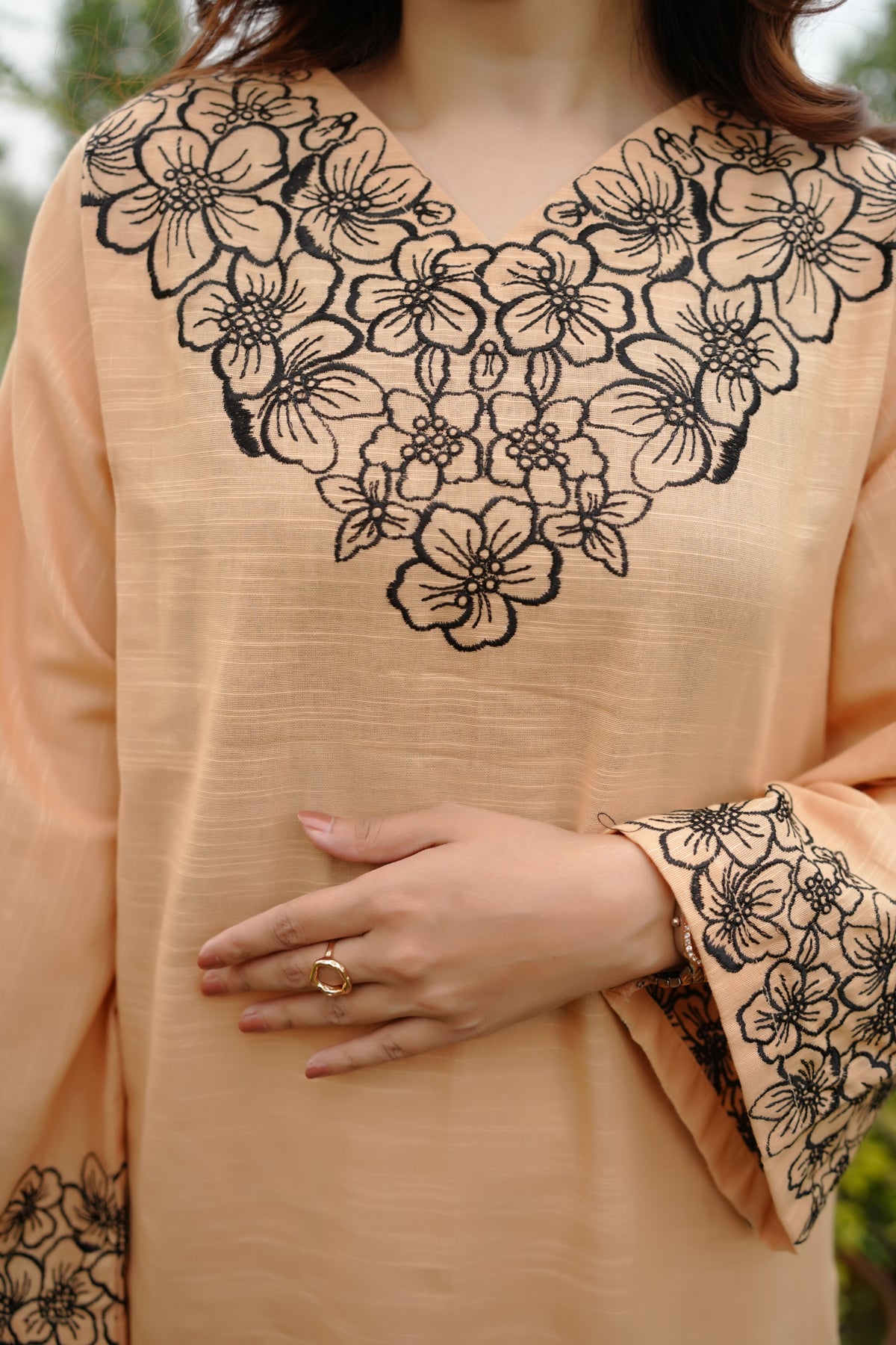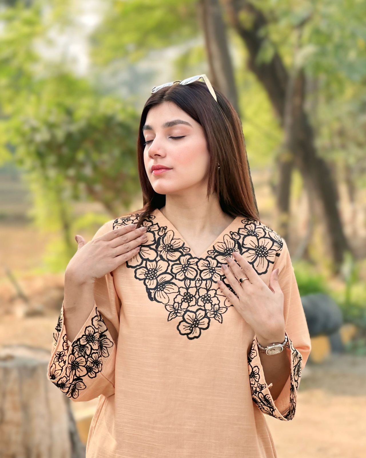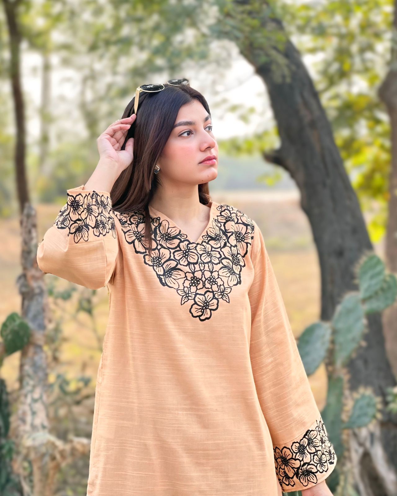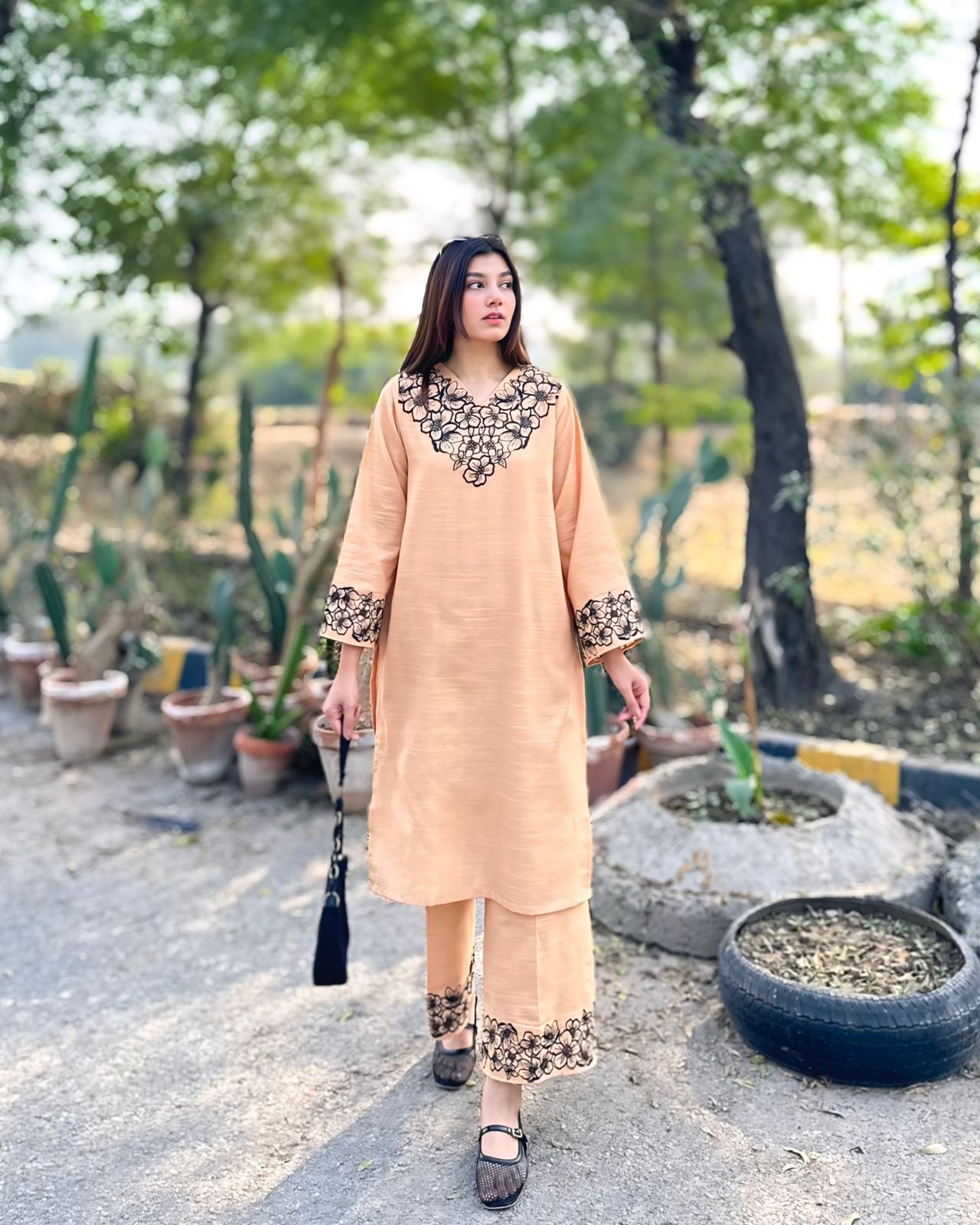 This beige two-piece set is a stunning blend of traditional elegance and modern design. The Slub Khadar fabric brings a subtle texture to the embroidered long shirt, which is perfectly complemented by the straight trousers. This versatile outfit is ideal for both casual and formal settings, offering a blend of comfort and sophistication.