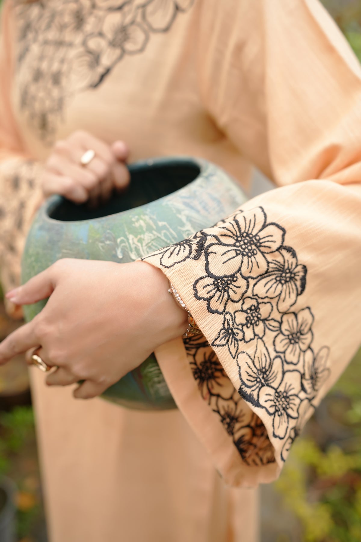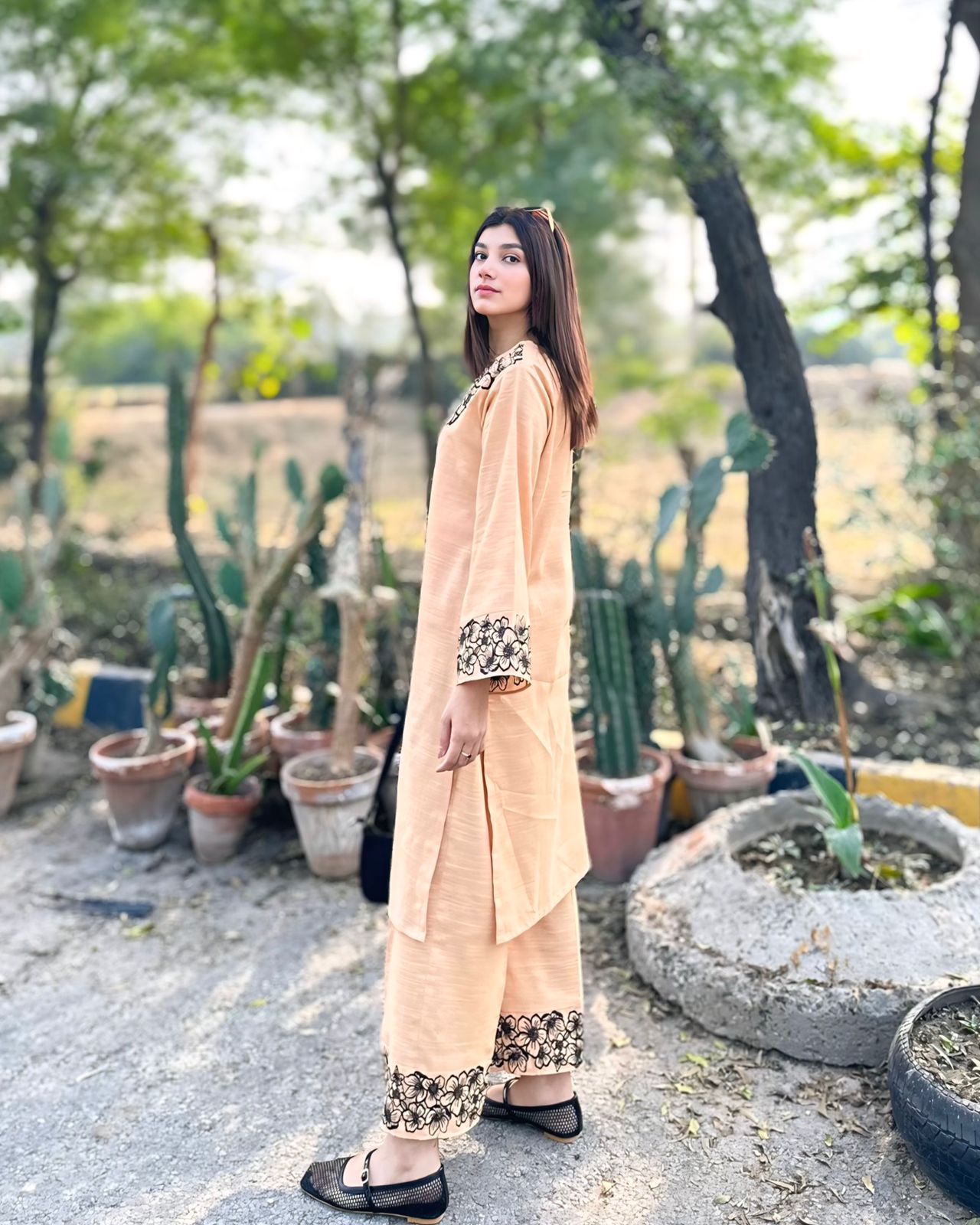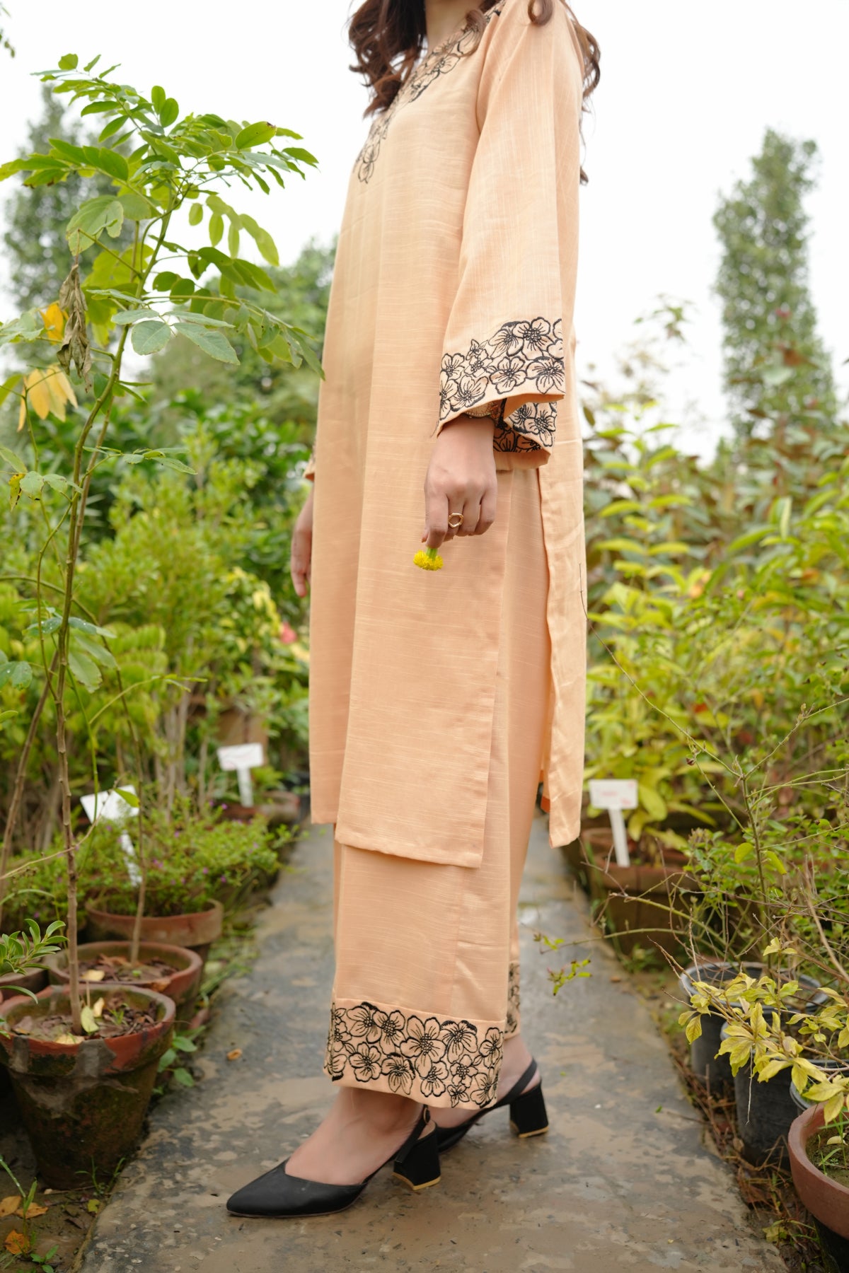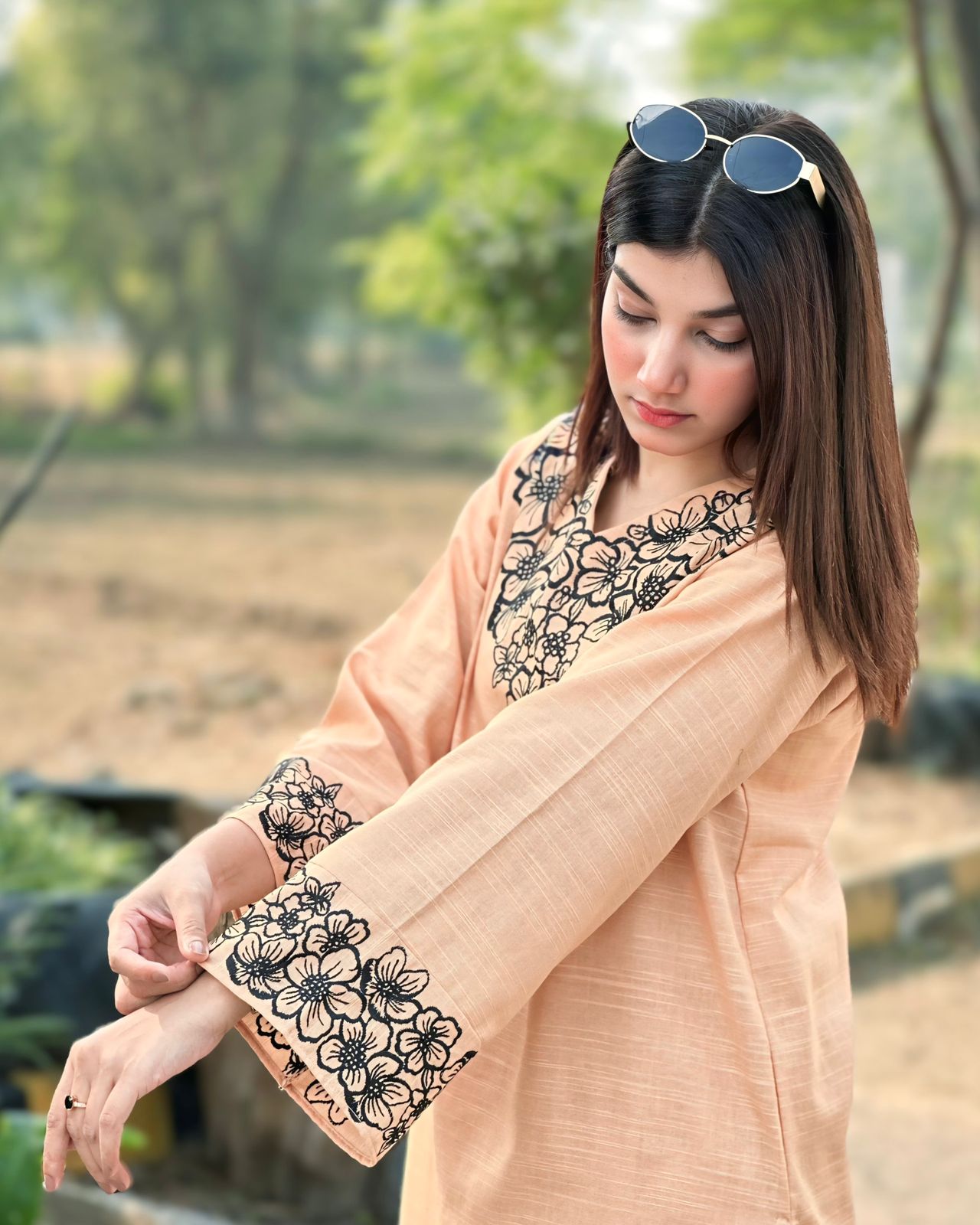 This beige two-piece set is a stunning blend of traditional elegance and modern design. The Slub Khadar fabric brings a subtle texture to the embroidered long shirt, which is perfectly complemented by the straight trousers. This versatile outfit is ideal for both casual and formal settings, offering a blend of comfort and sophistication.
