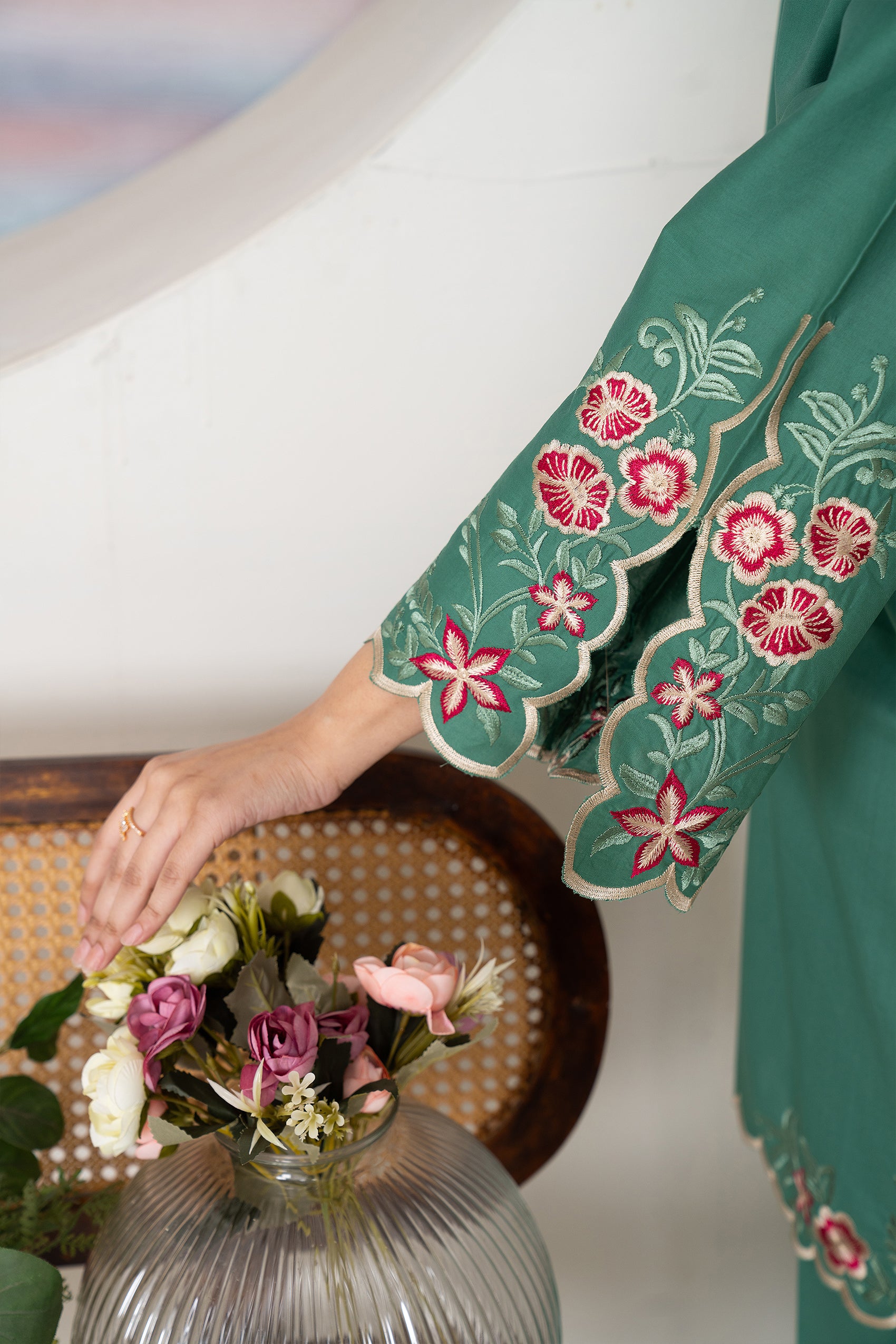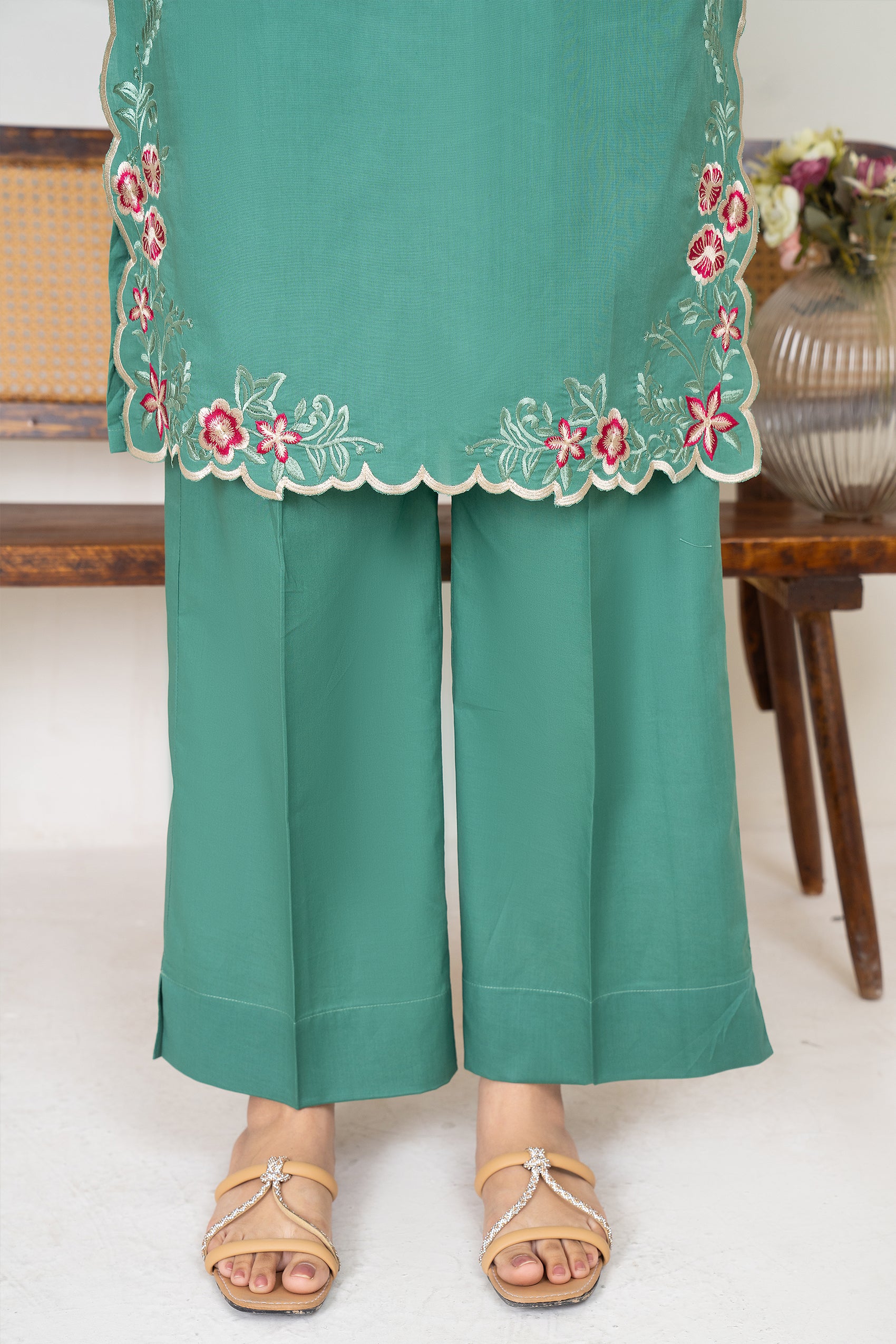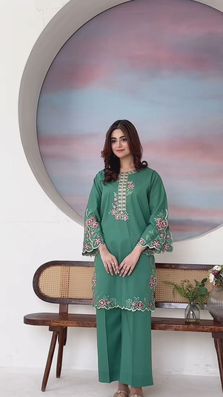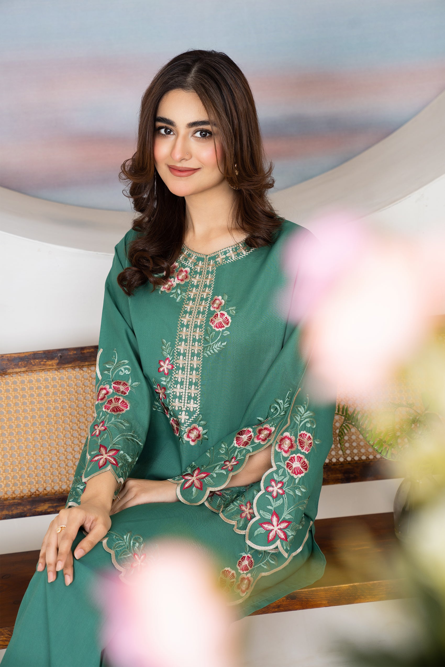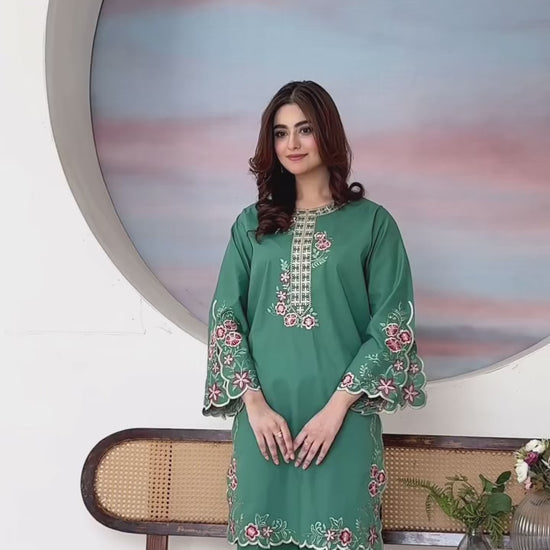 Experience elegance with our exquisite sage green Zebaish ensemble. This summer collection piece features sage green - embroidery shirt with beautiful cutwork on daman and sleeves.