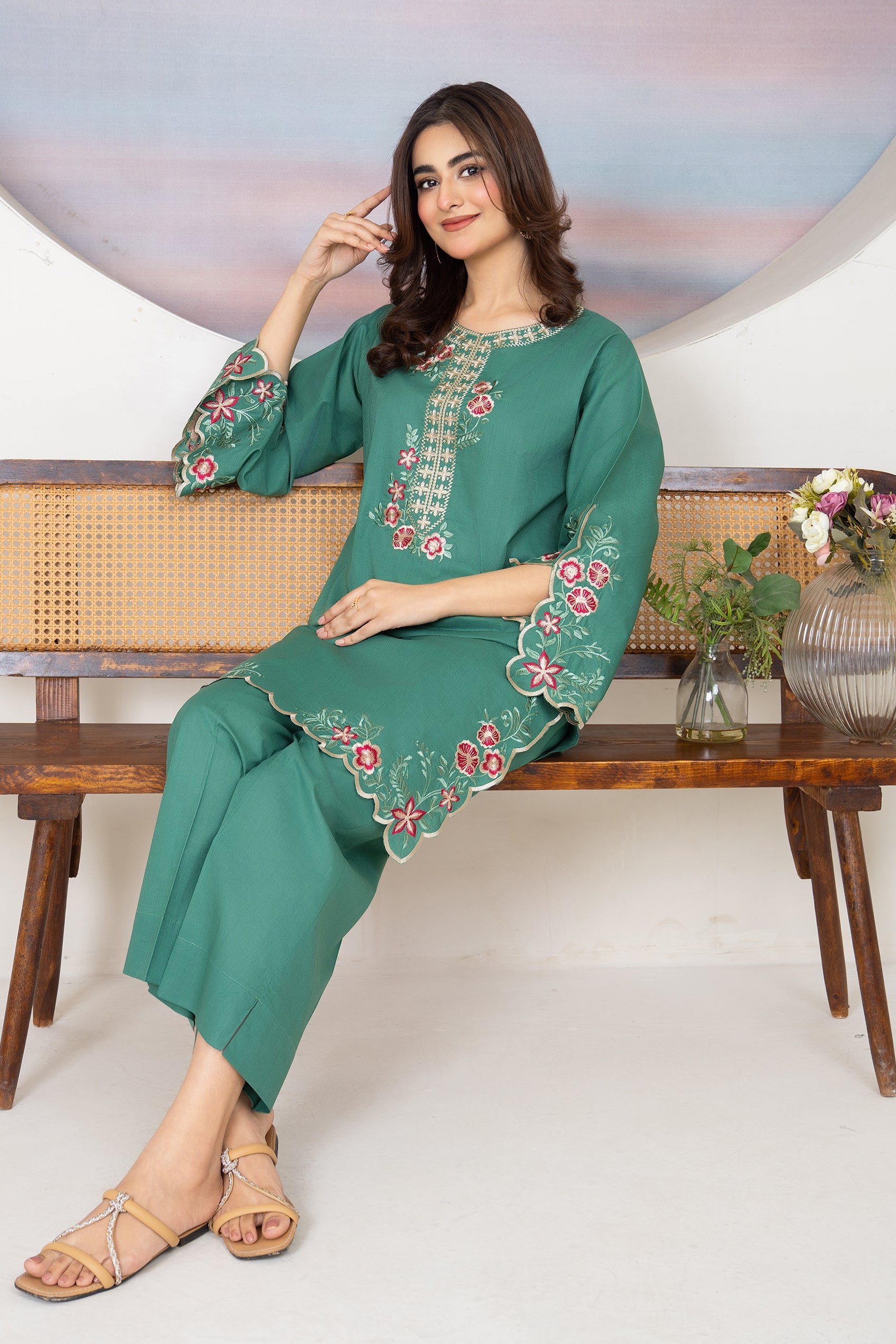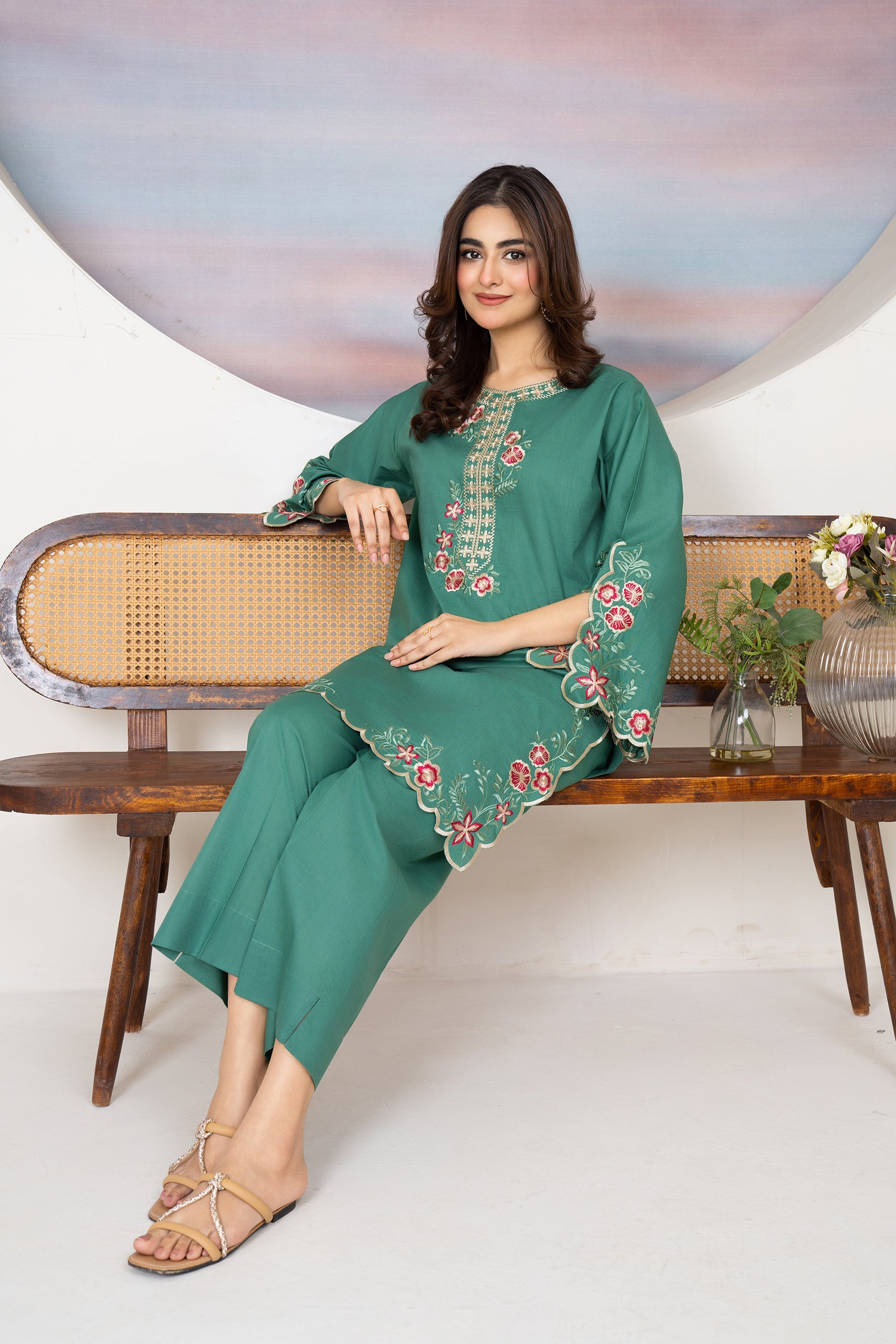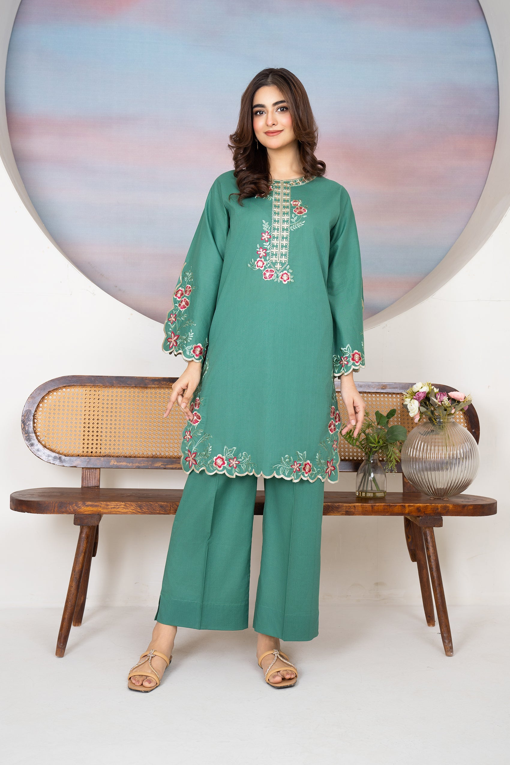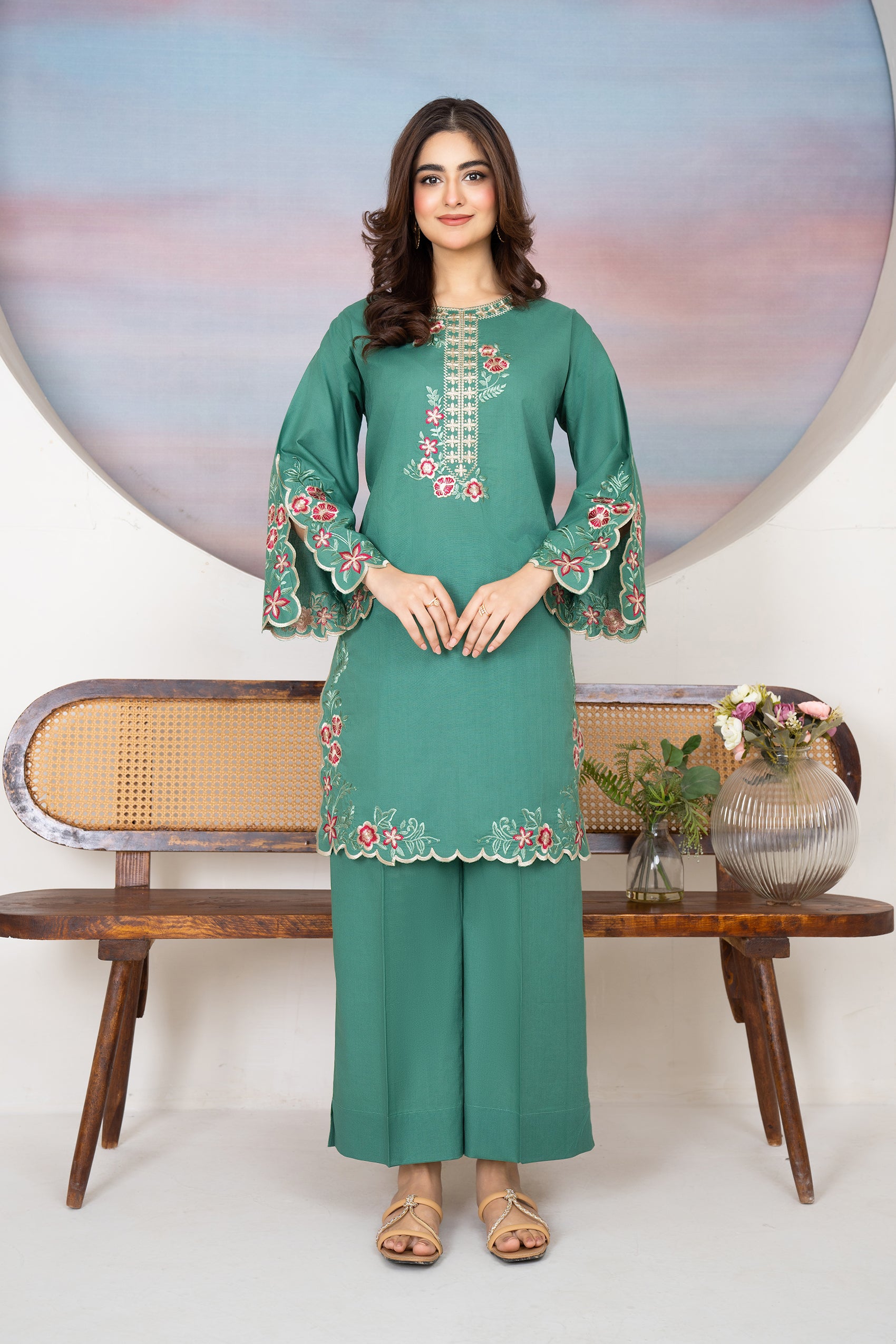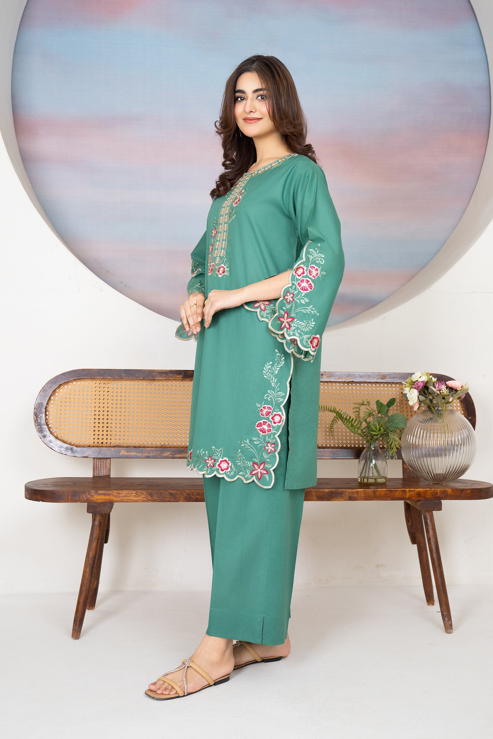 Experience elegance with our exquisite sage green Zebaish ensemble. This summer collection piece features sage green - embroidery shirt with beautiful cutwork on daman and sleeves.